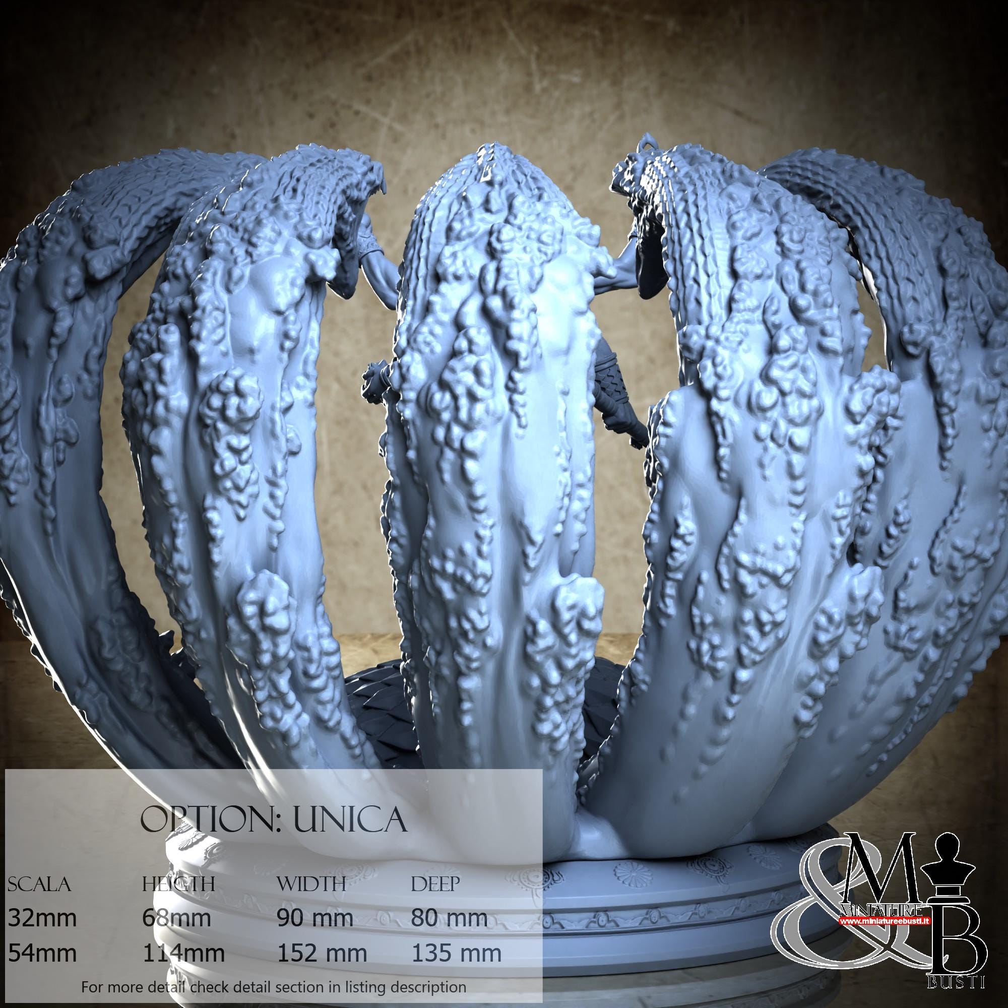 - Base (2 pieces) in Resin: Height: 37 mm, Width: 103 mm, Depth: 103 mm