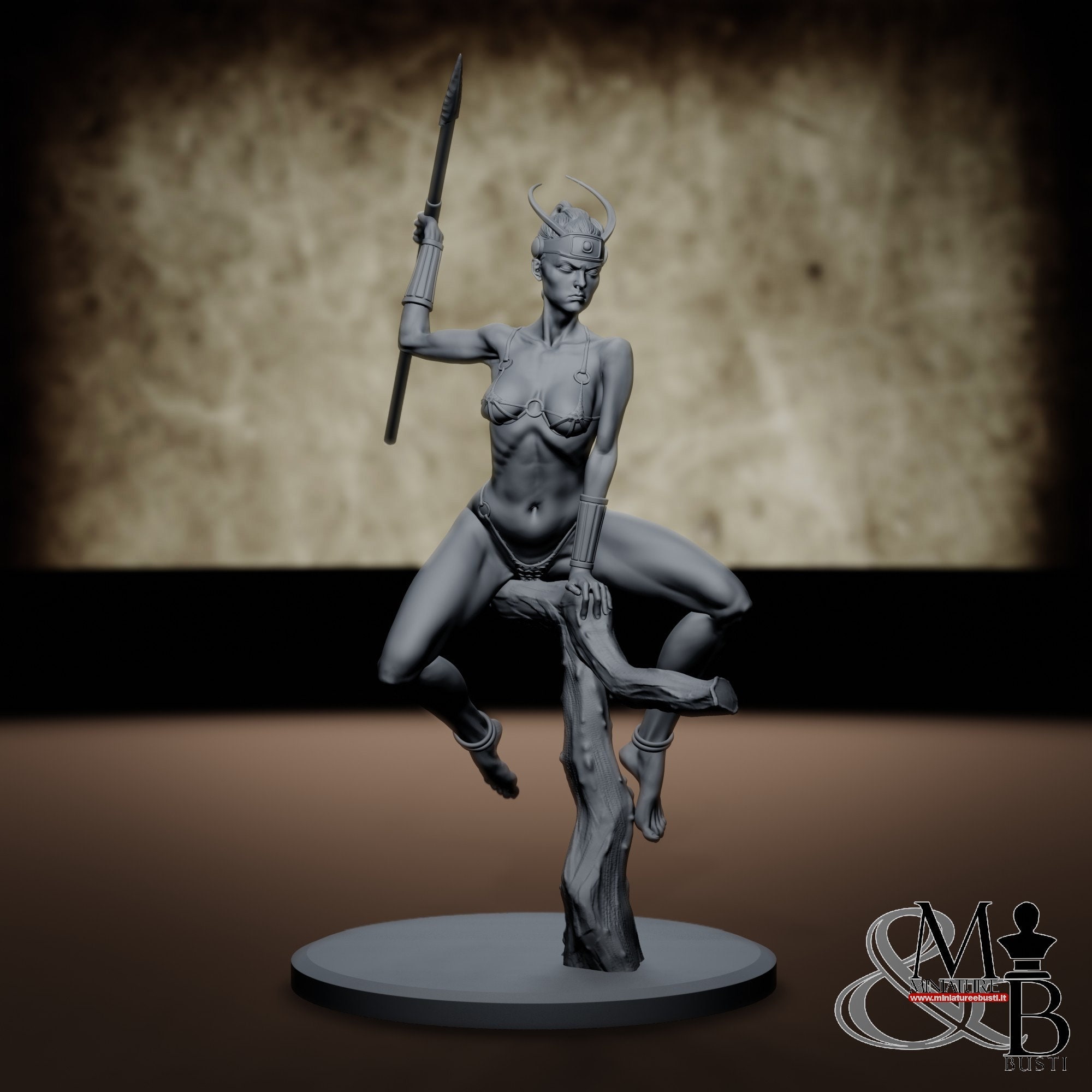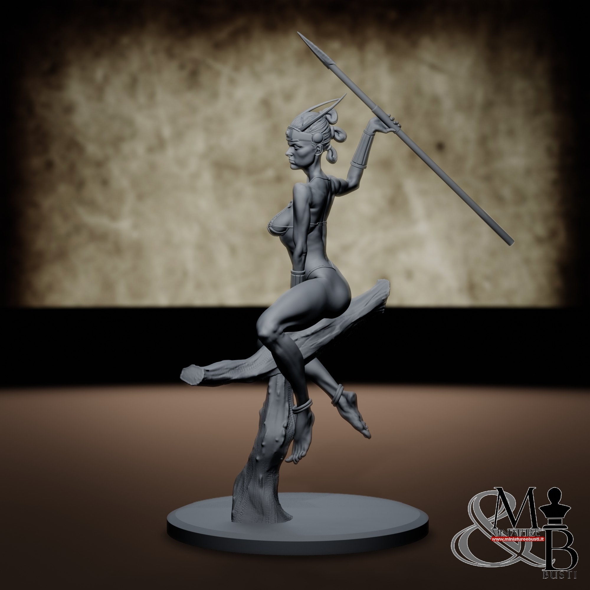 Figure of a female tribal hunter, carrying a javelin and astride a tree trunk.