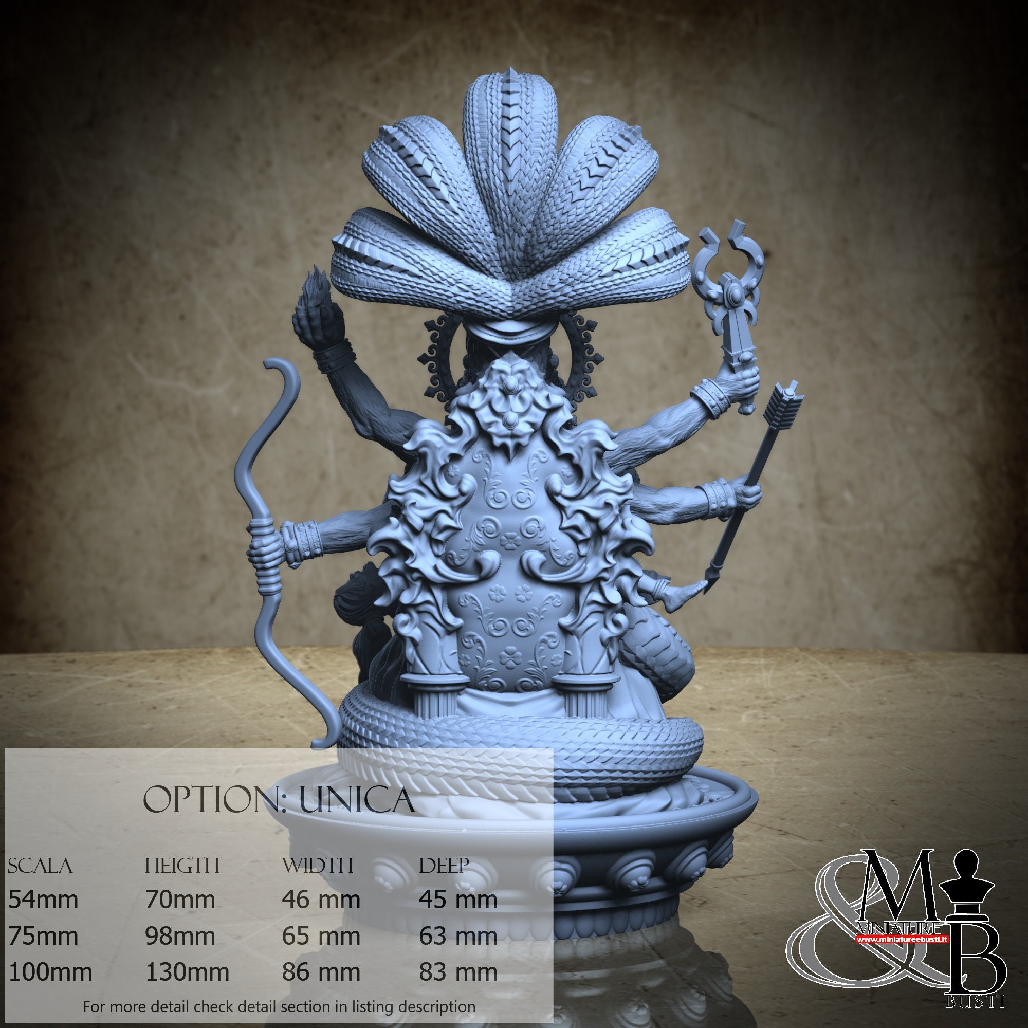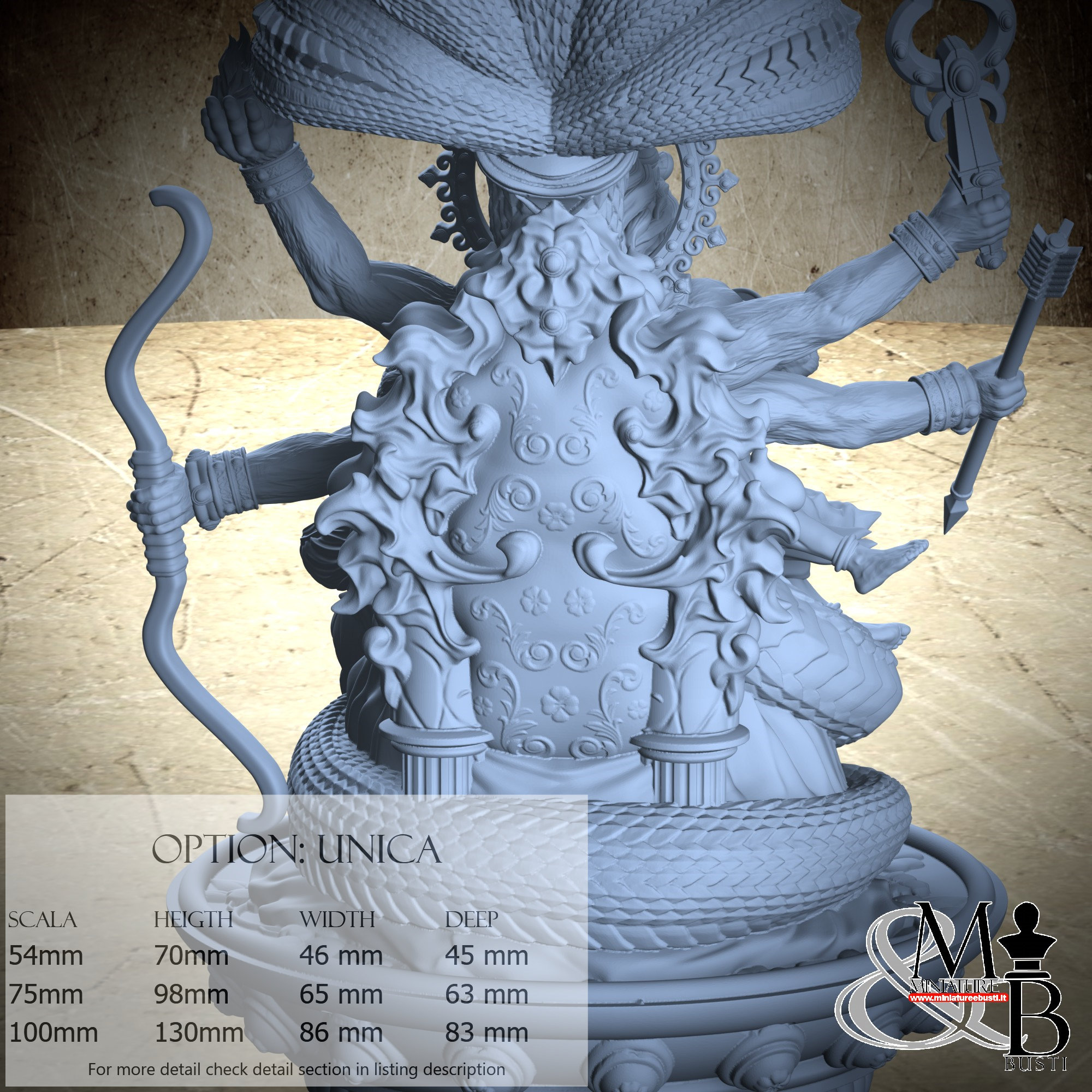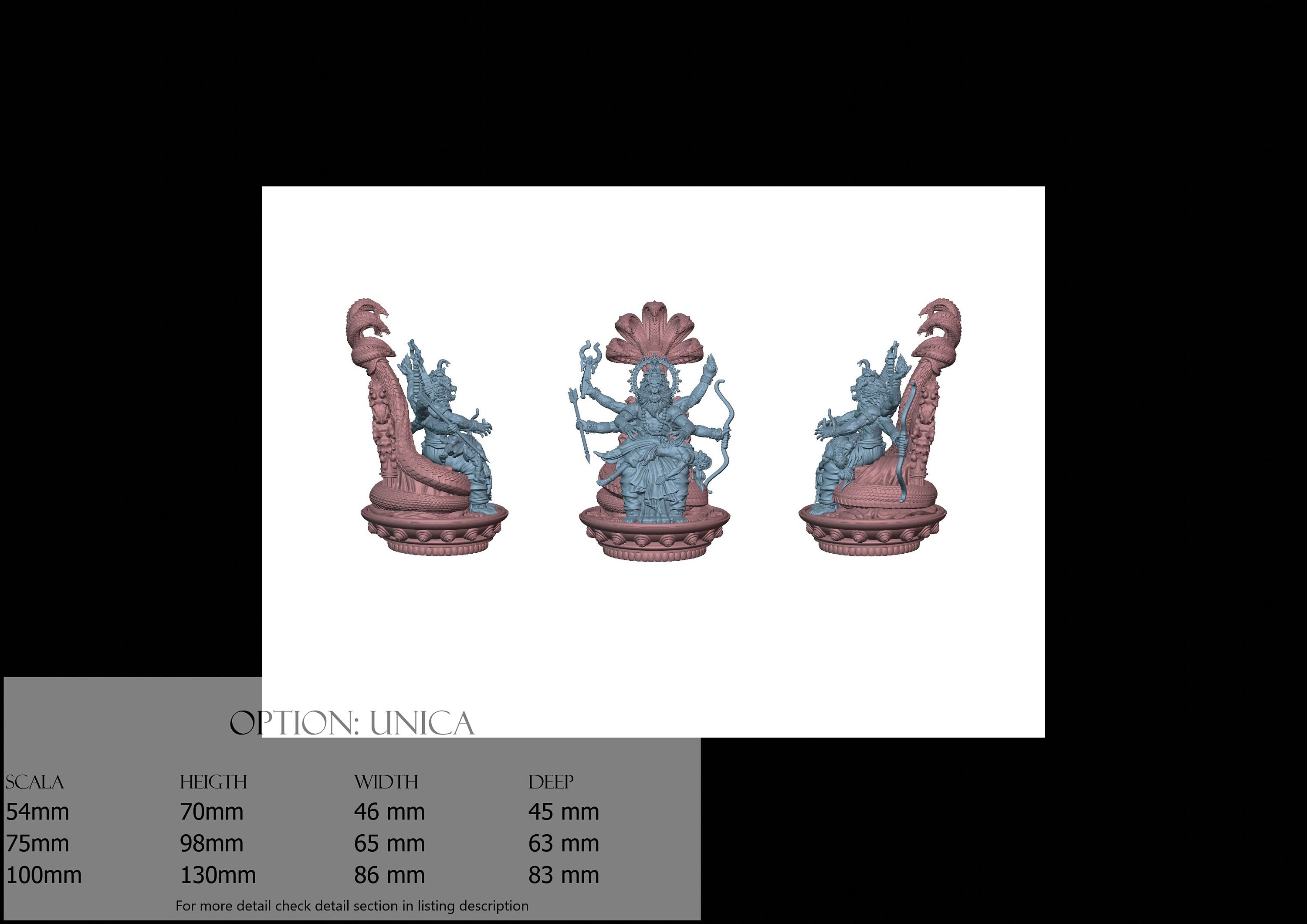 - Base (1 piece) in Resin: Height: 130 mm, Width: 77 mm, Depth: 83 mm