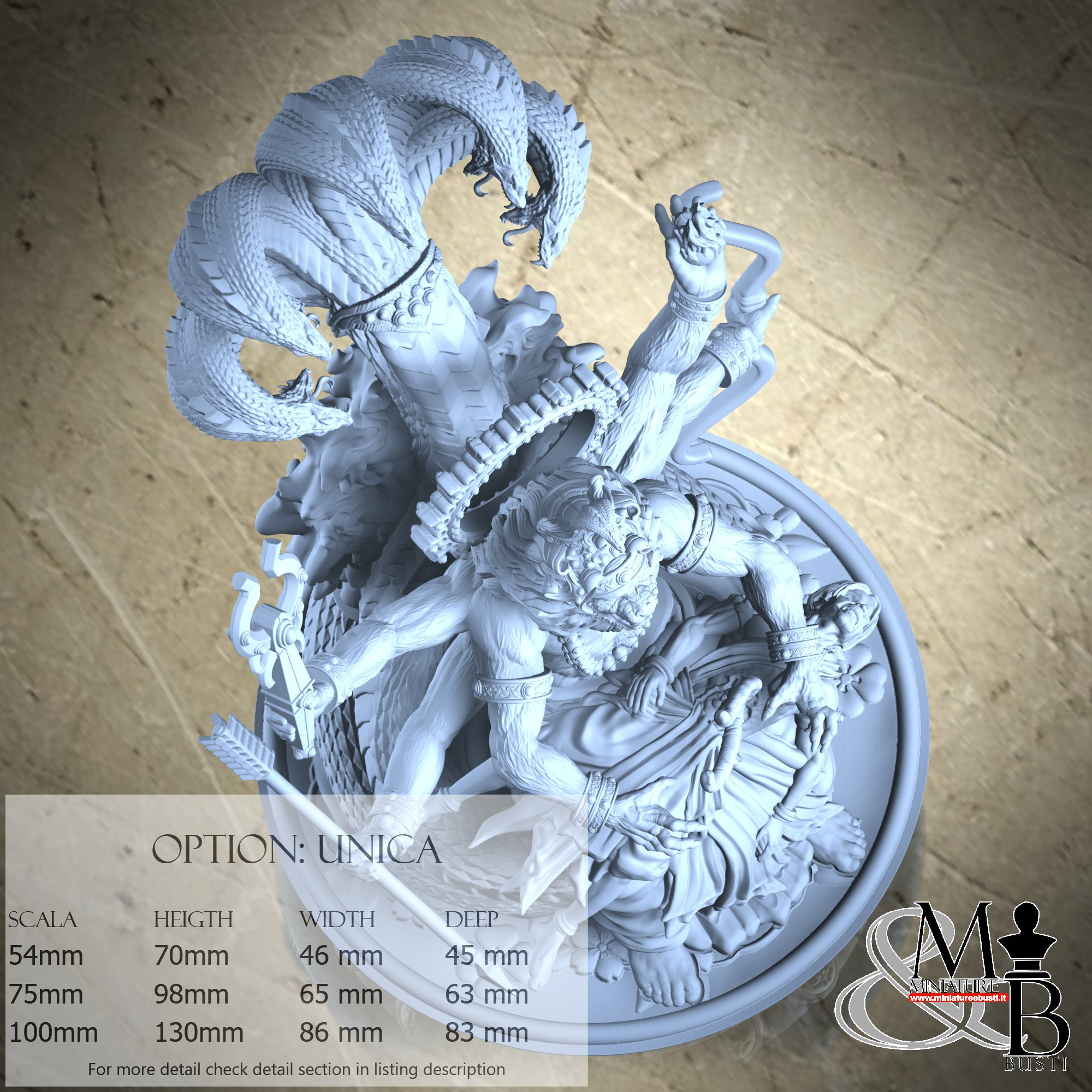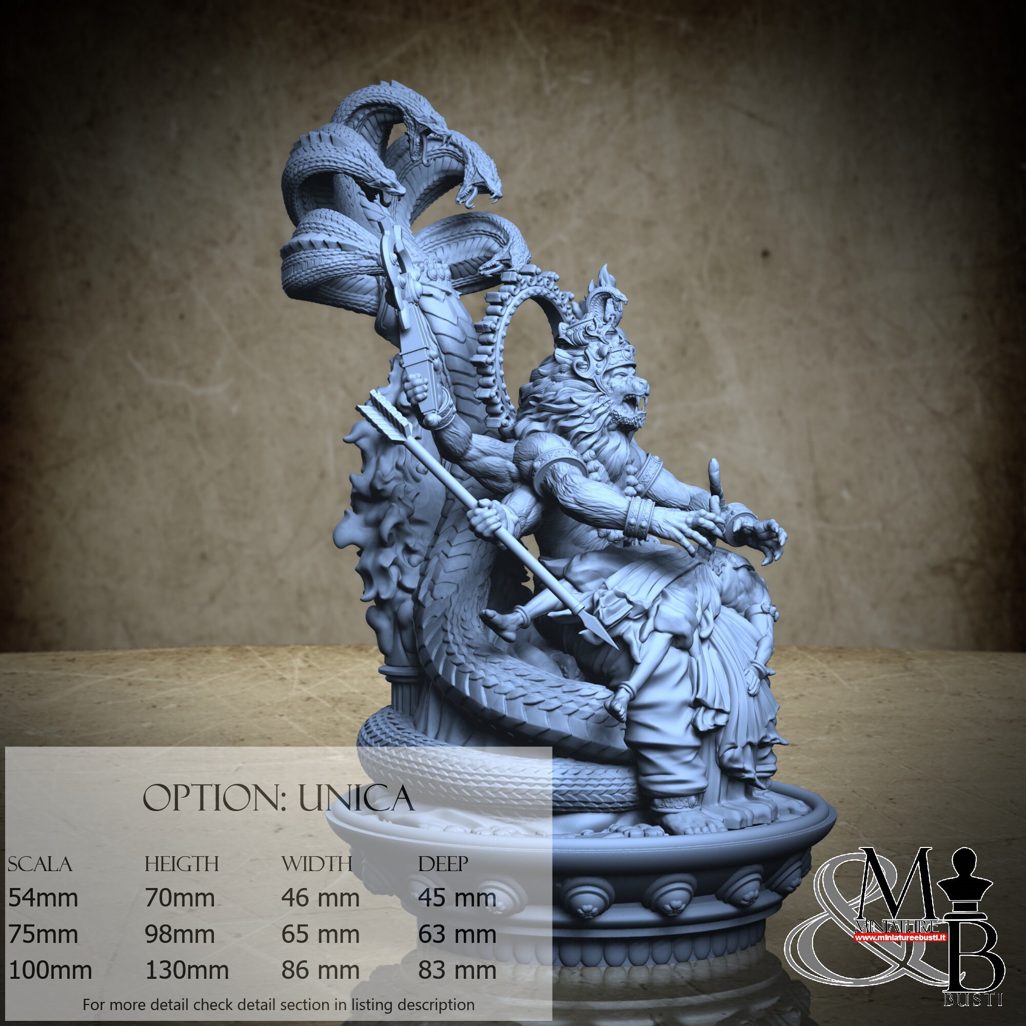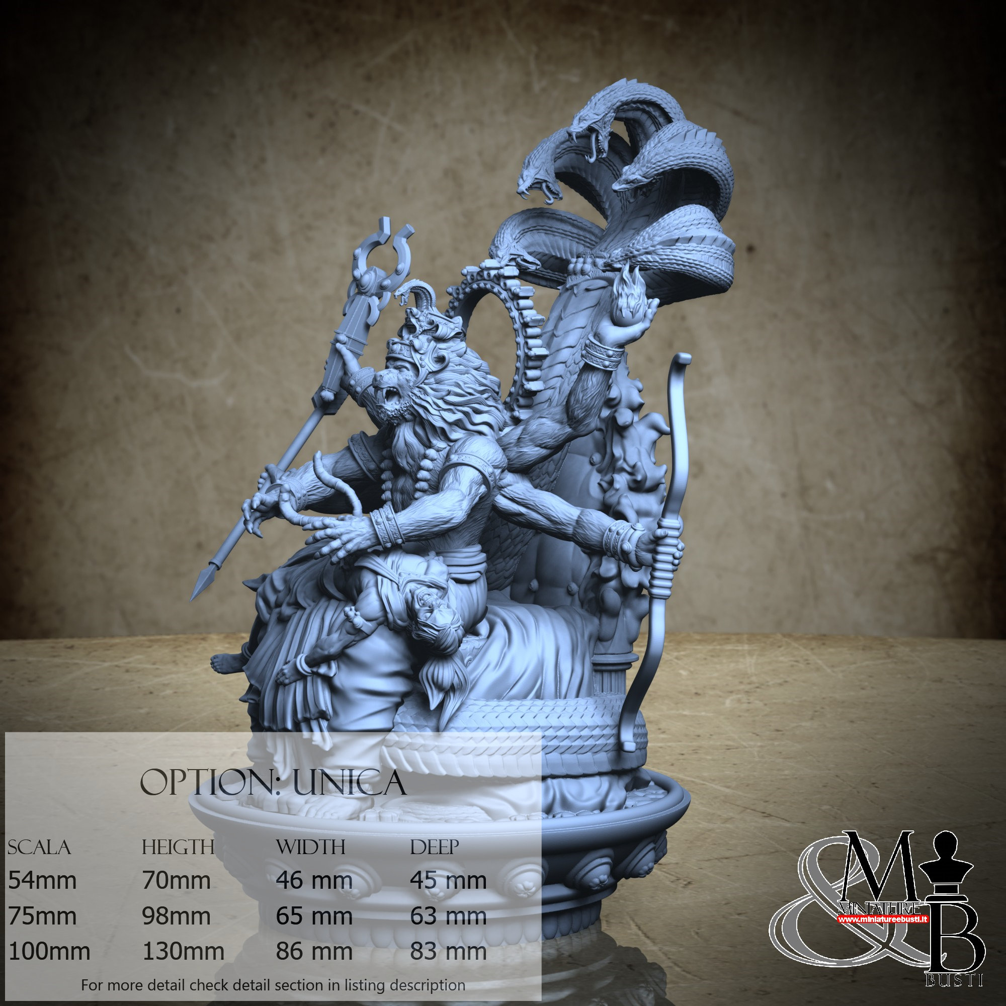- Base (1 piece) in Resin: Height: 130 mm, Width: 77 mm, Depth: 83 mm