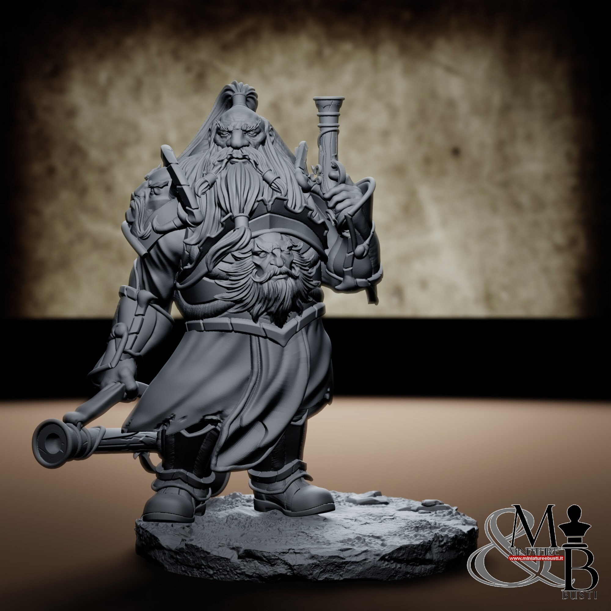 Dwarf with steampunk flamethrower, team leader.