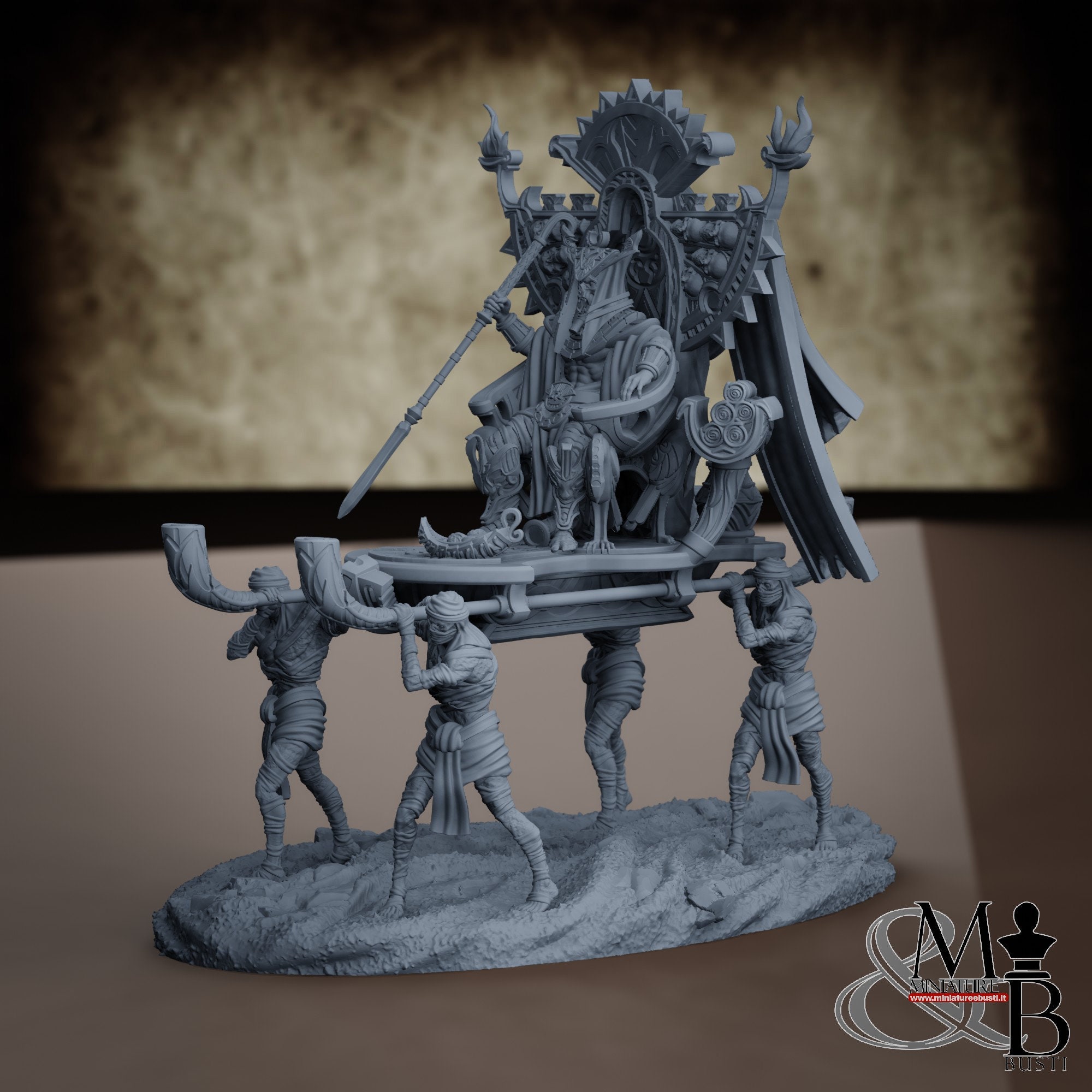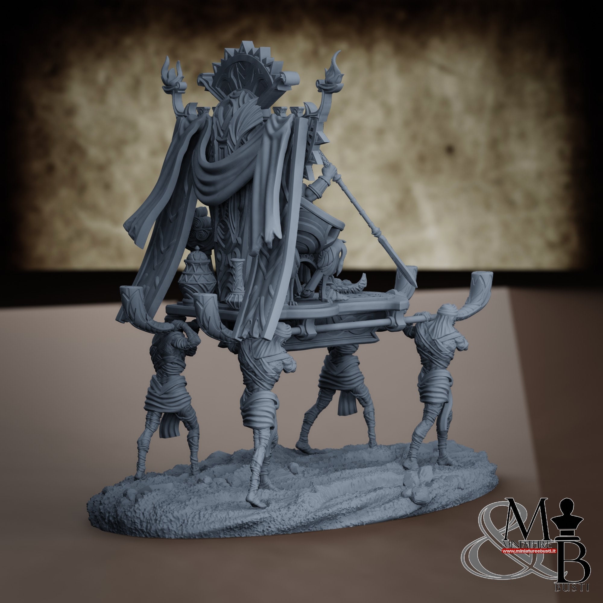 - Mummy Lord with sedan chair and servants (1 piece) in Resin: Height: 126 mm, Width: 77 mm, Depth: 118 mm