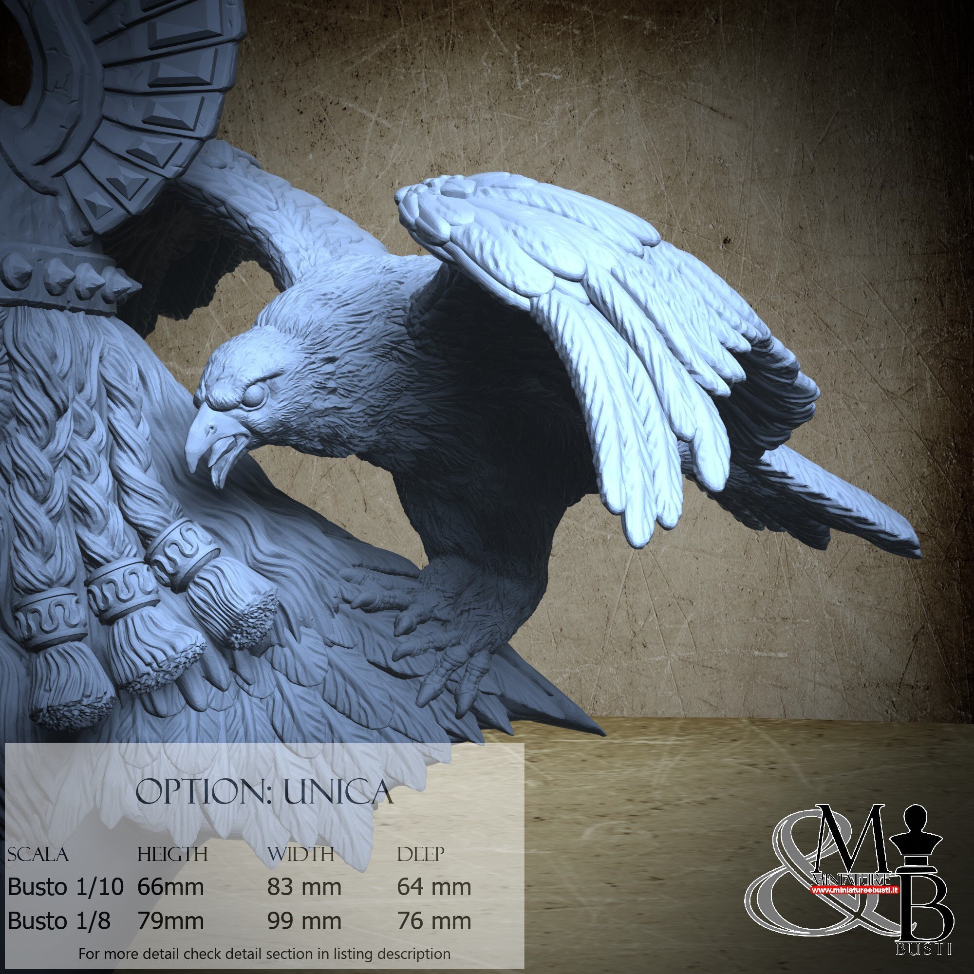 - Bust (1 piece) in Resin: Height: 79 mm, Width: 99 mm, Depth: 76 mm