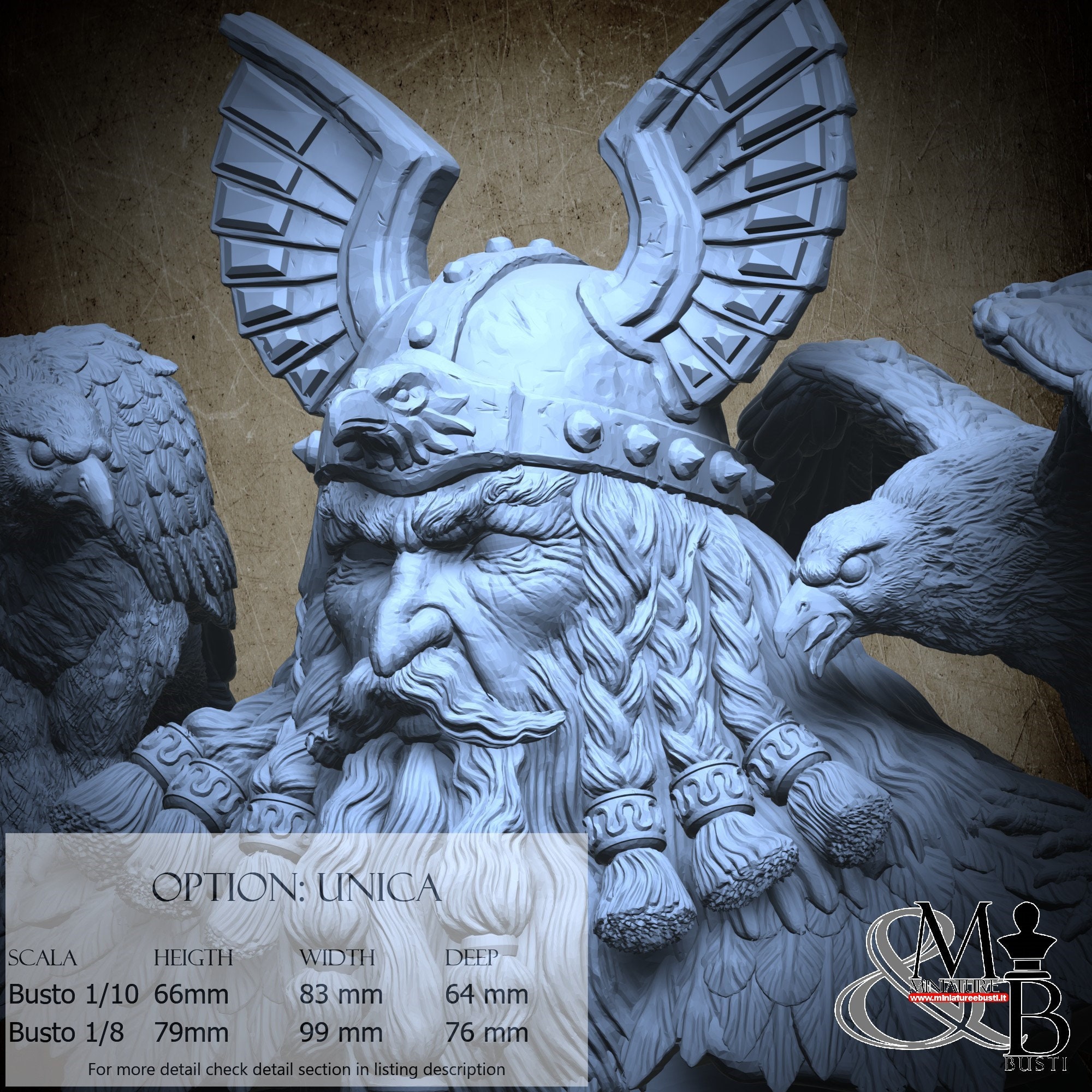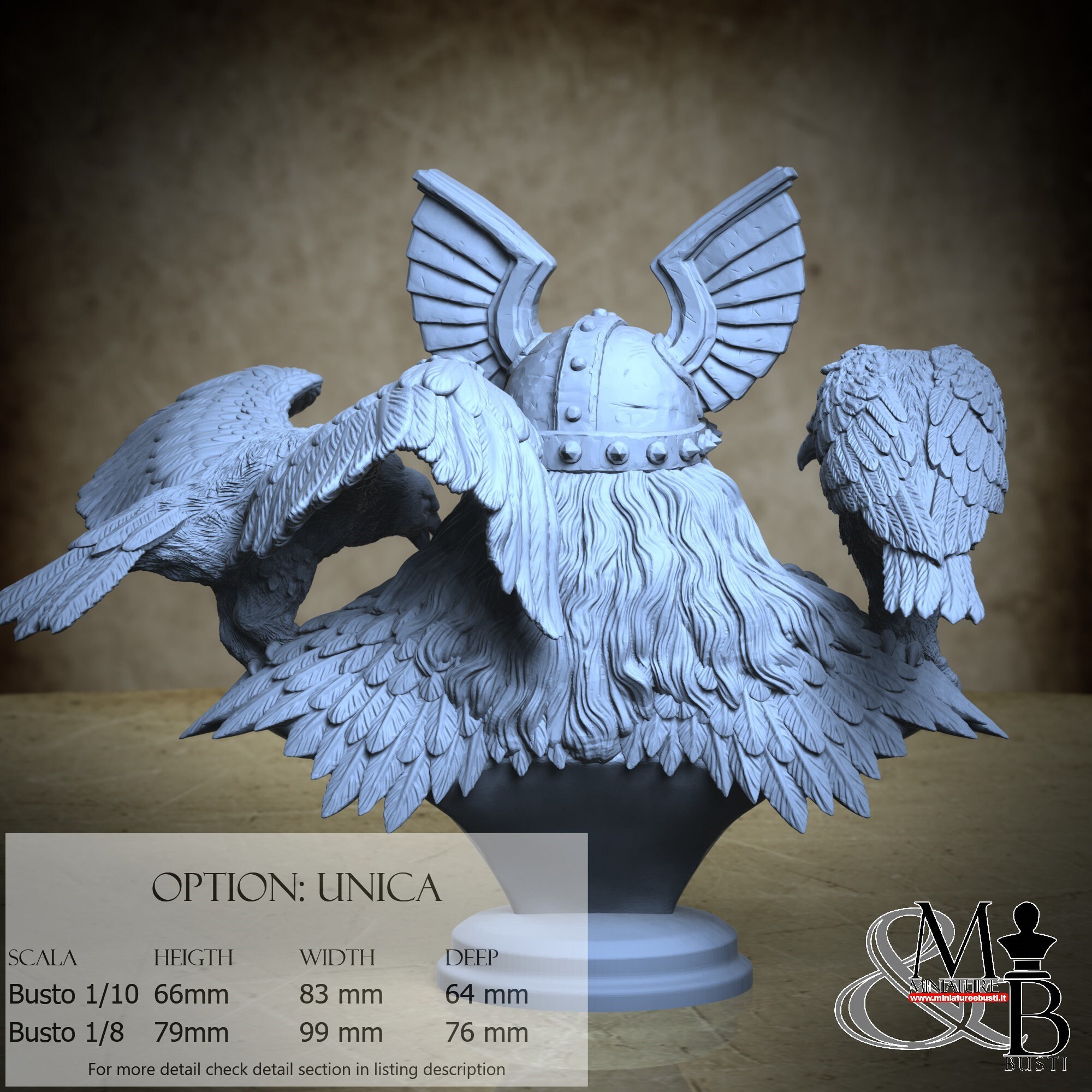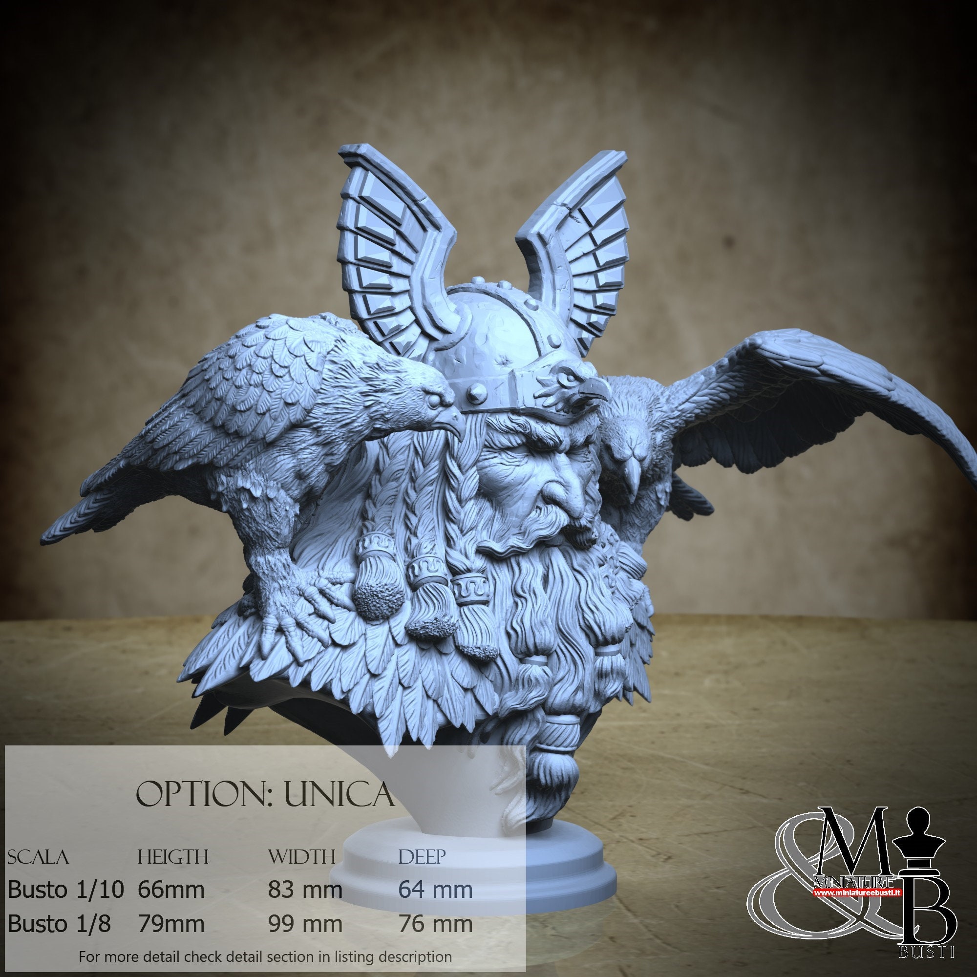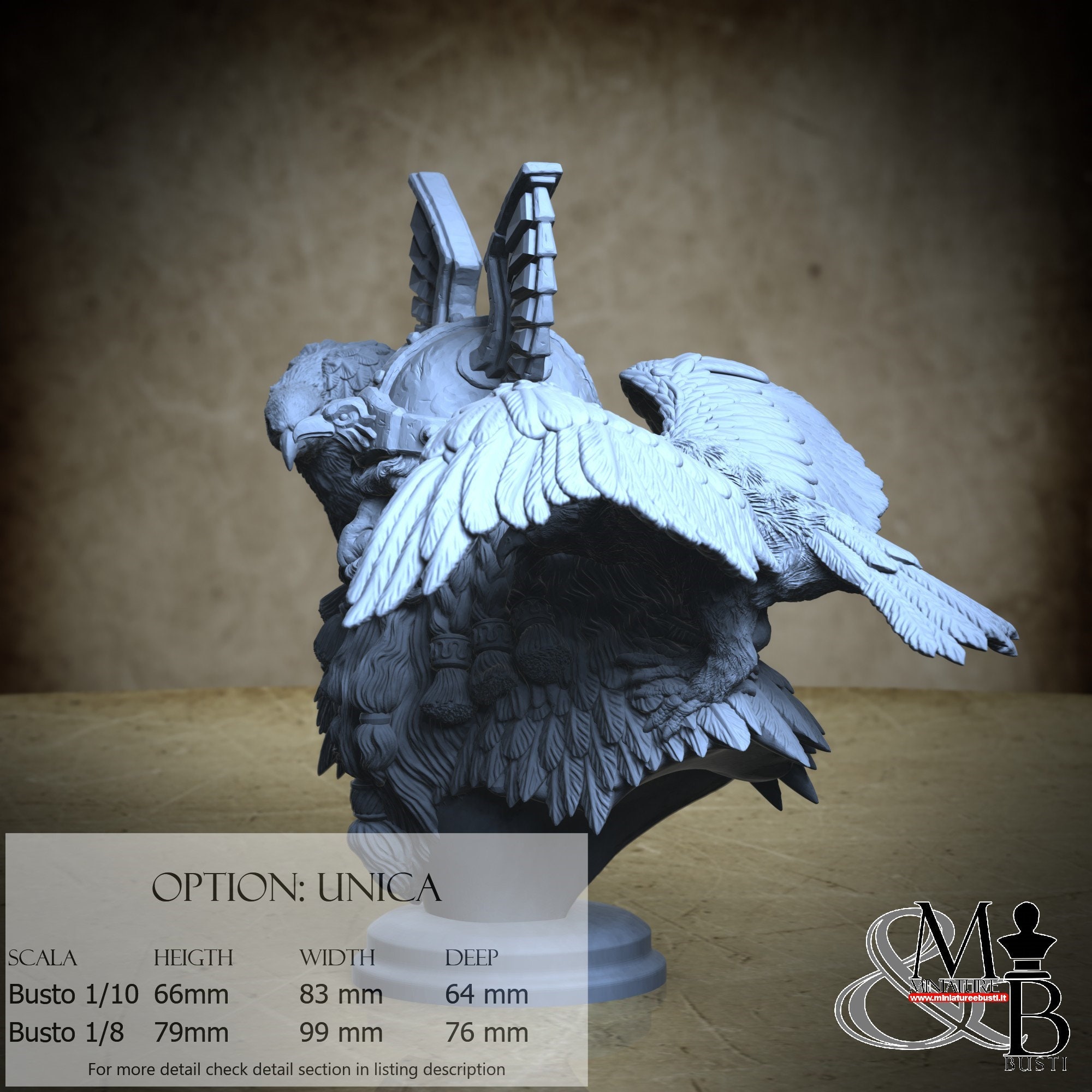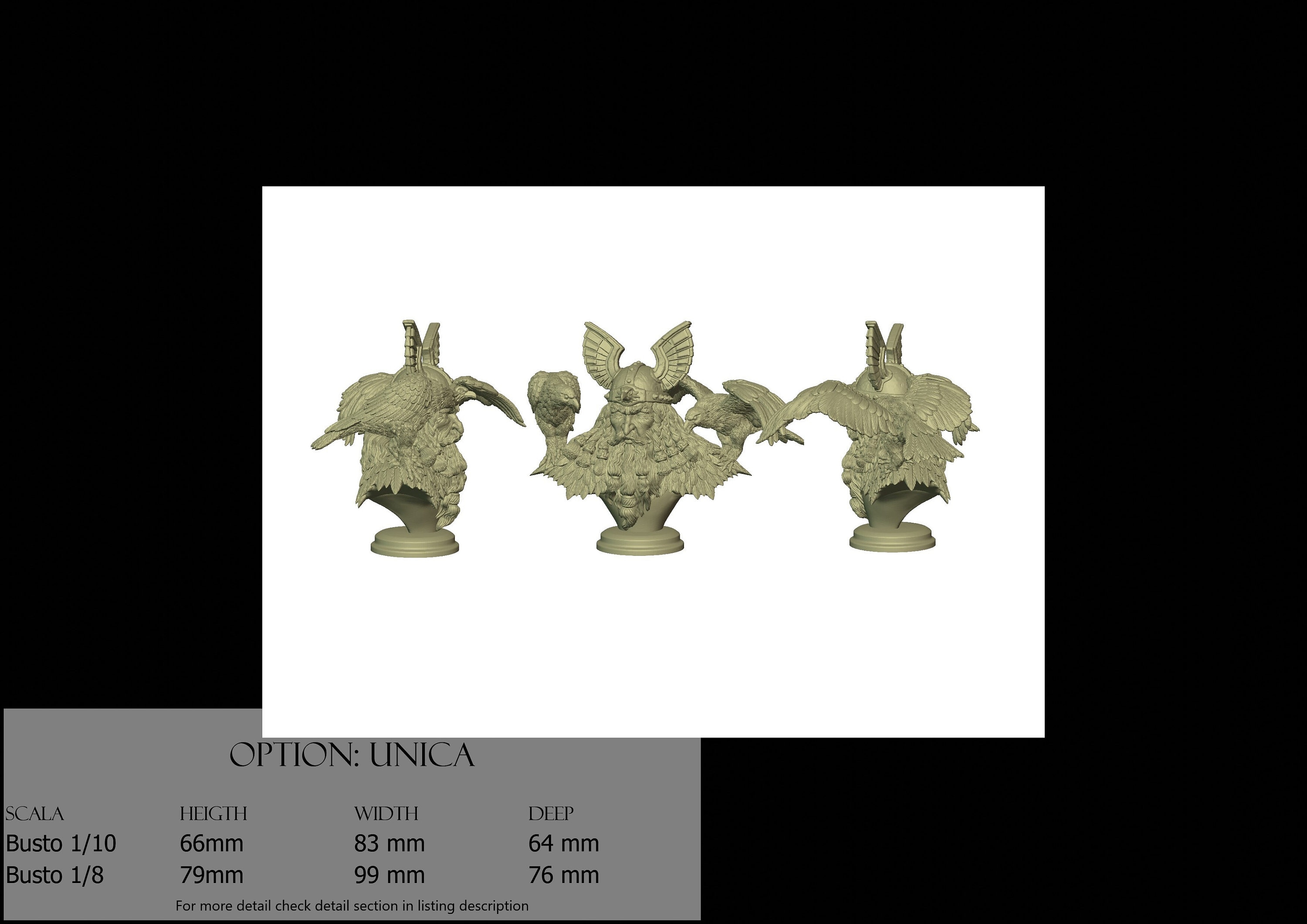 - Bust (1 piece) in Resin: Height: 66 mm, Width: 83 mm, Depth: 64 mm
