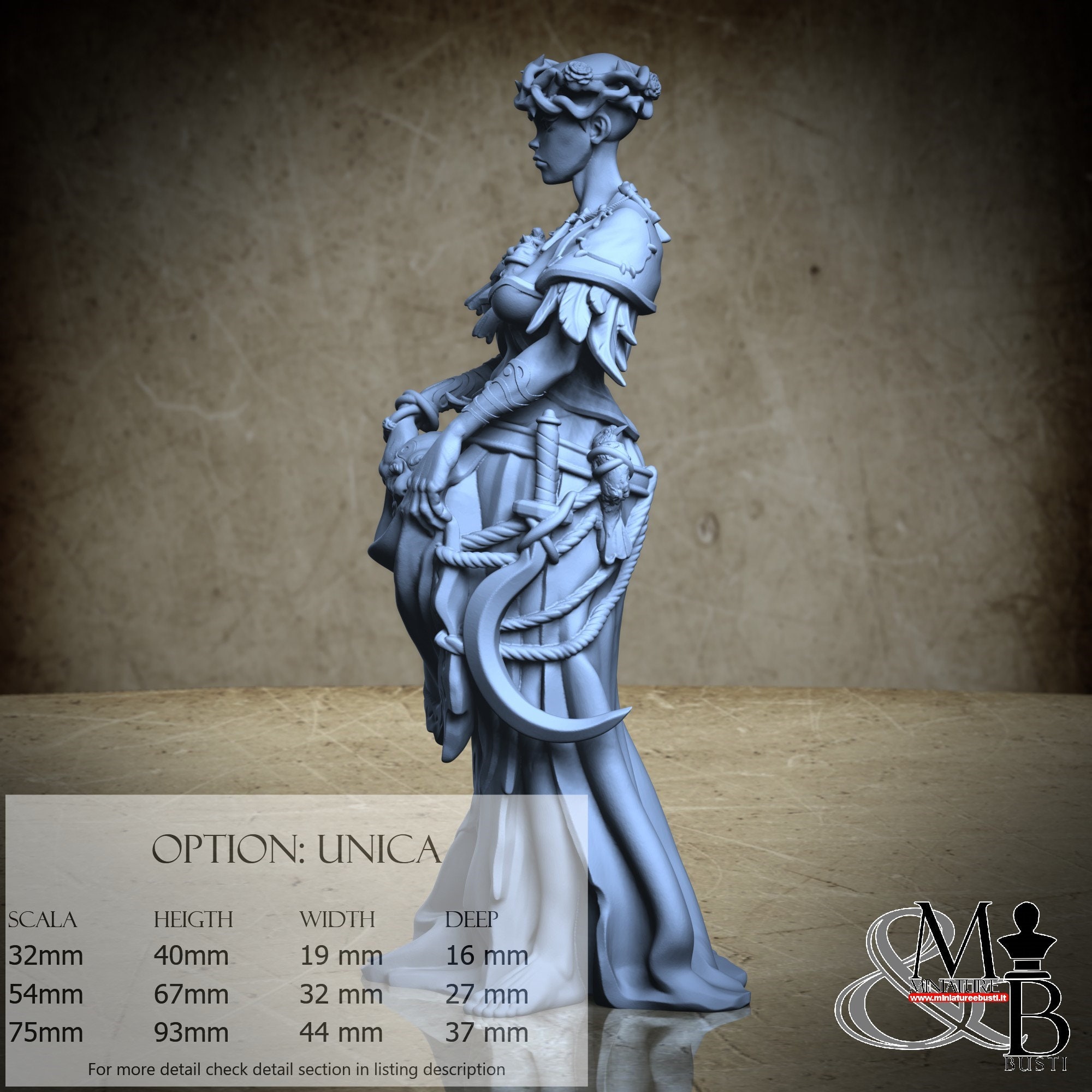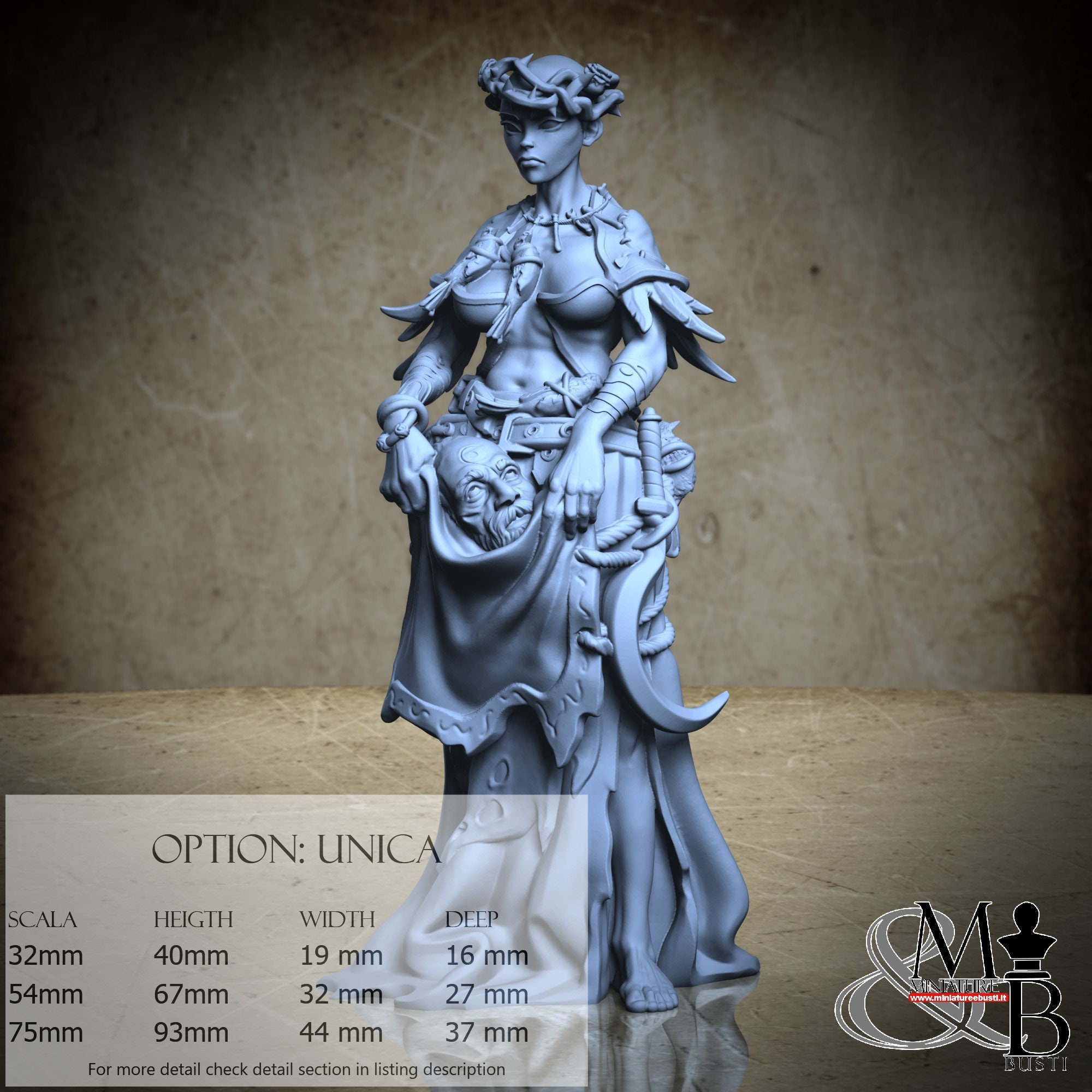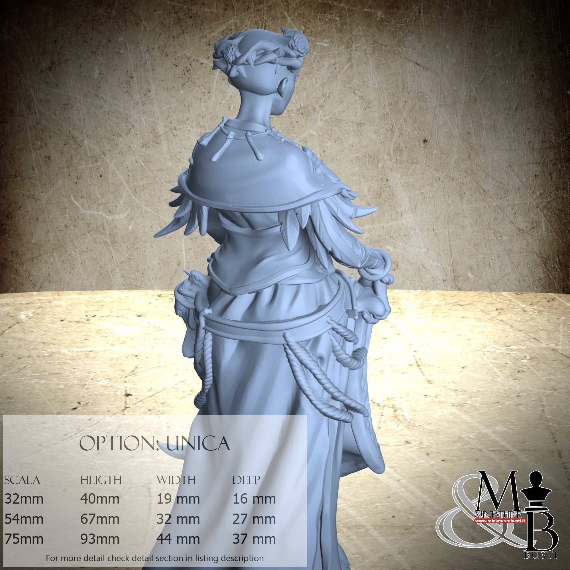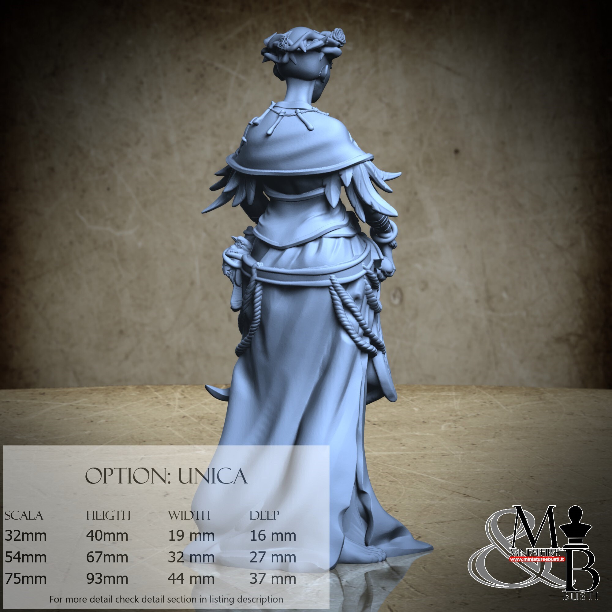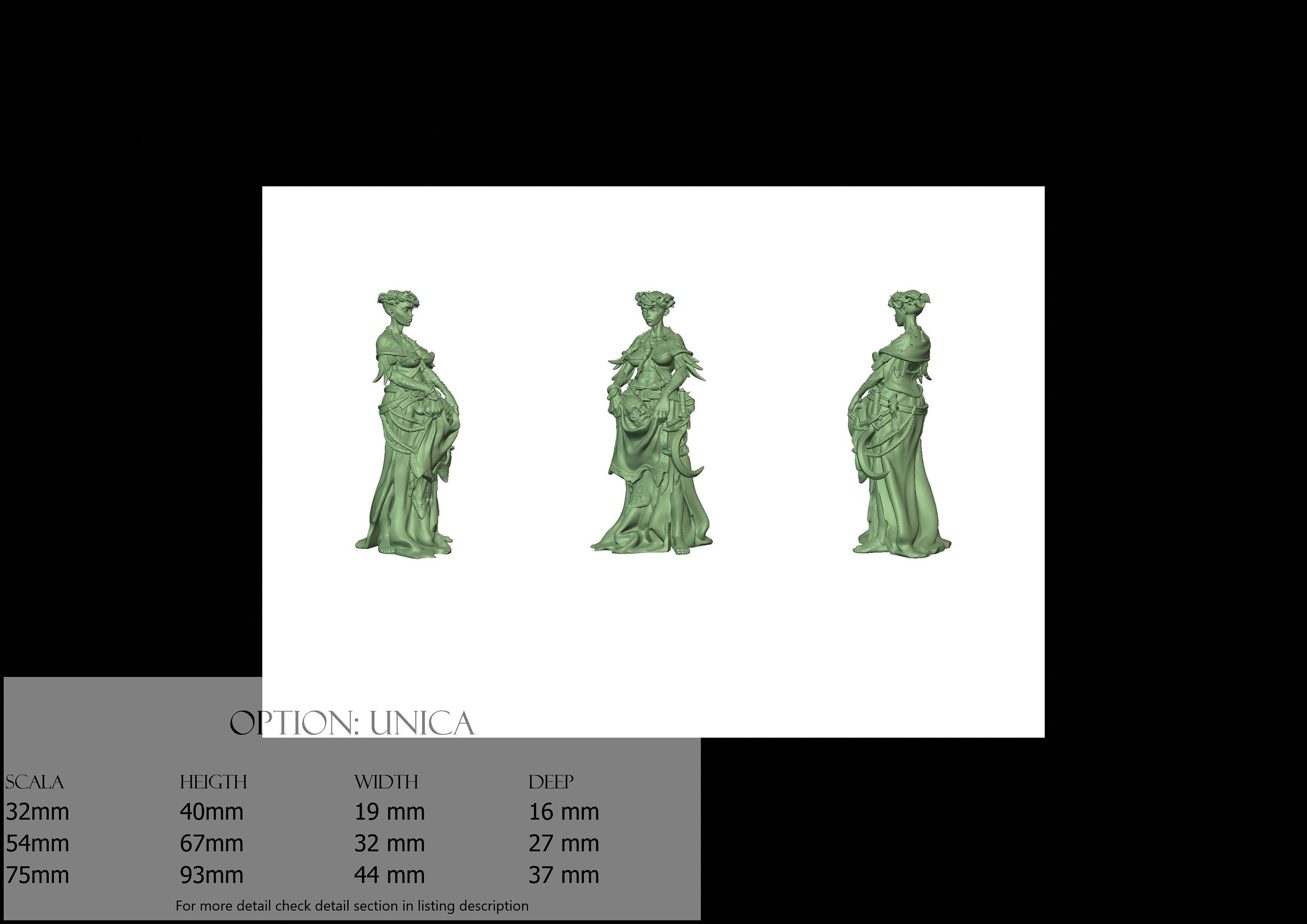 - Figure (1 piece) in Resin: Height: 93 mm, Width: 44 mm, Depth: 37 mm