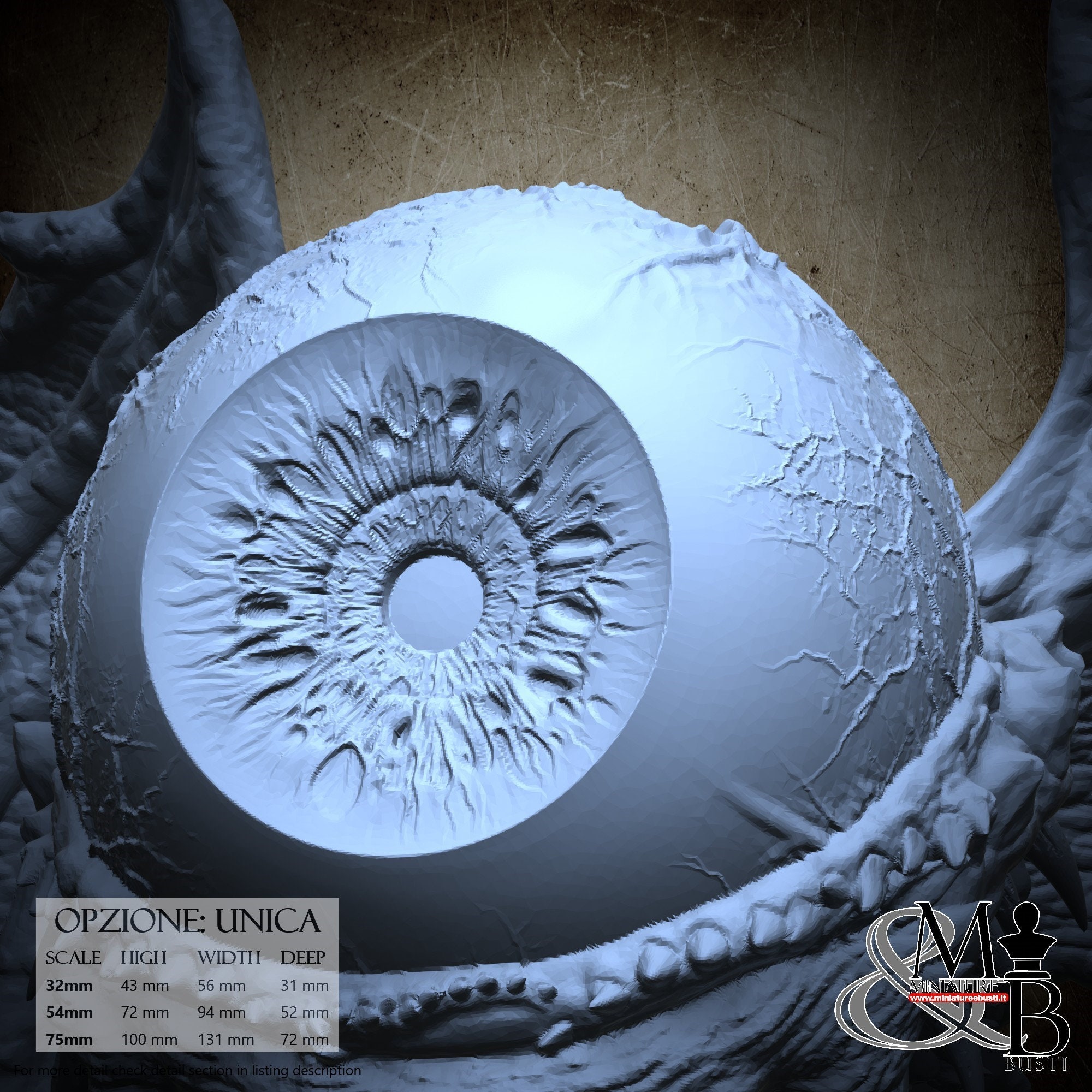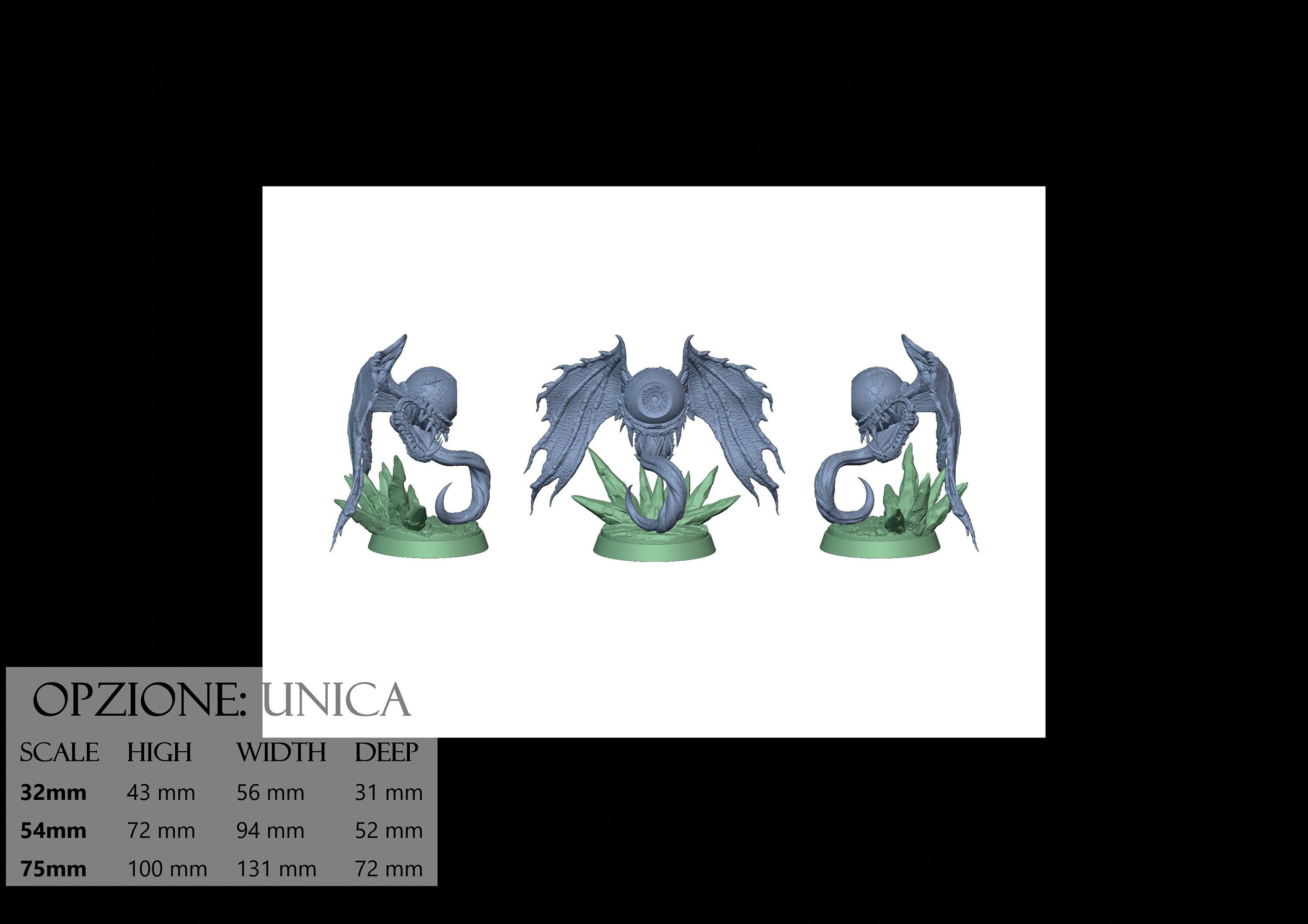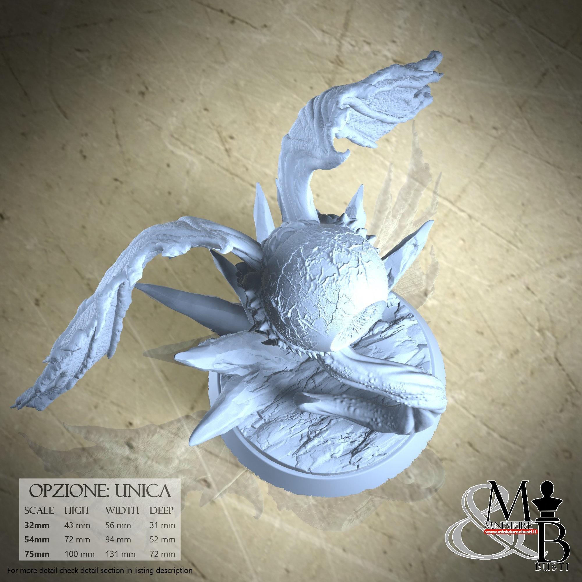 - Base (1 piece) in Resin: Height: 33 mm, Width: 57 mm, Depth: 52 mm