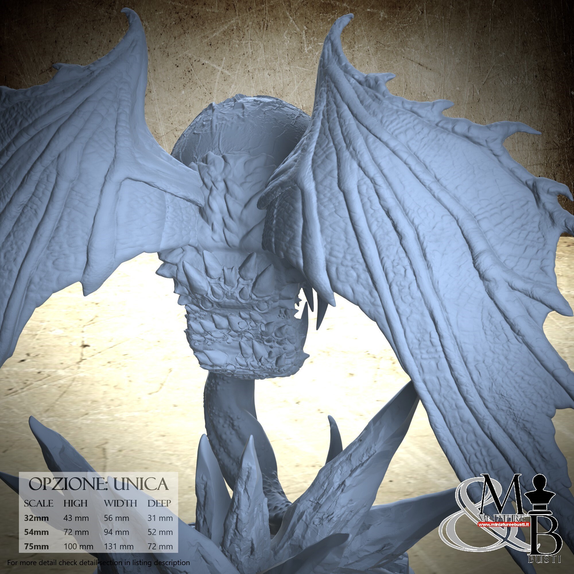 - Base (1 piece) in Resin: Height: 46 mm, Width: 79 mm, Depth: 72 mm