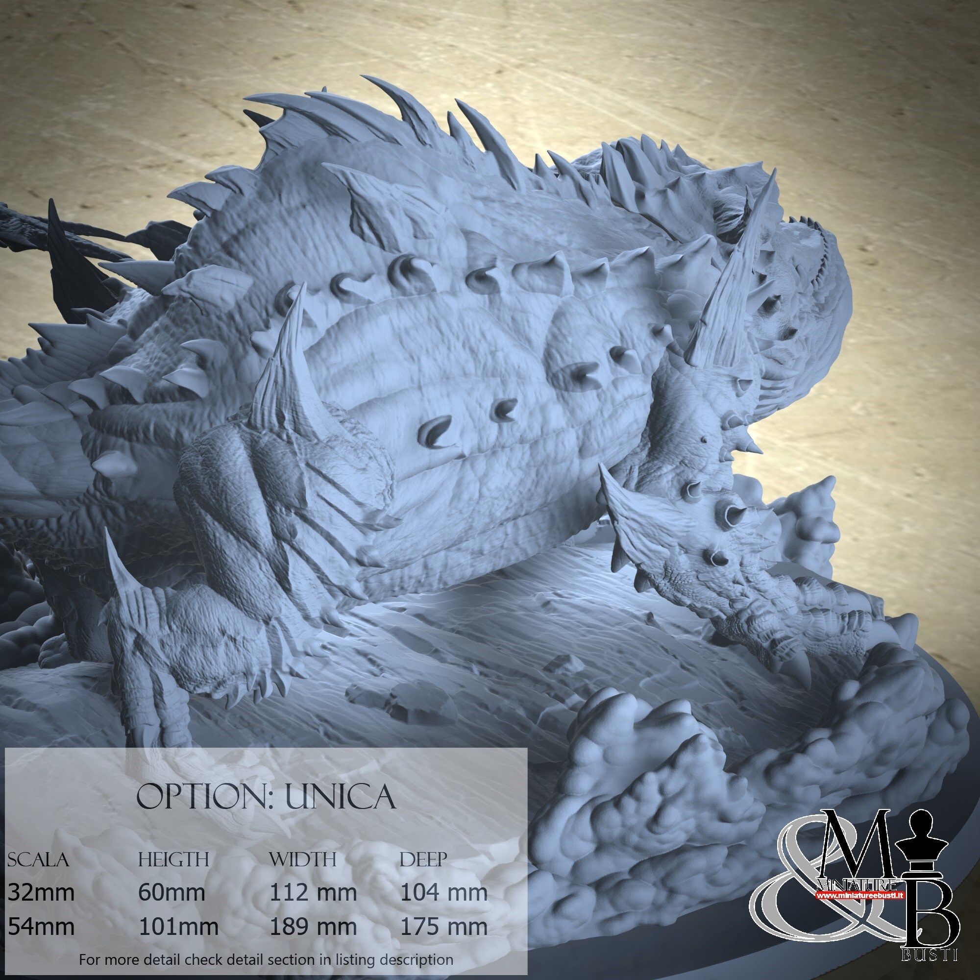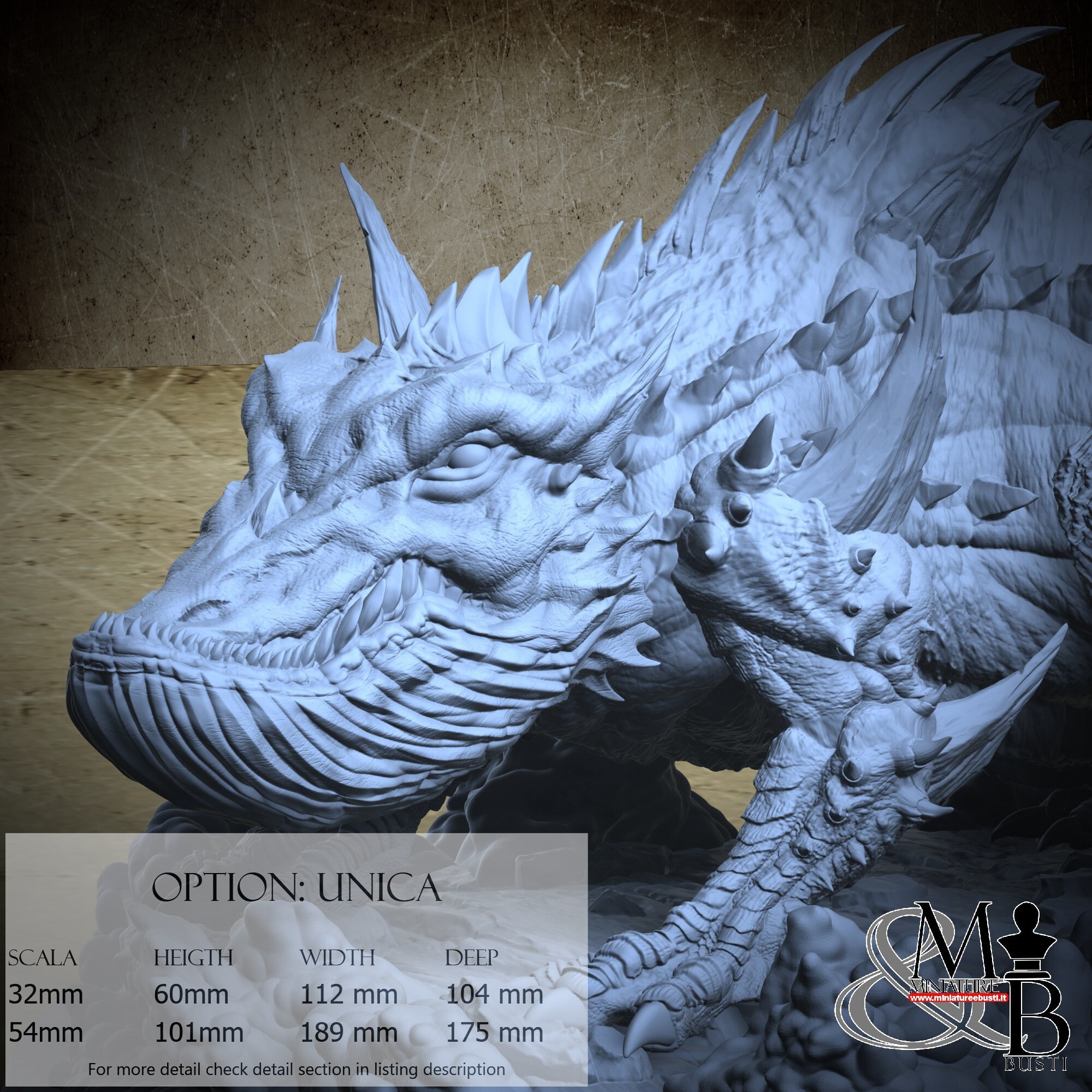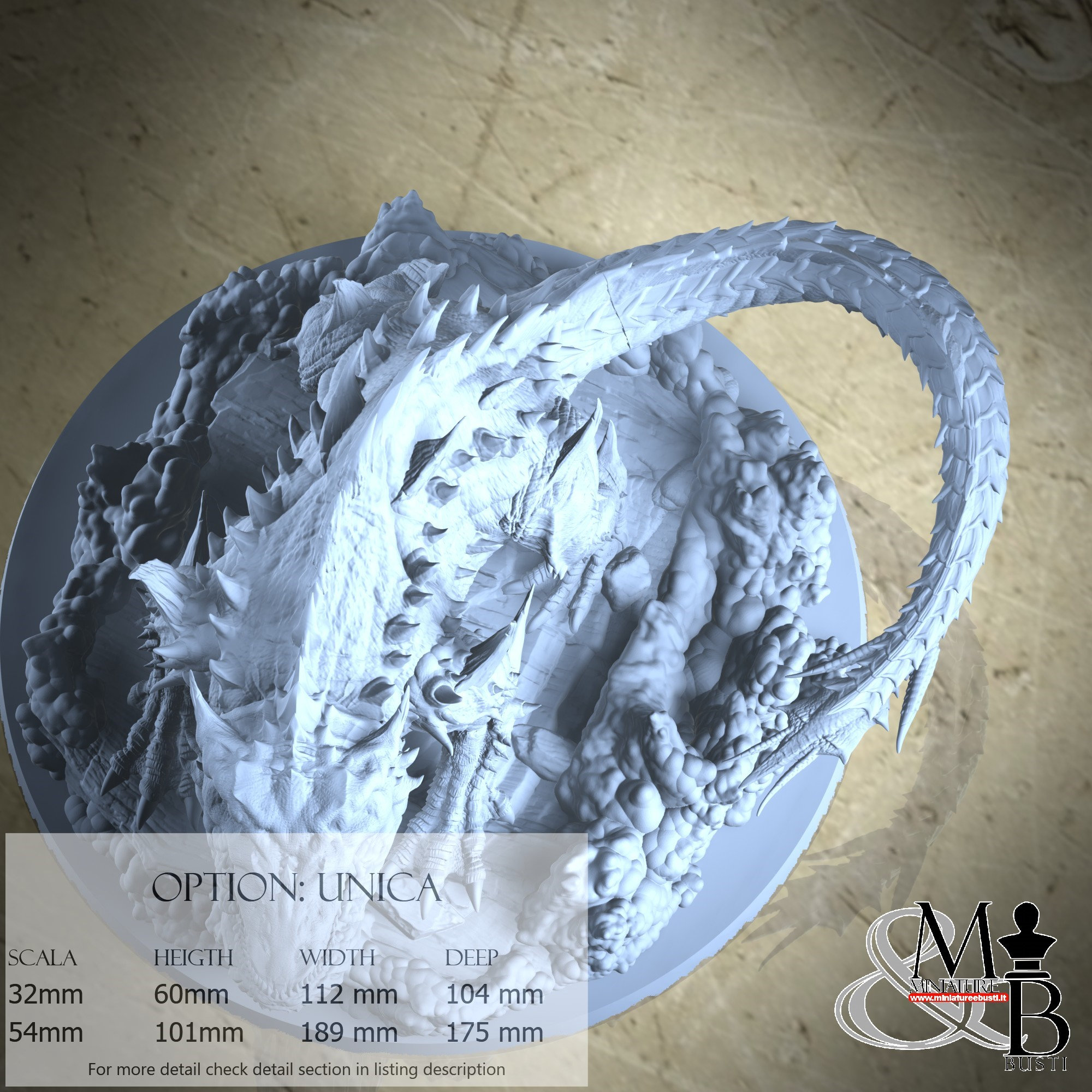 - Base (1 piece) in Resin: Height: 38 mm, Width: 169 mm, Depth: 169 mm