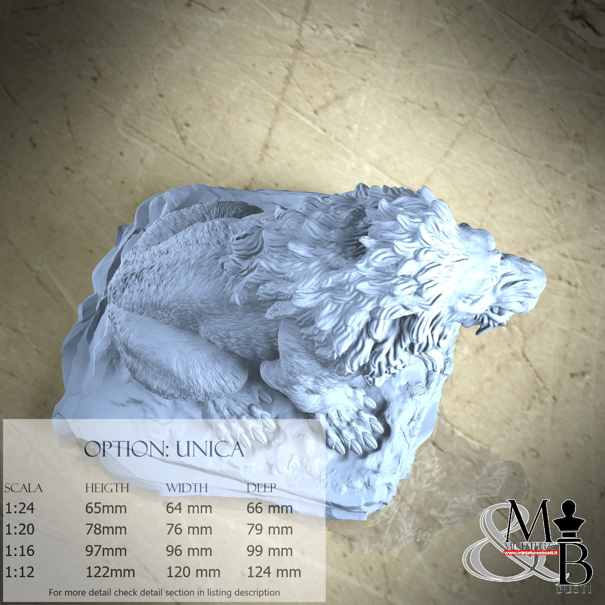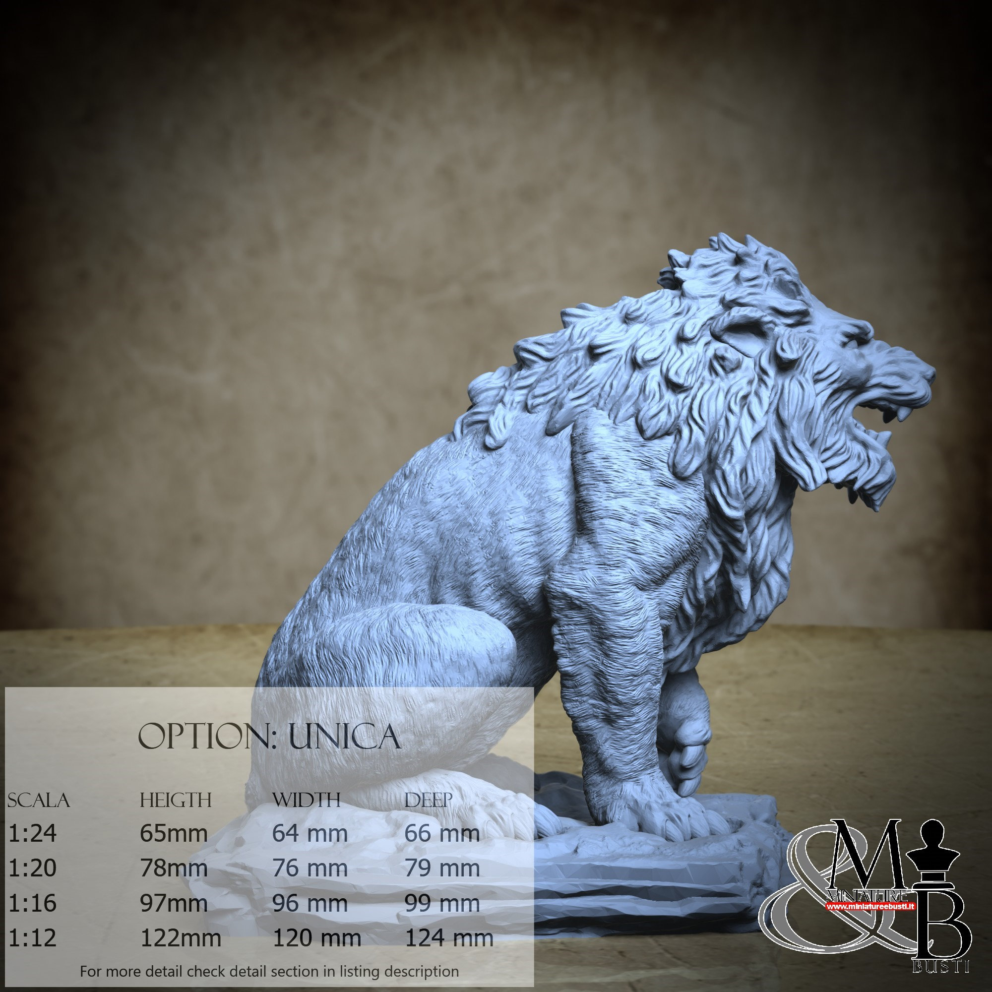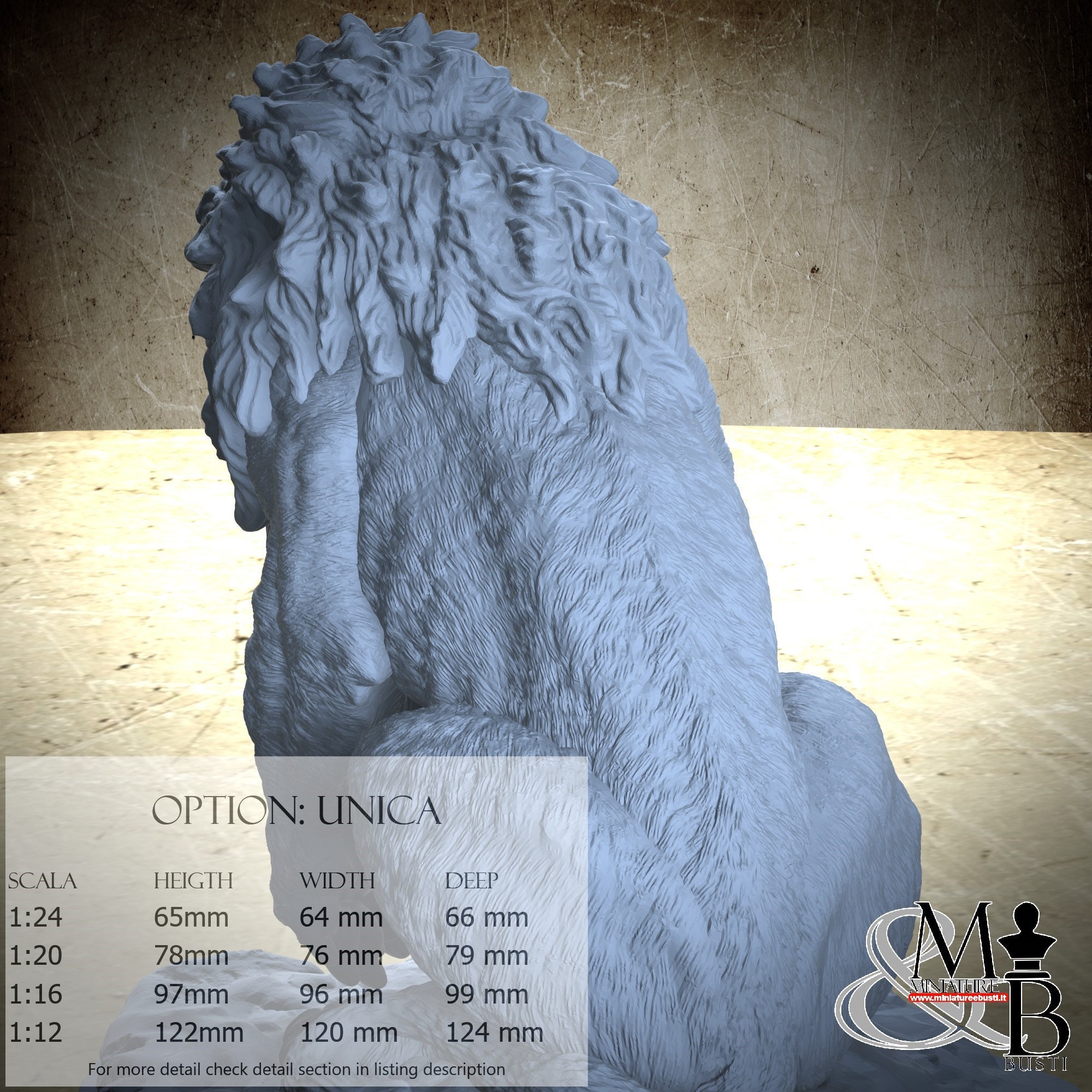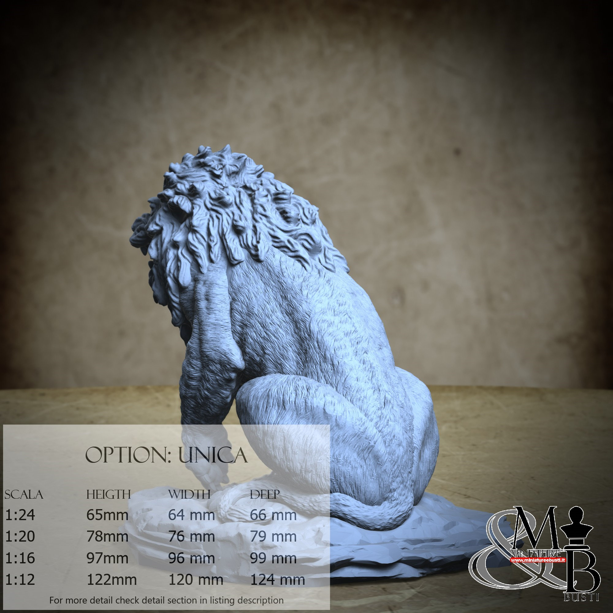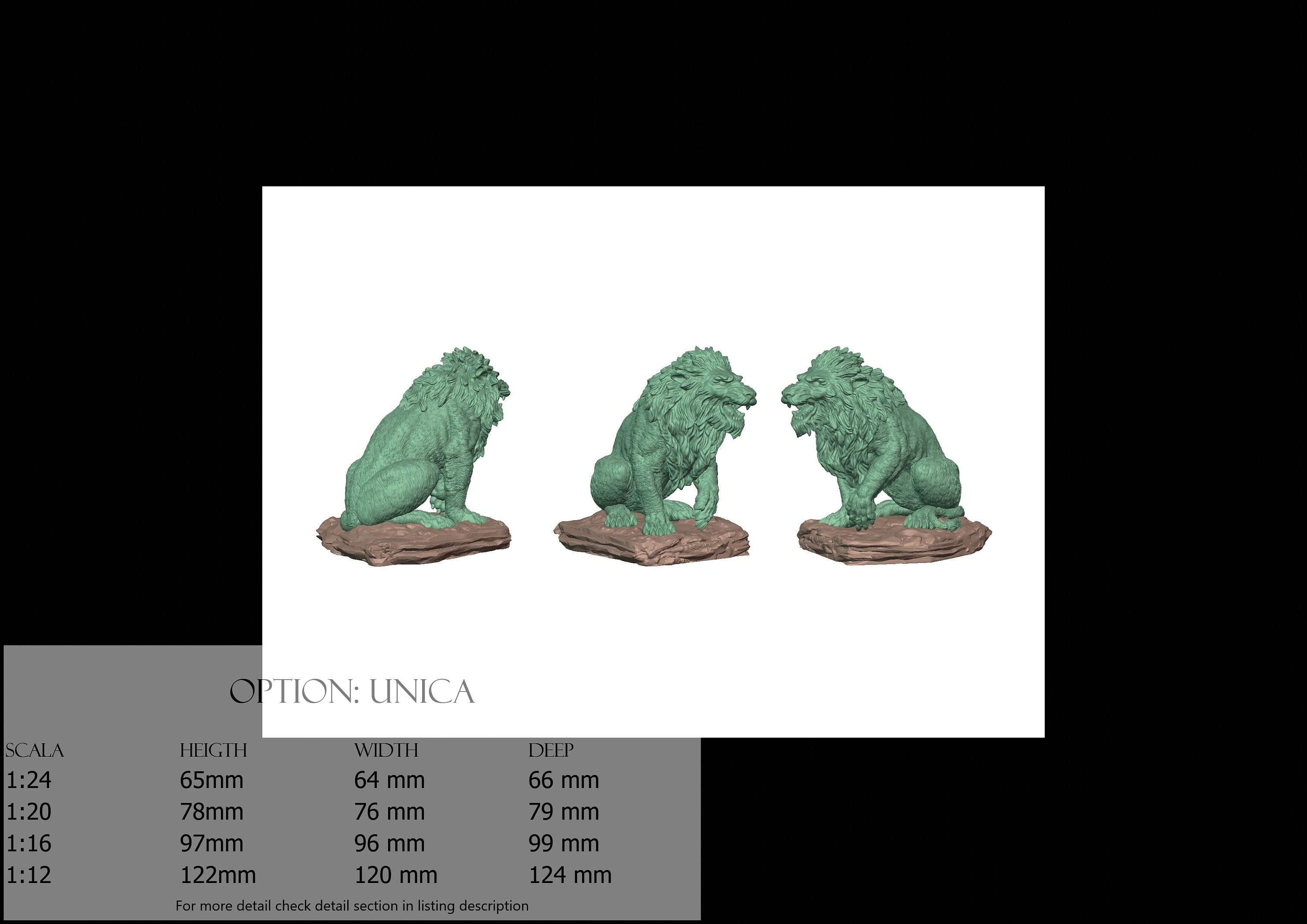 - Lion (1 piece) in Resin: Height: 93 mm, Width: 76 mm, Depth: 85 mm
