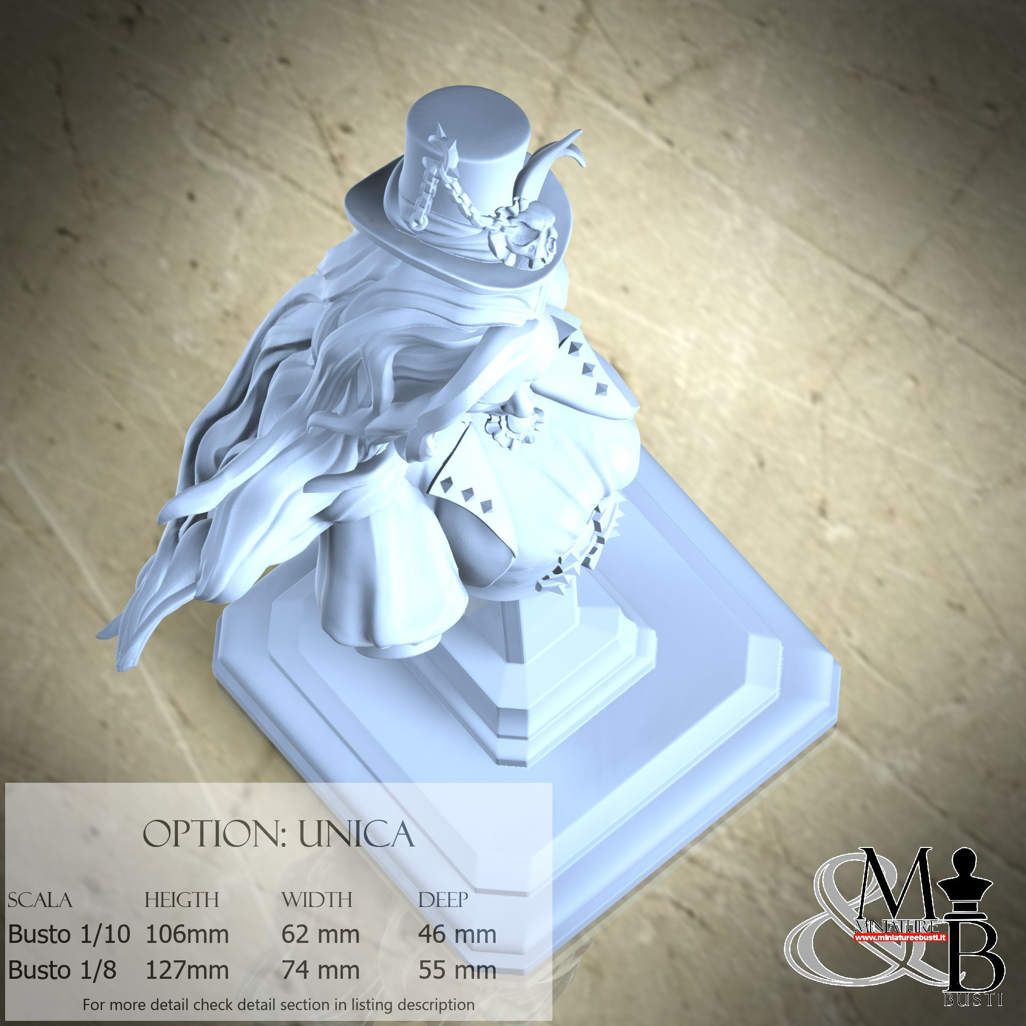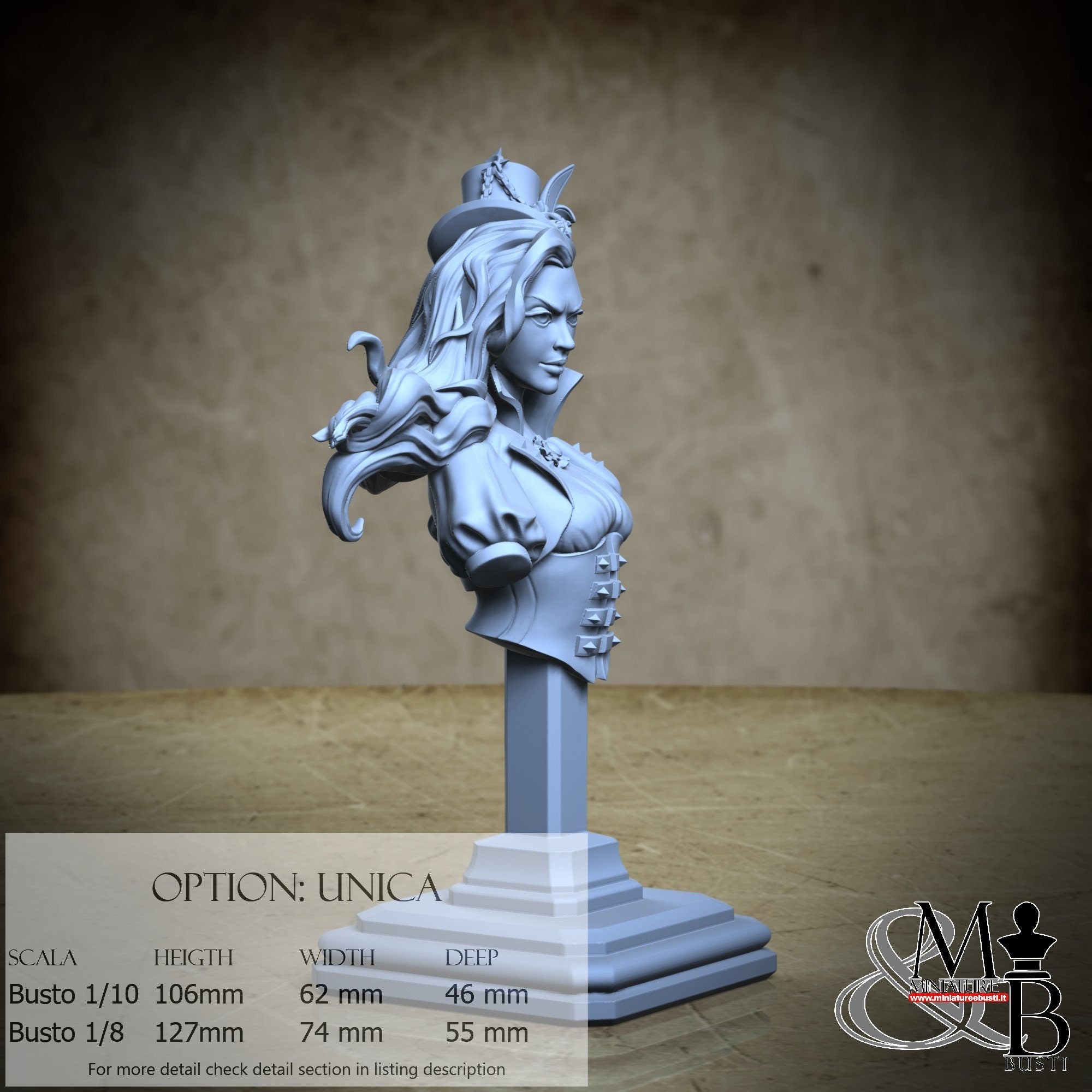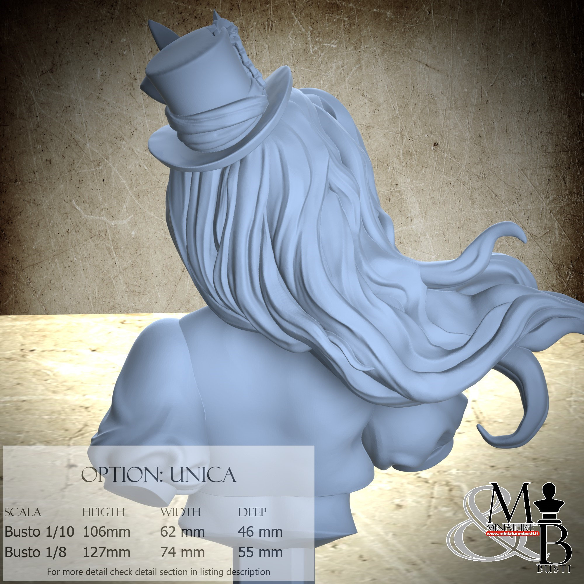 Bust Scale 1/10, cost €. 35.00 (Height: 106 mm, Width: 62 mm, Depth: 46 mm), composed of the following components: