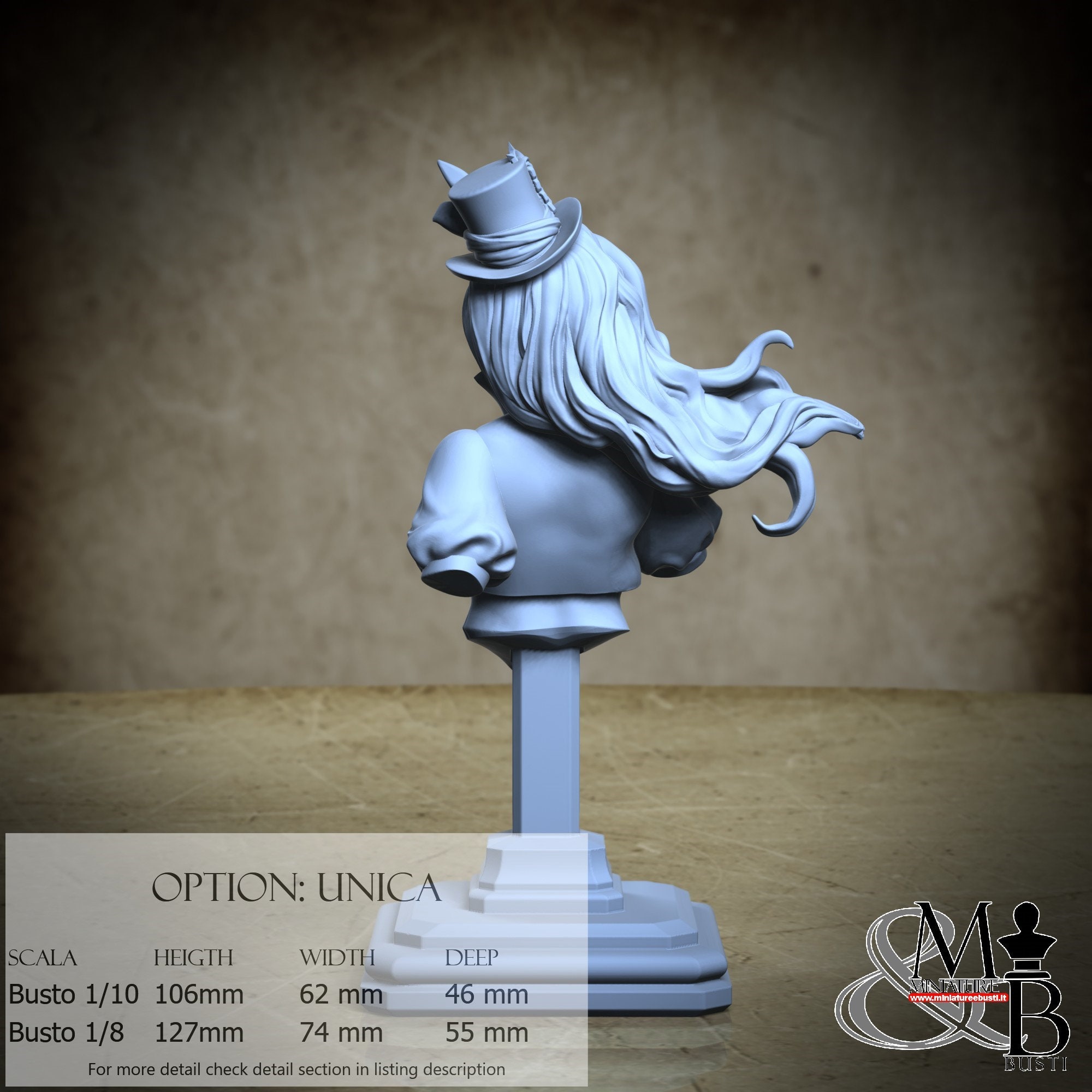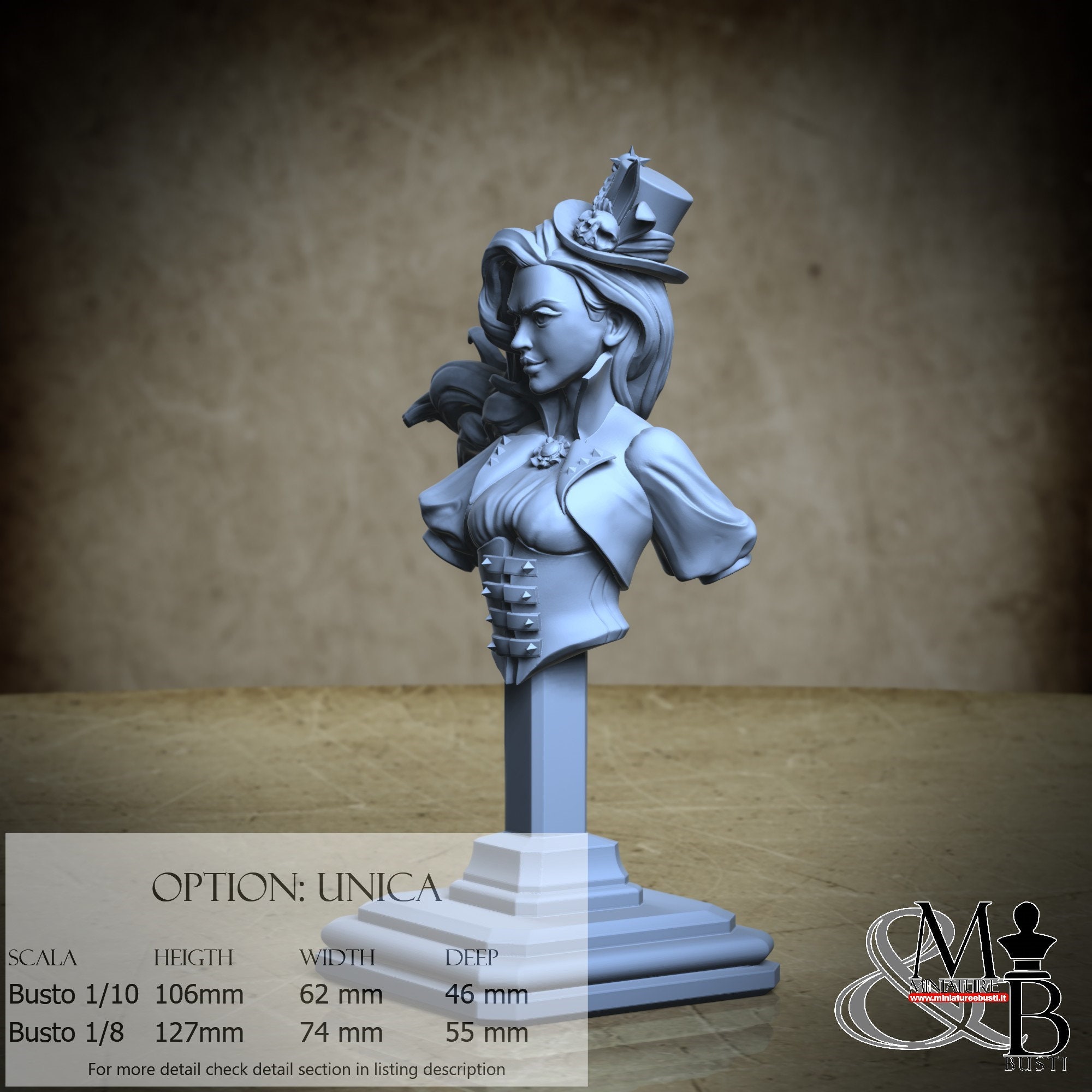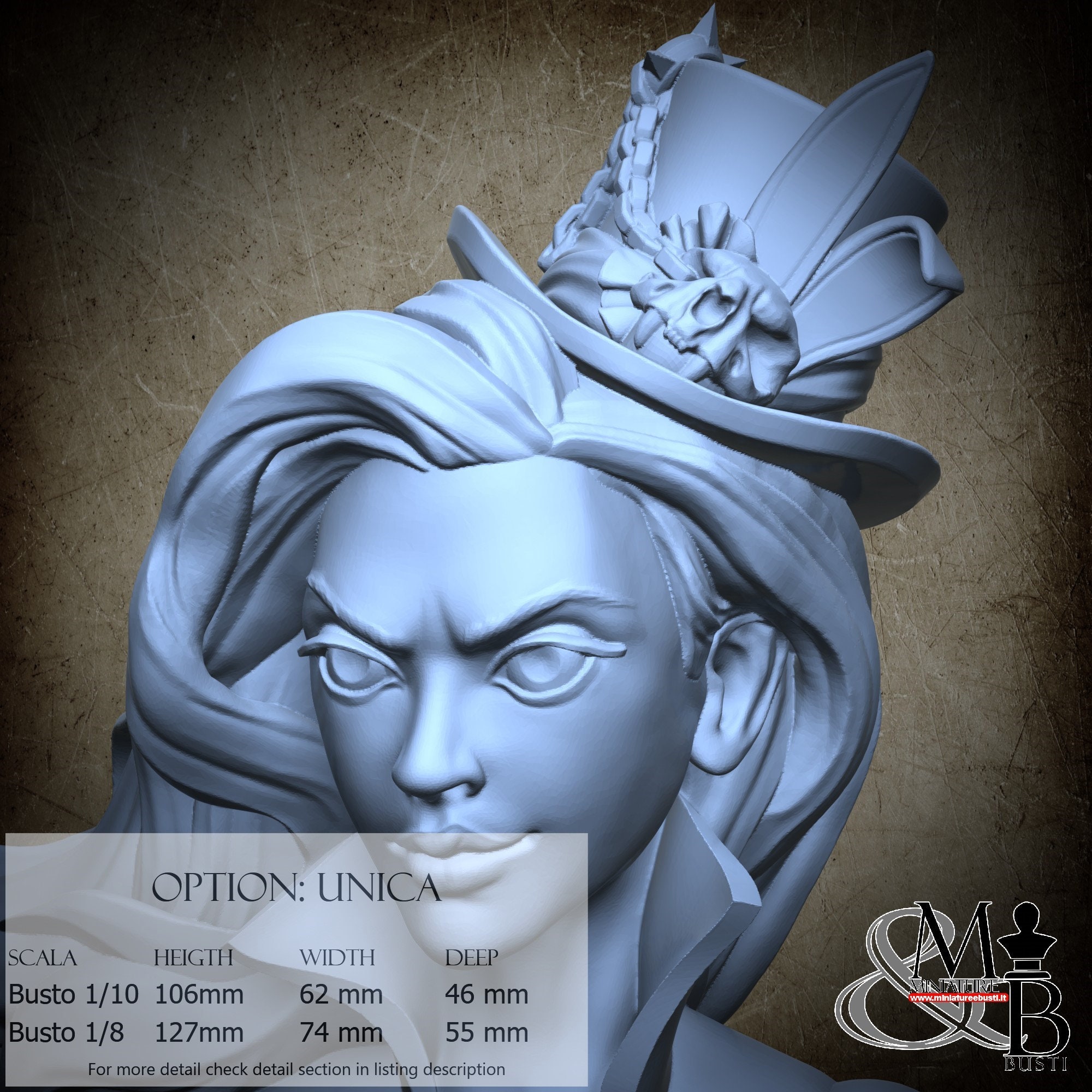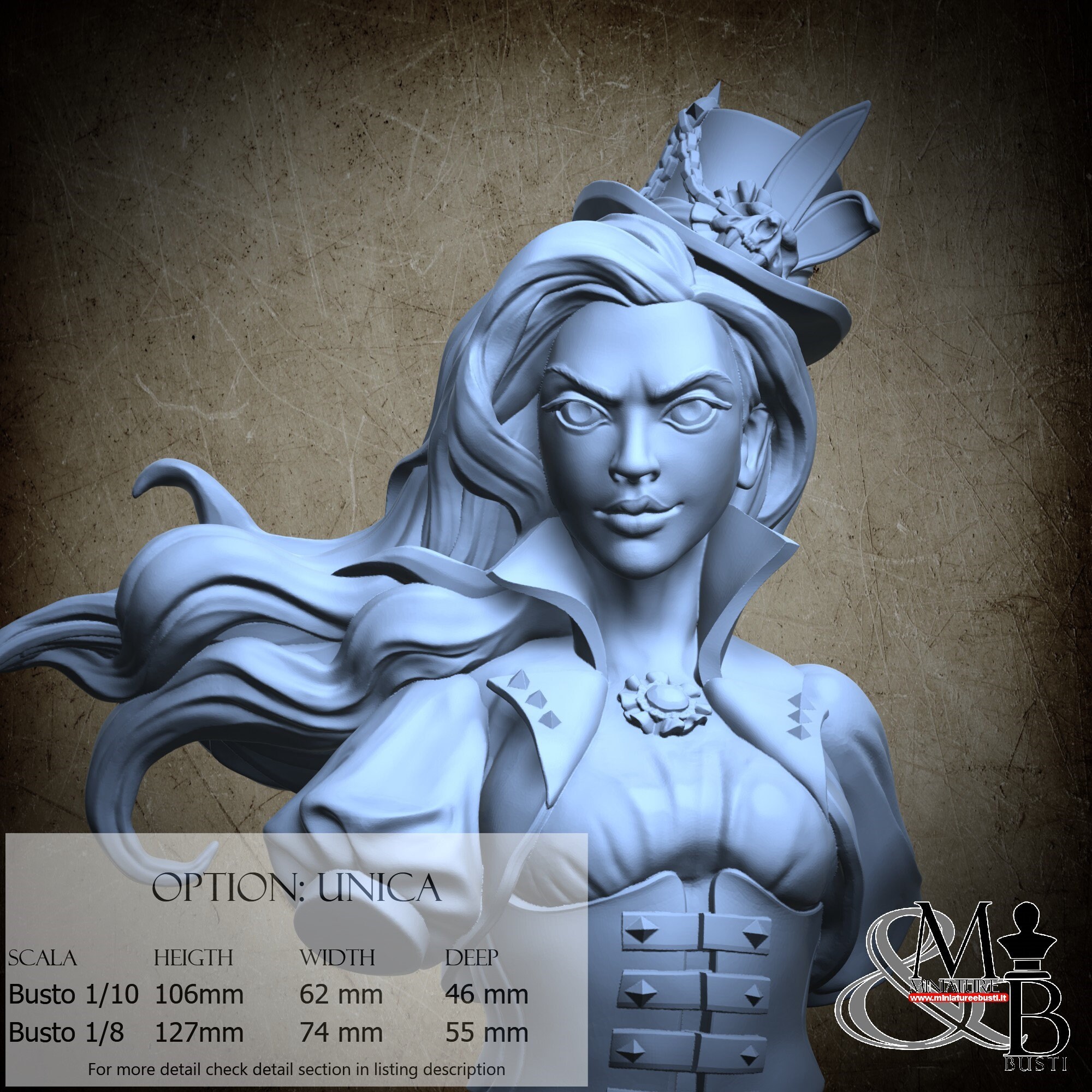 Bust Scale 1/10, cost €. 35.00 (Height: 106 mm, Width: 62 mm, Depth: 46 mm), composed of the following components: