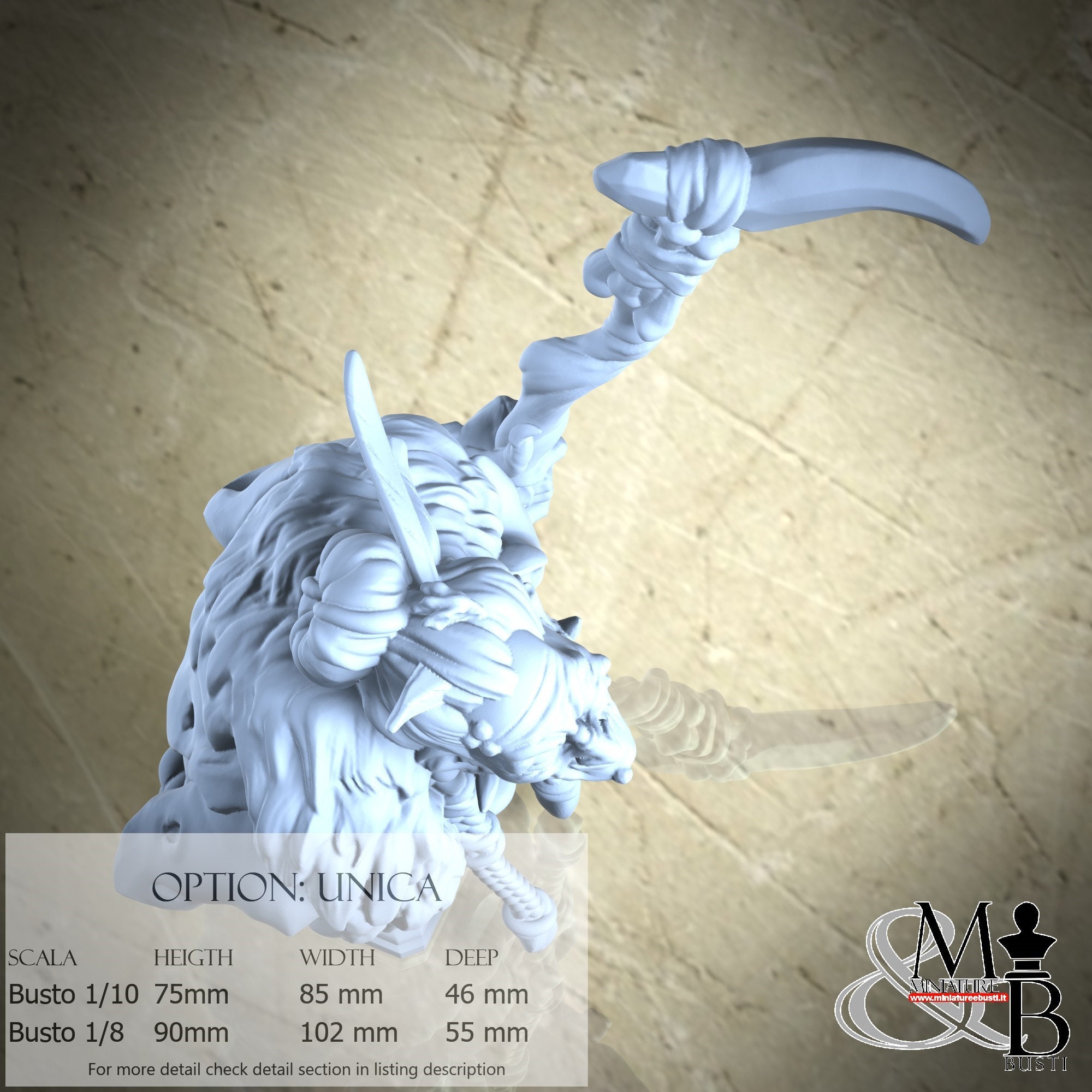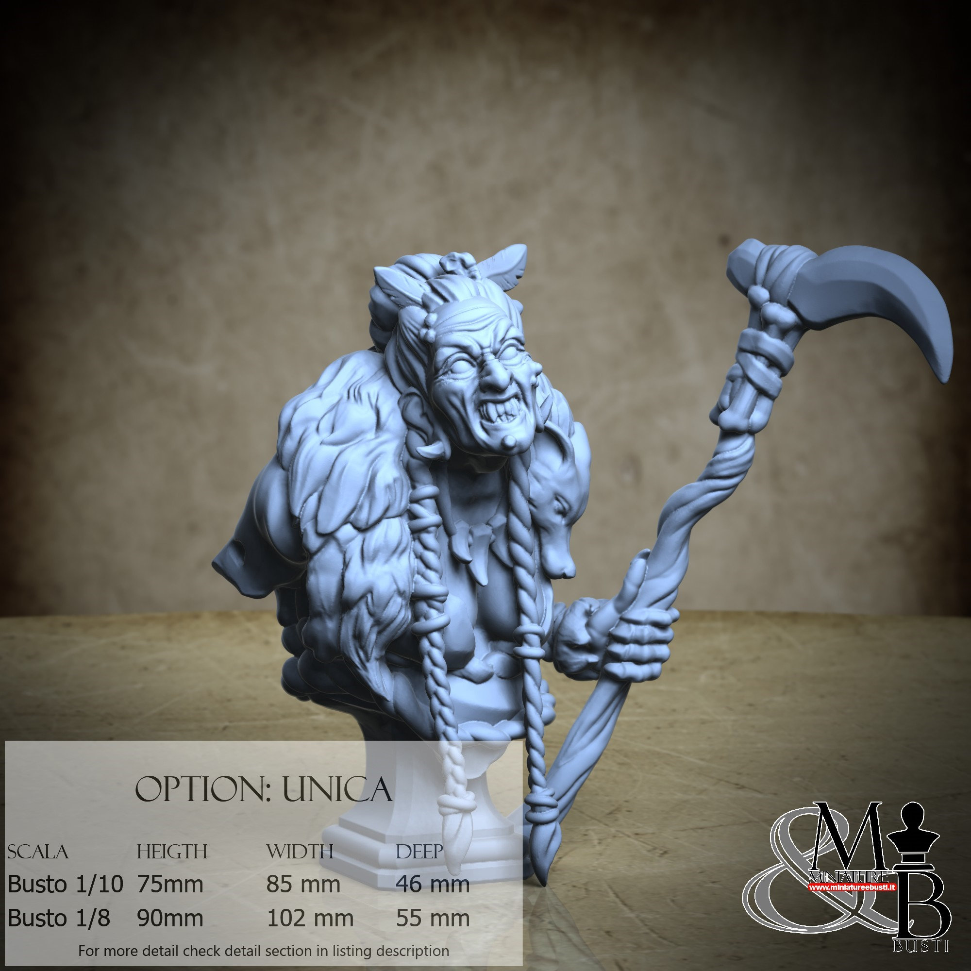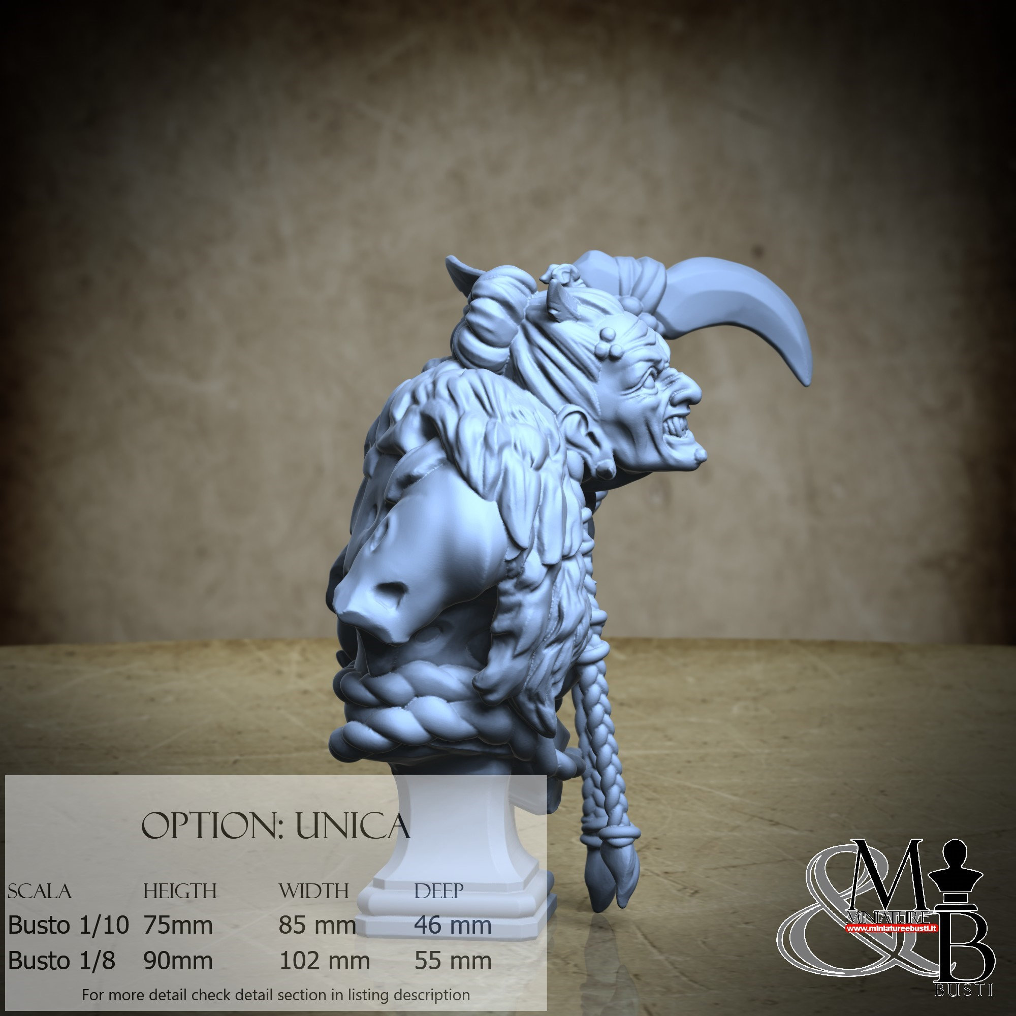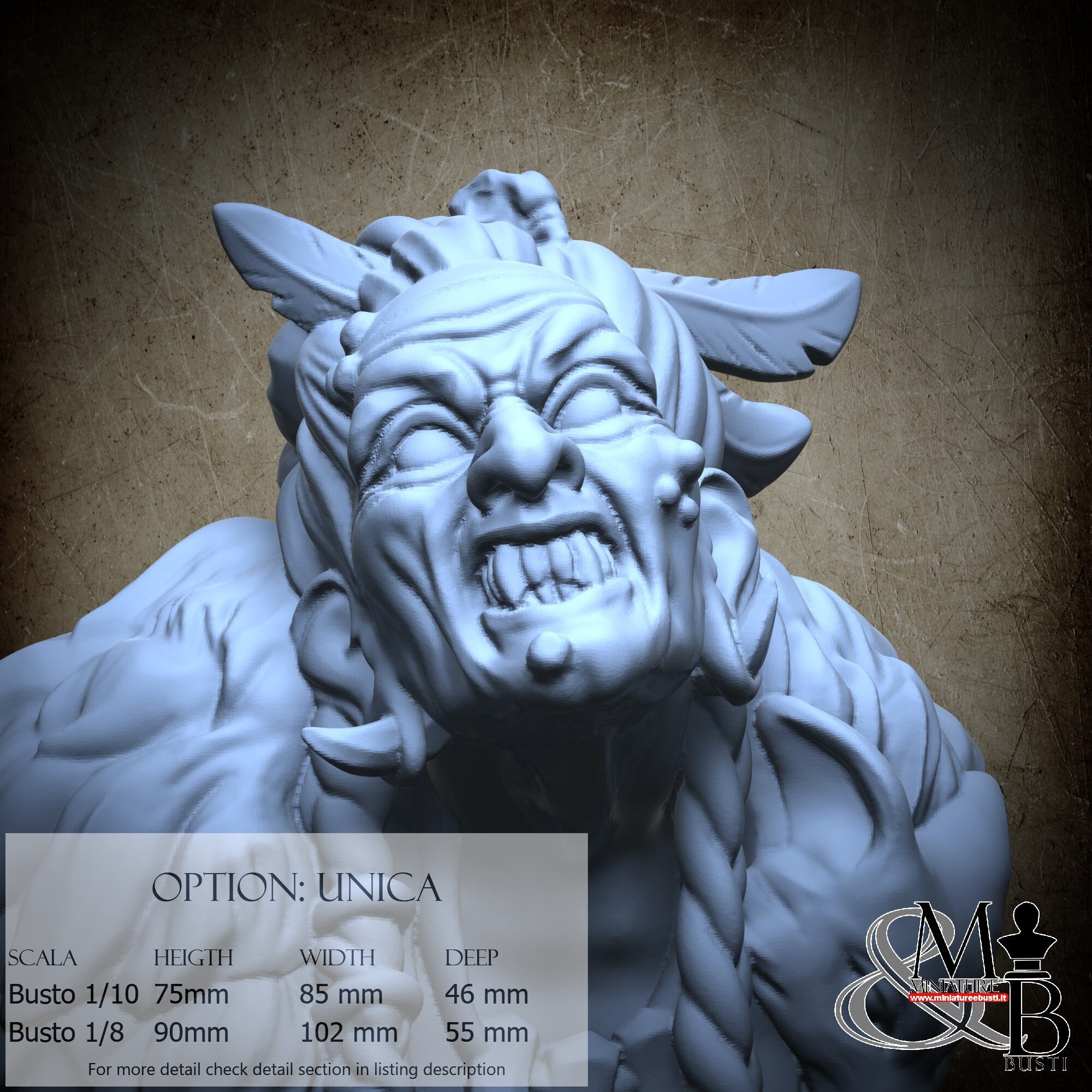 1/8 Bust Scale, cost €45.00 (Height: 90 mm, Width: 102 mm, Depth: 55 mm), composed of the following components: