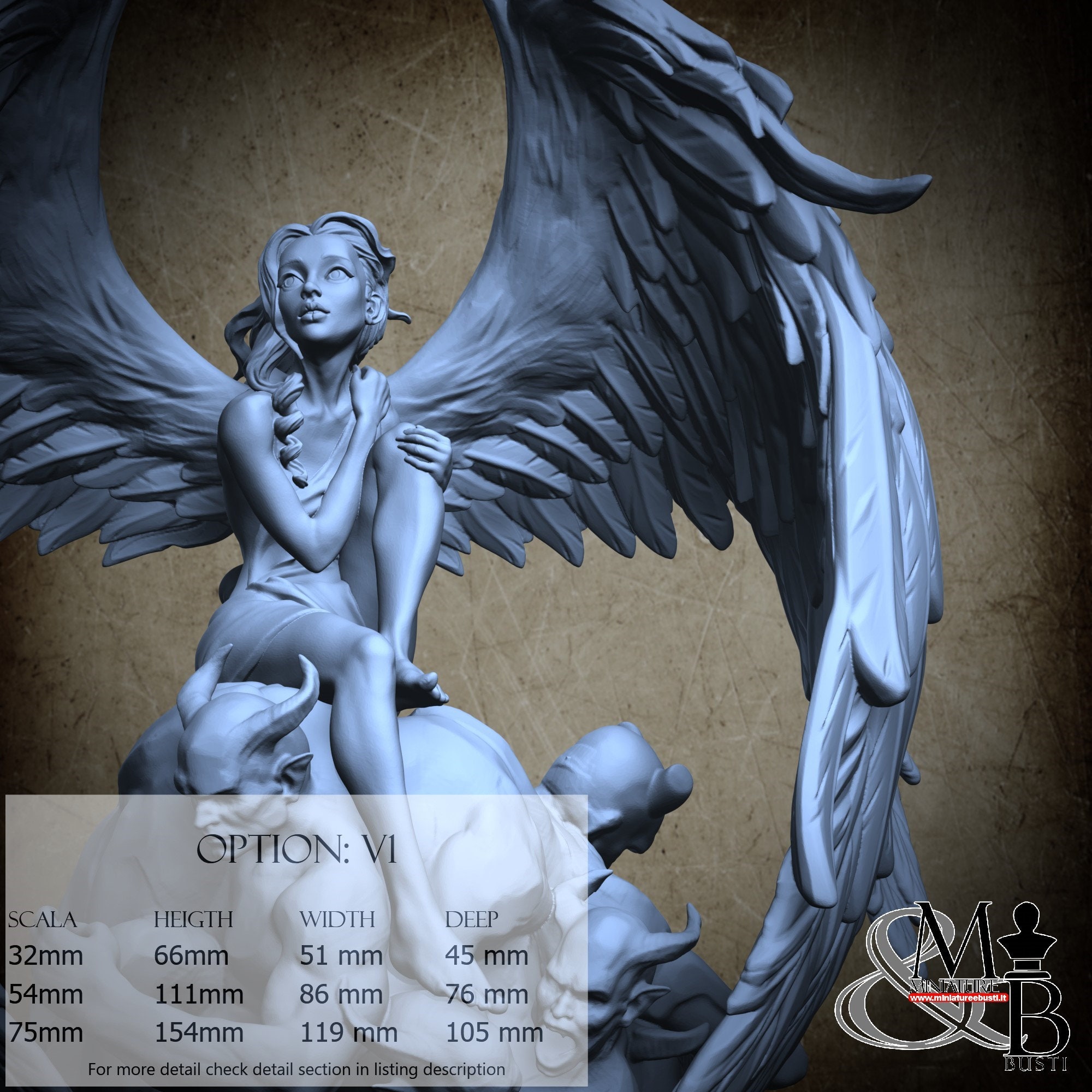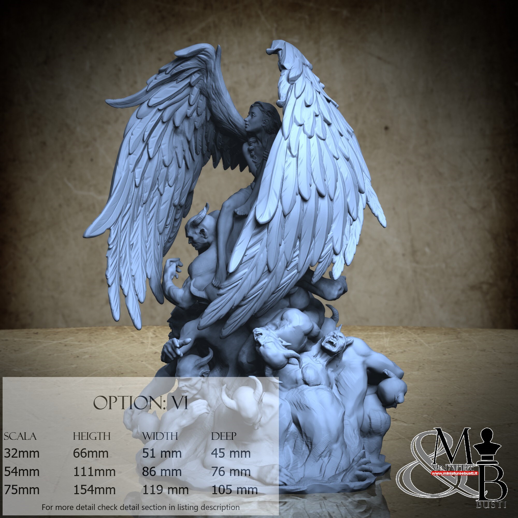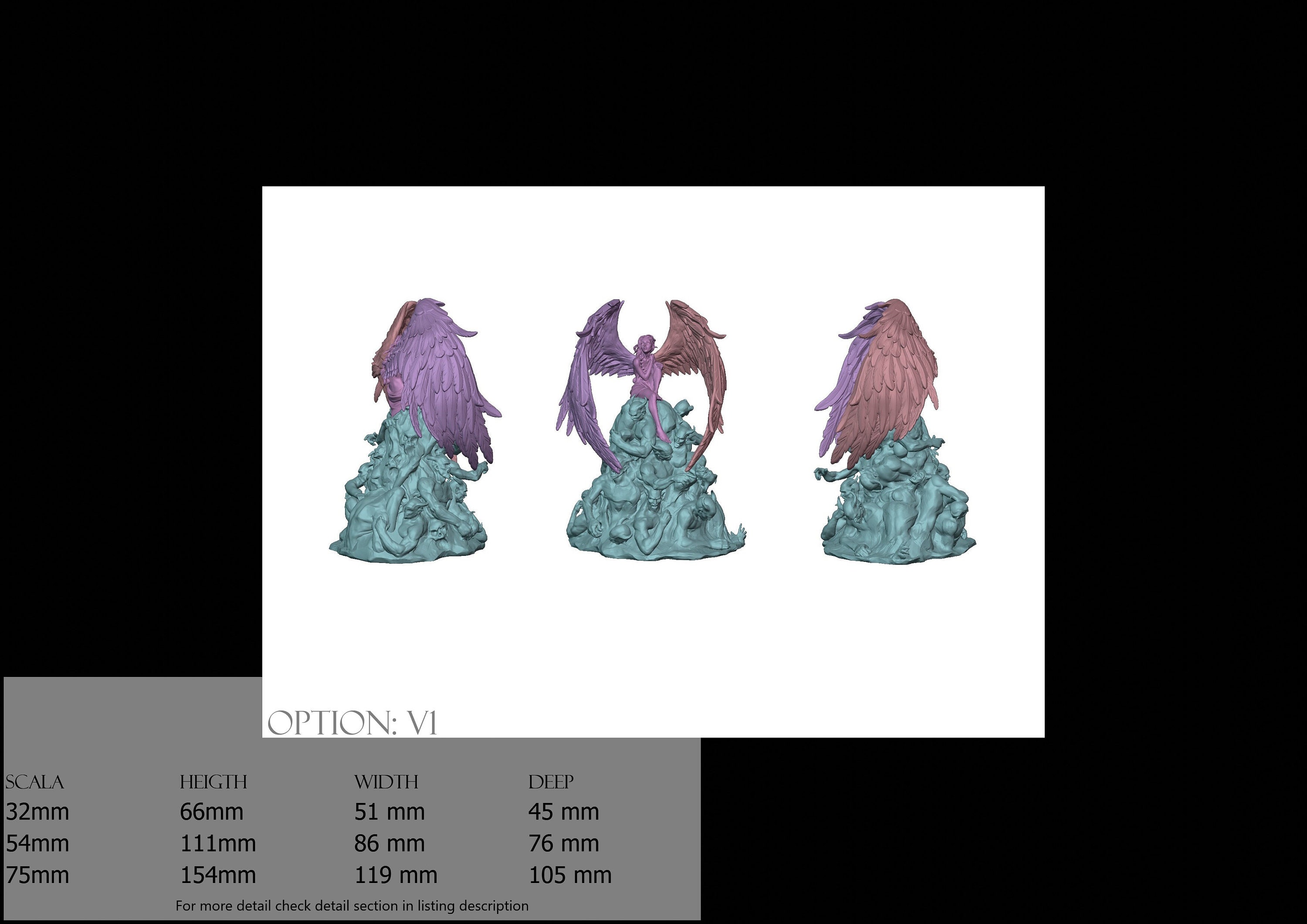 - Figure (1 piece) in Resin: Height: 65 mm, Width: 28 mm, Depth: 42 mm