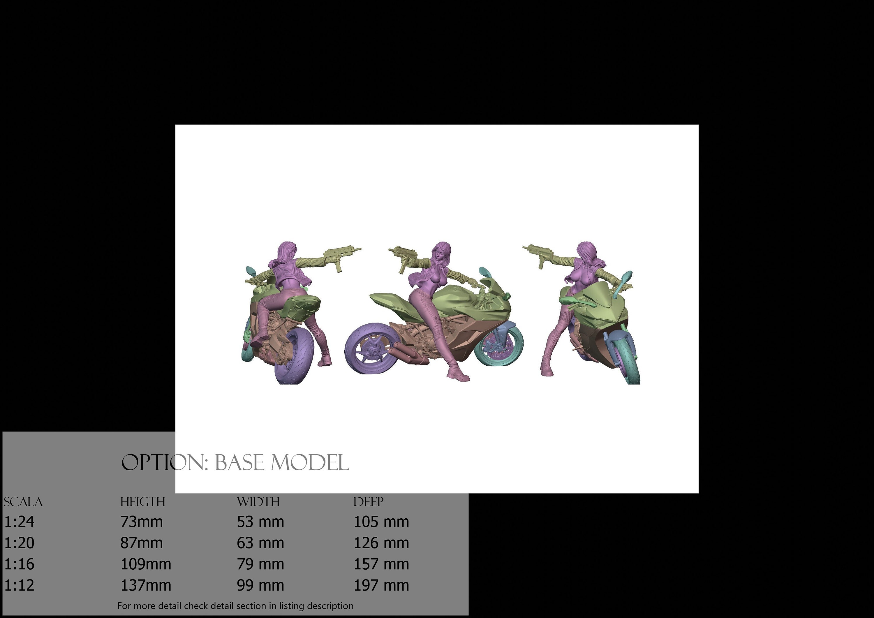 - Moto (13 pezzi) in Resina : Altezza: 58 mm, Larghezza: 43 mm, Profondità: 105 mm