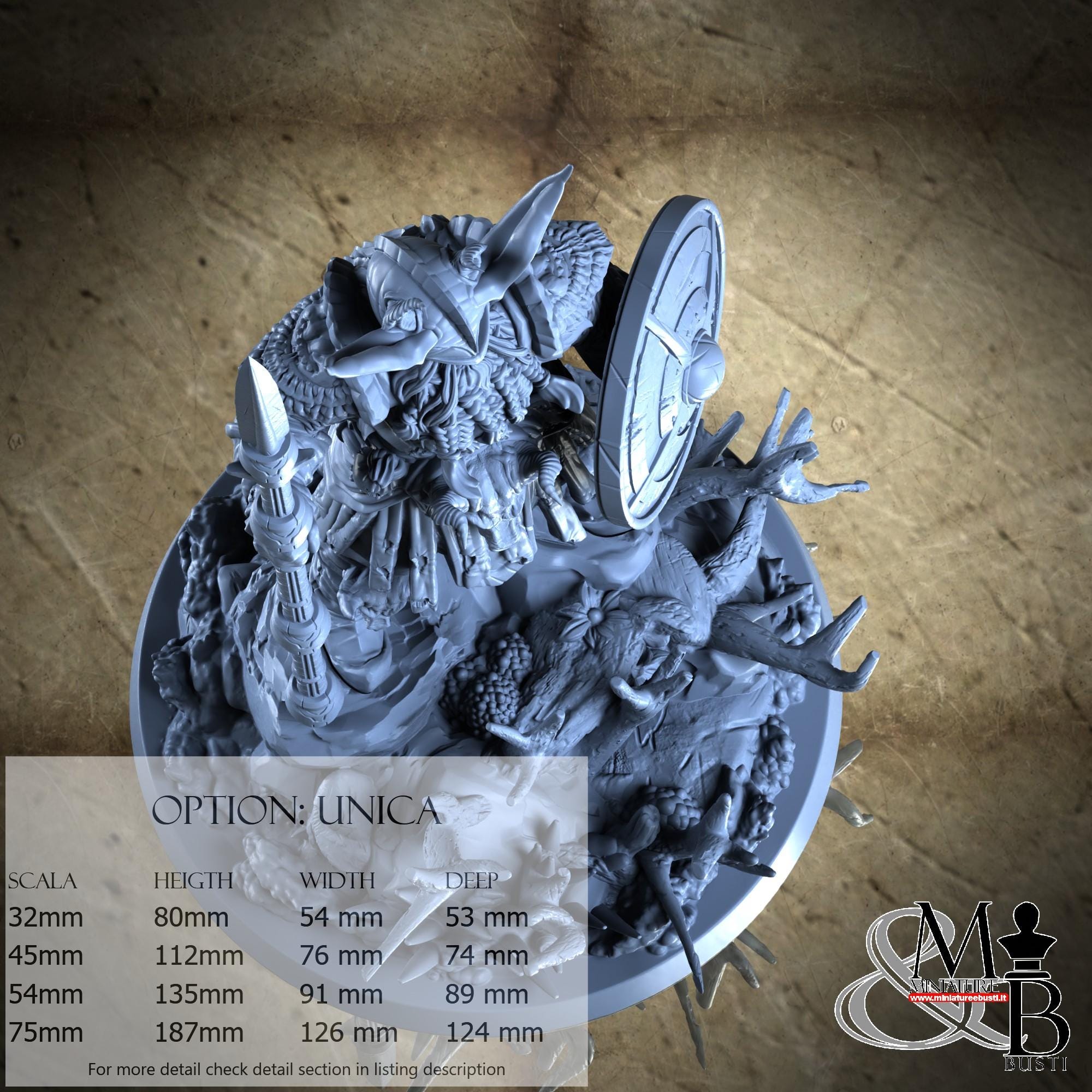 - Base (1 piece) in Resin: Height: 32 mm, Width: 76 mm, Depth: 74 mm