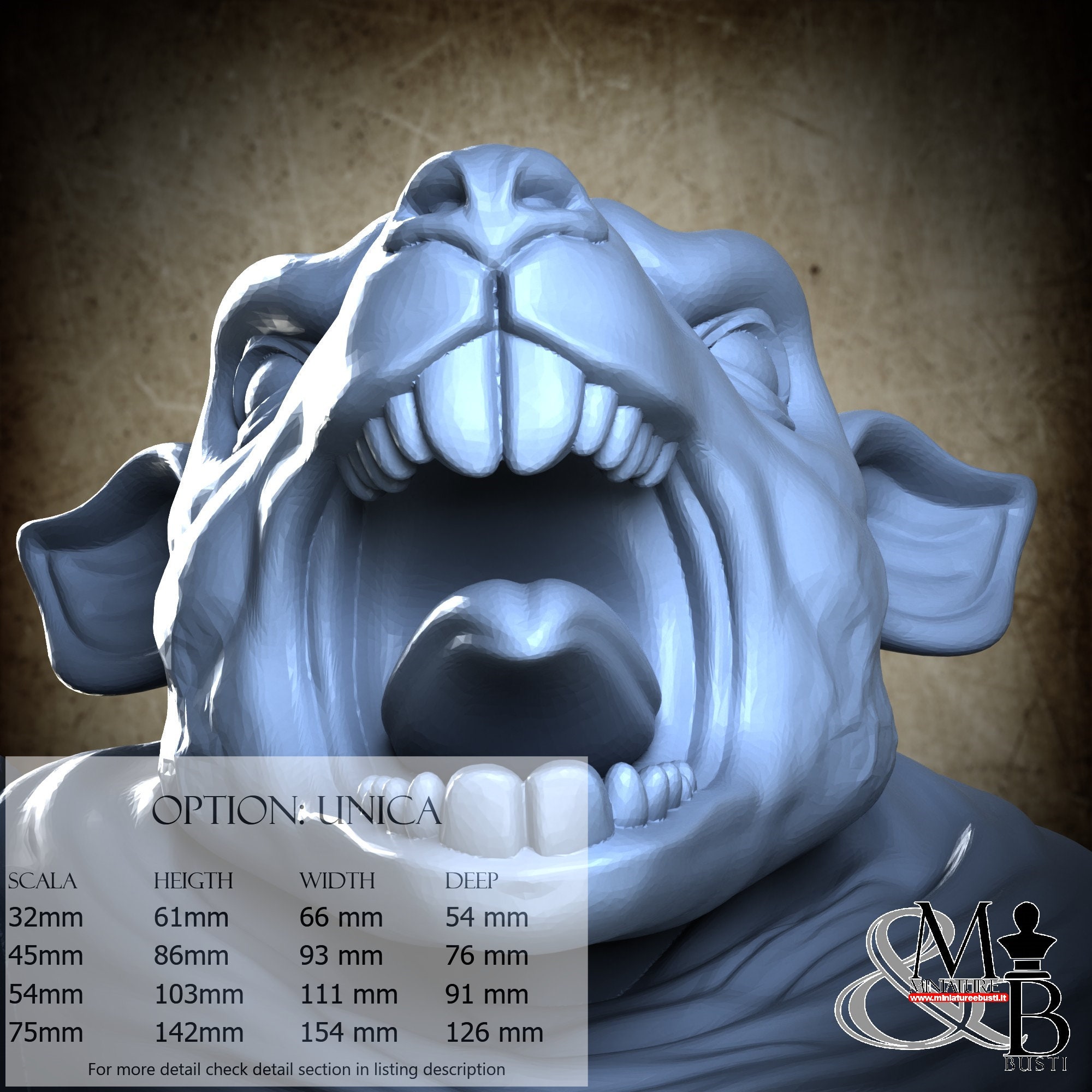 - Figure (1 piece) in Resin: Height: 77 mm, Width: 93 mm, Depth: 56 mm