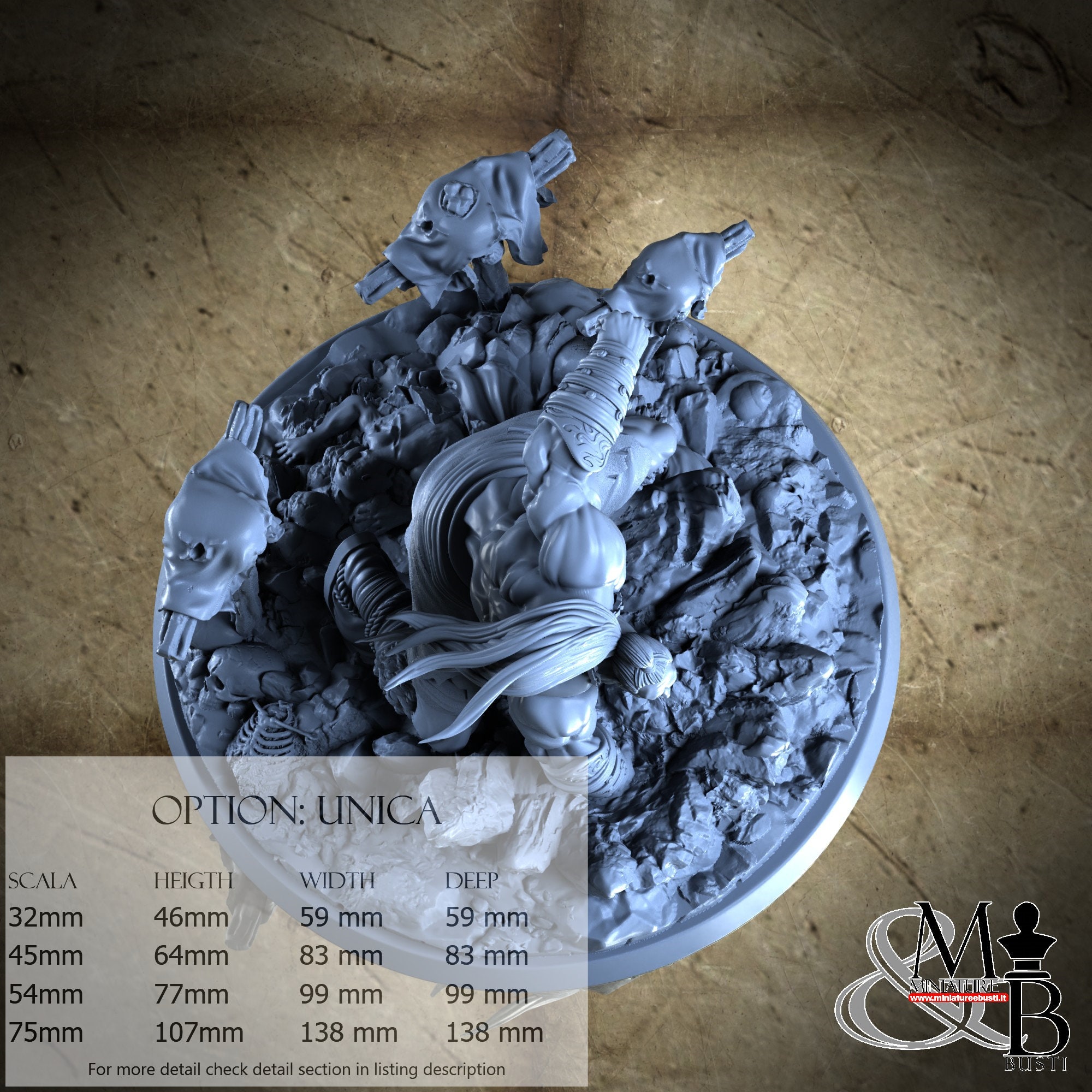 - Base (1 piece) in Resin: Height: 72 mm, Width: 99 mm, Depth: 99 mm
