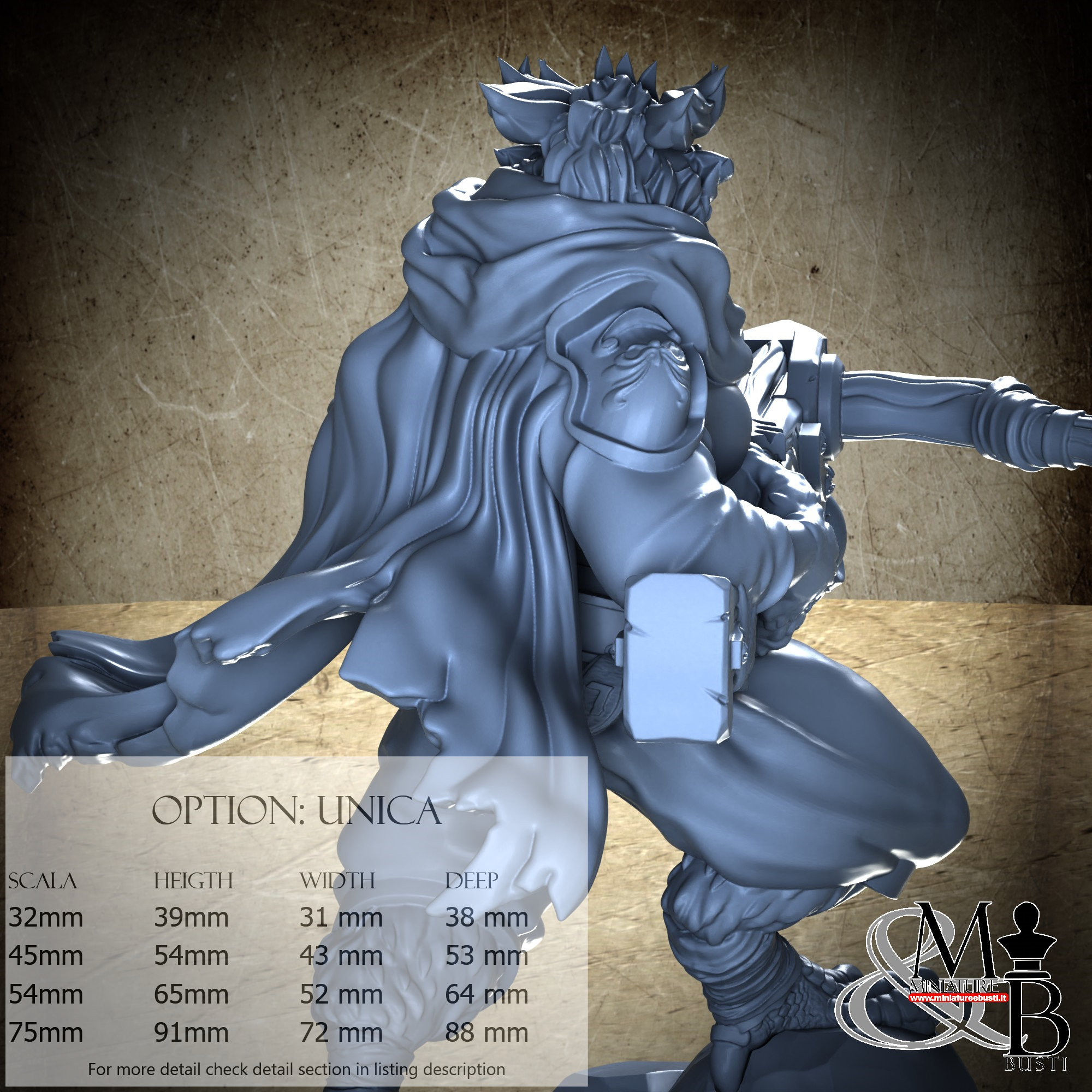 - Figure (1 piece) in Resin: Height: 35 mm, Width: 25 mm, Depth: 36 mm