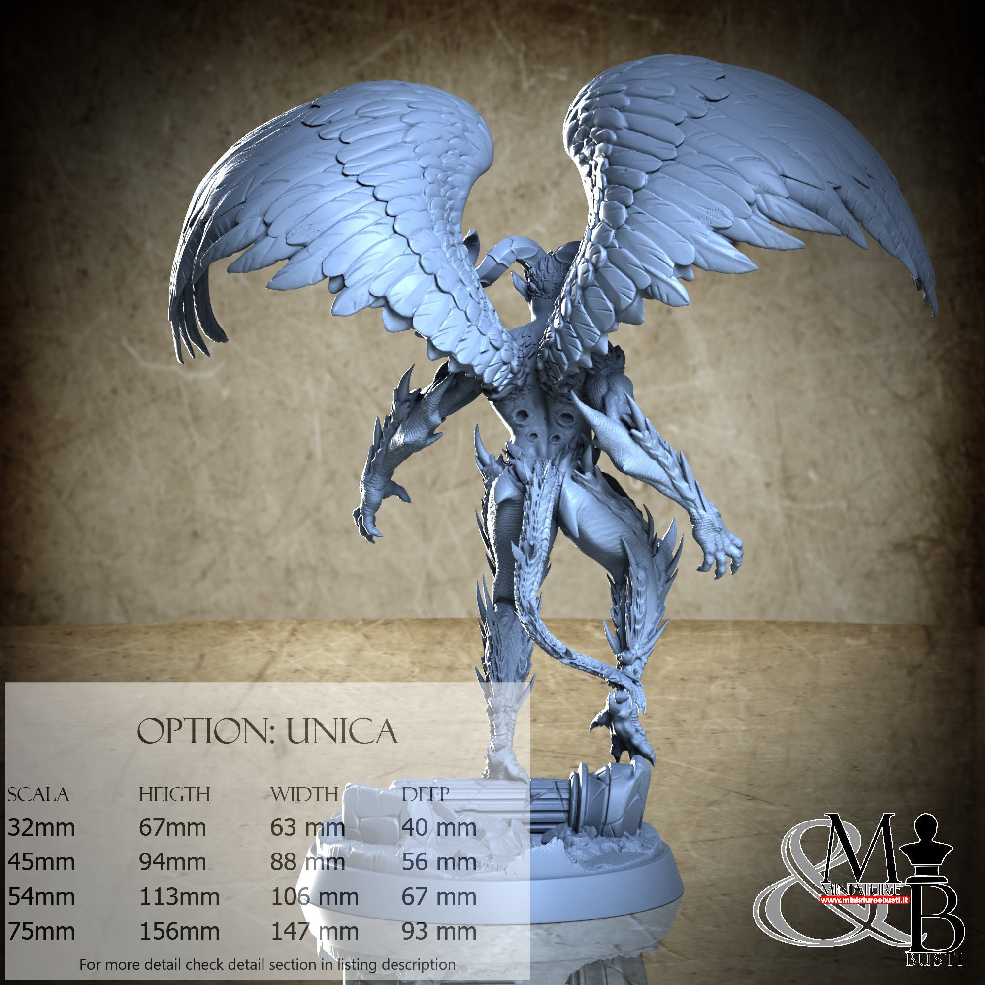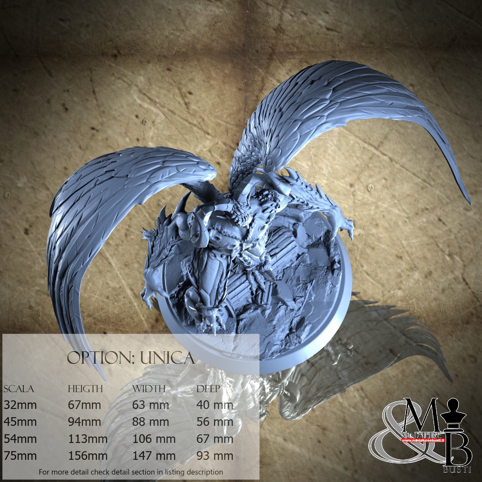 - Base (1 piece) in Resin: Height: 23 mm, Width: 72 mm, Depth: 72 mm