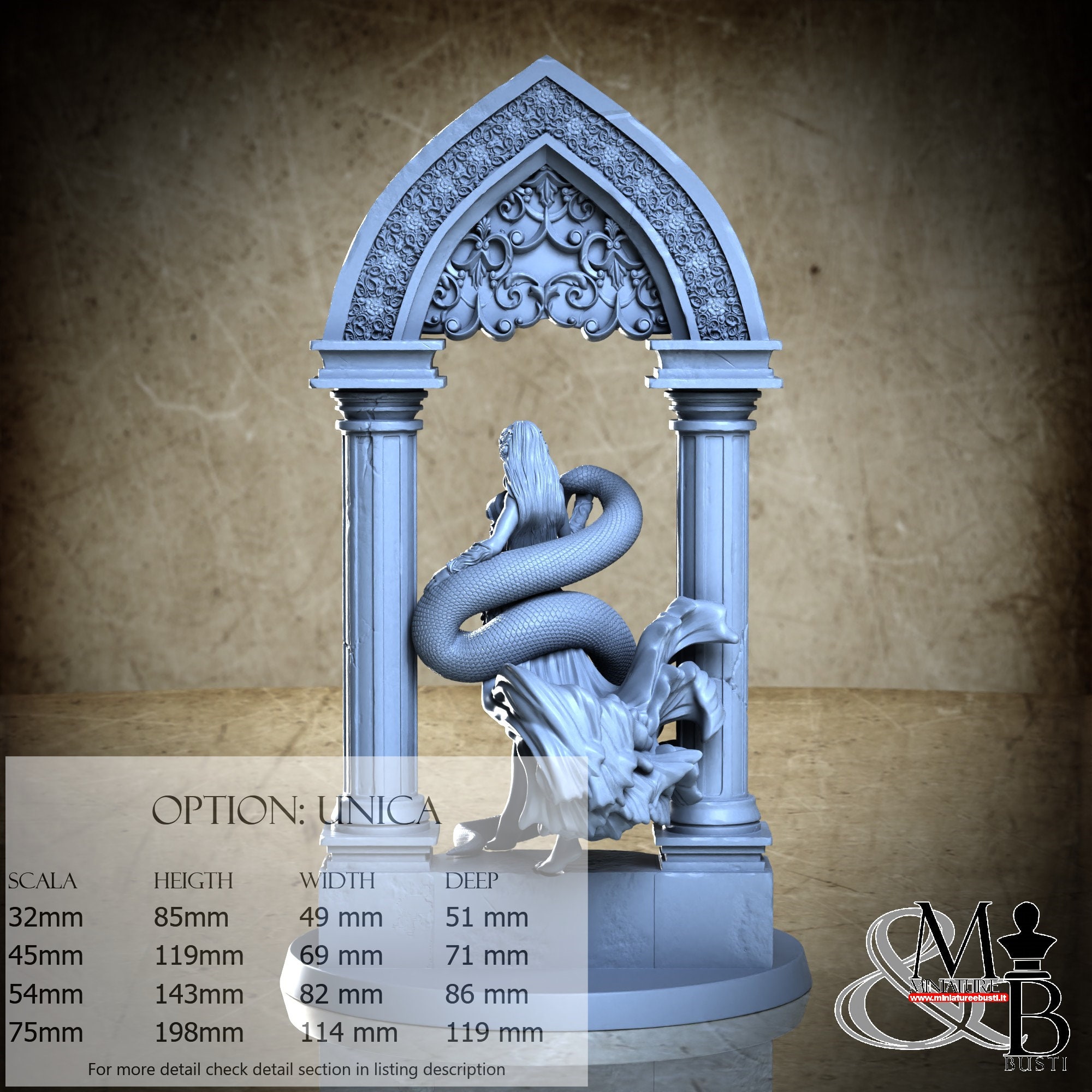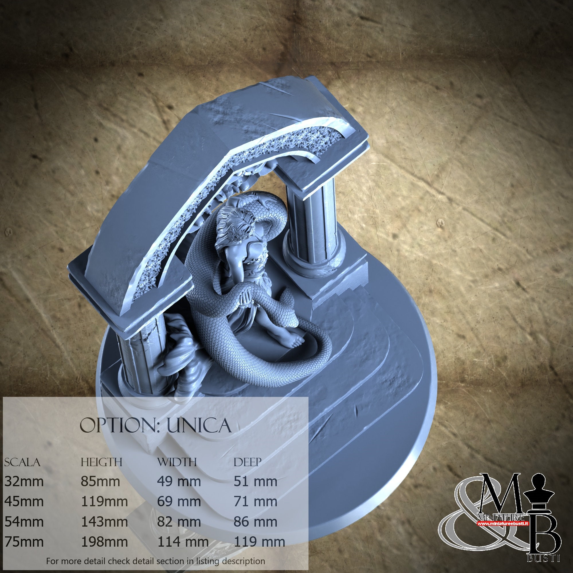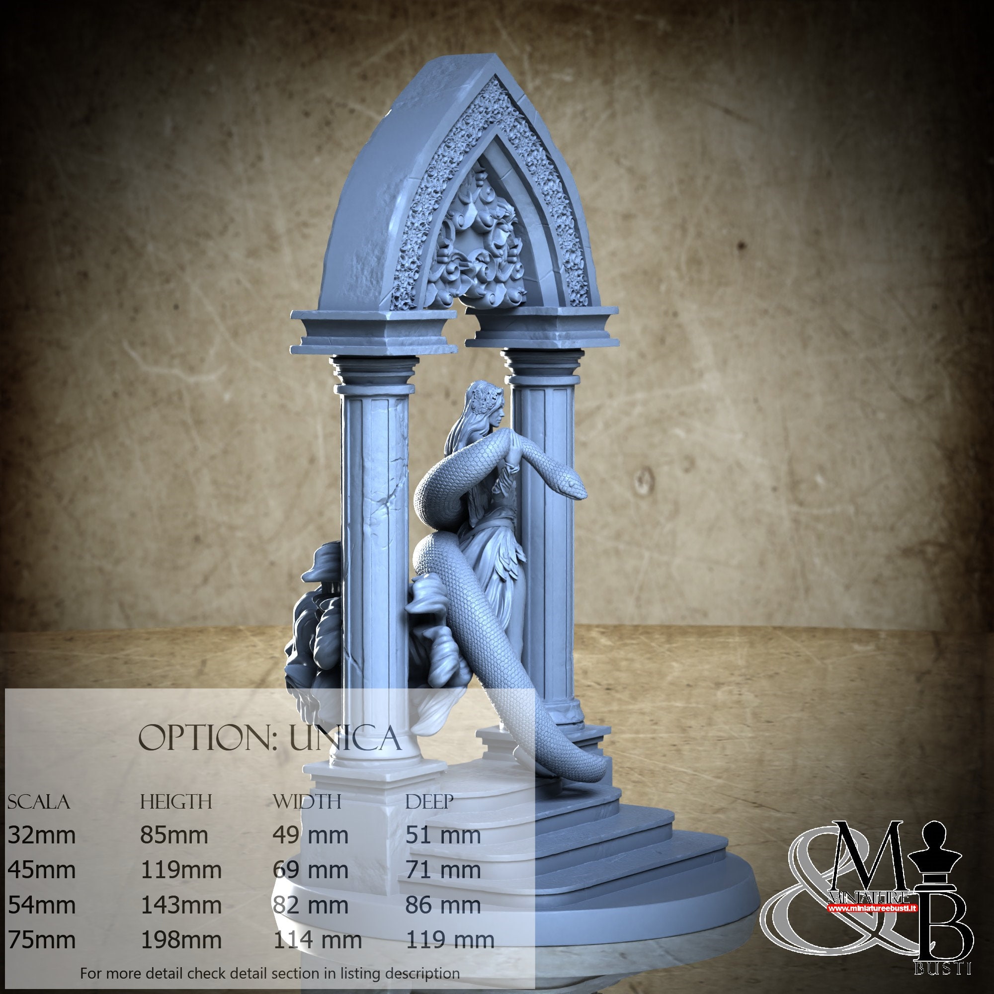 - Figure (1 piece) in Resin: Height: 56 mm, Width: 40 mm, Depth: 49 mm