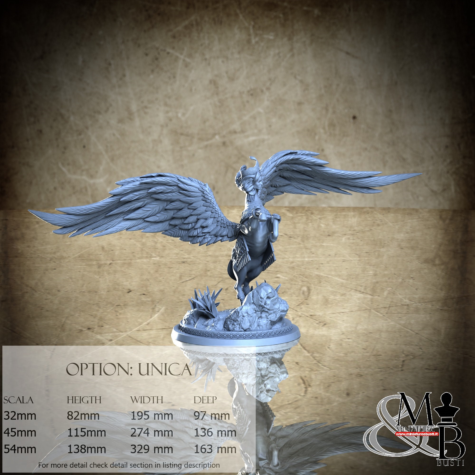 - Base (1 piece) in Resin: Height: 38 mm, Width: 82 mm, Depth: 82 mm