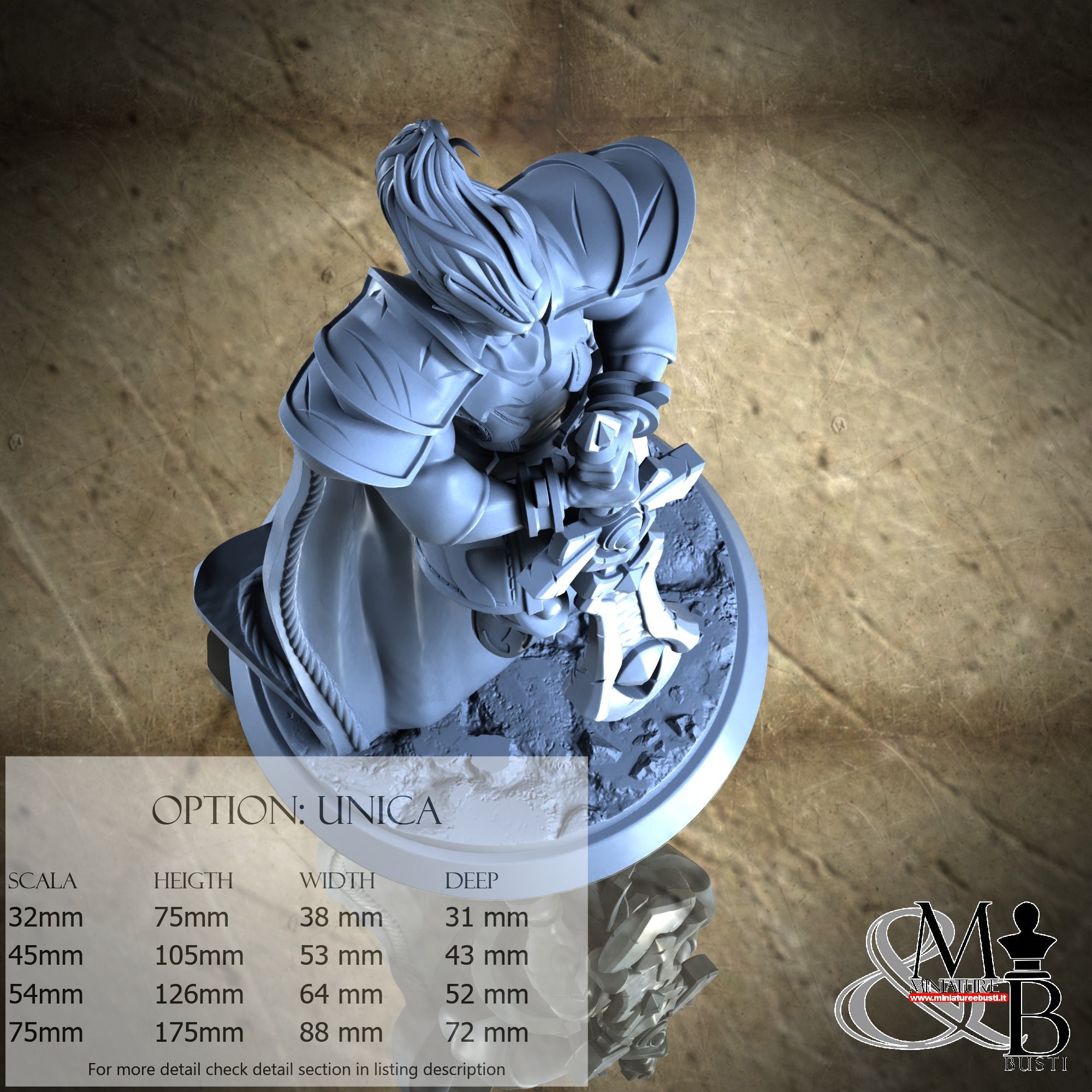 - Base (2 pieces) in Resin: Height: 75 mm, Width: 31 mm, Depth: 31 mm