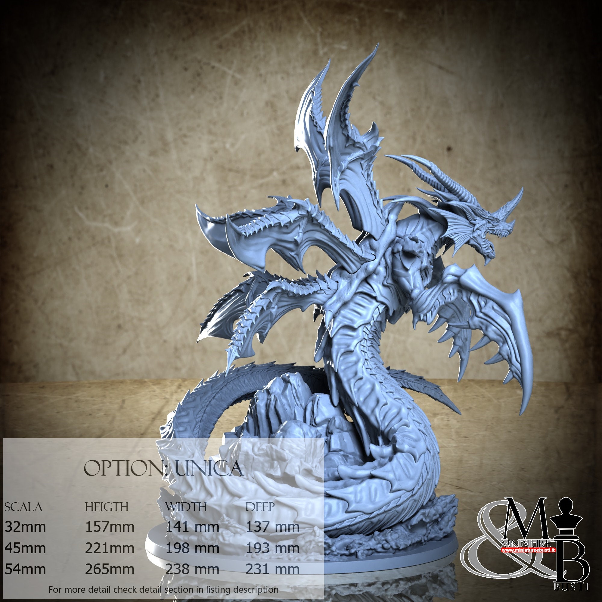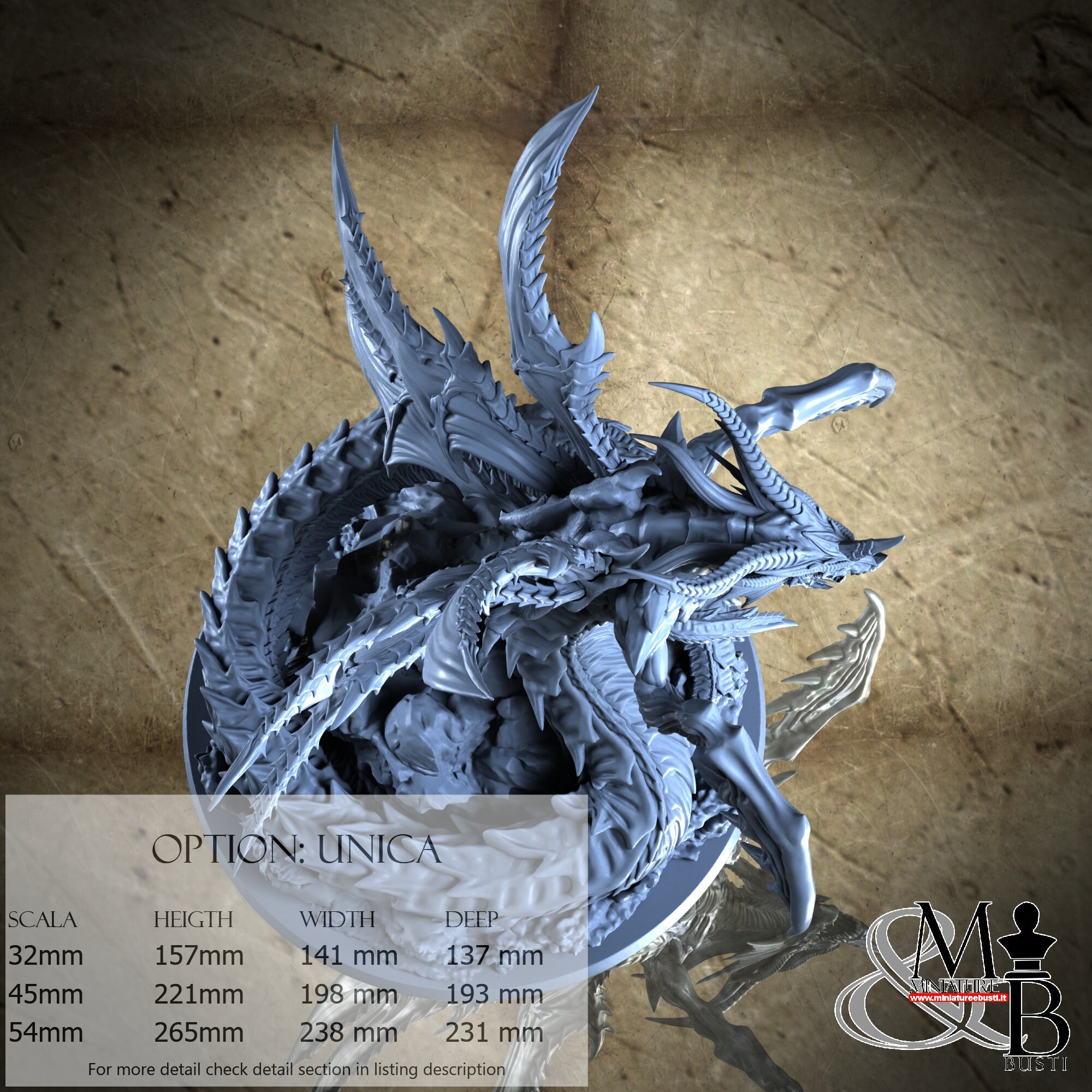 - Base (1 piece) in Resin: Height: 91 mm, Width: 169 mm, Depth: 169 mm