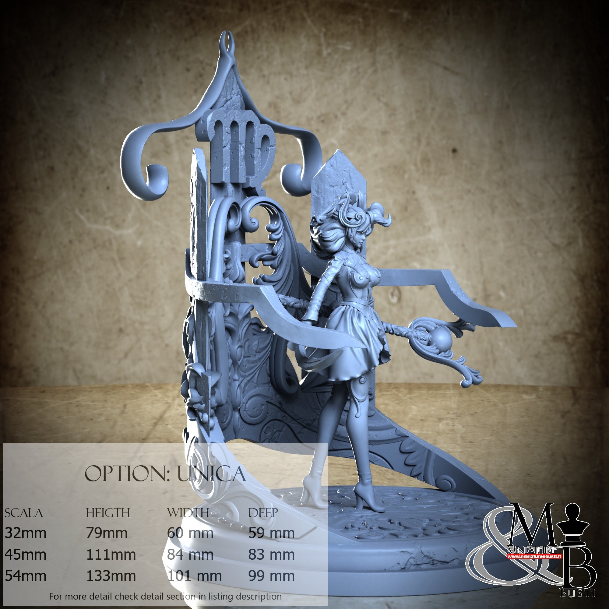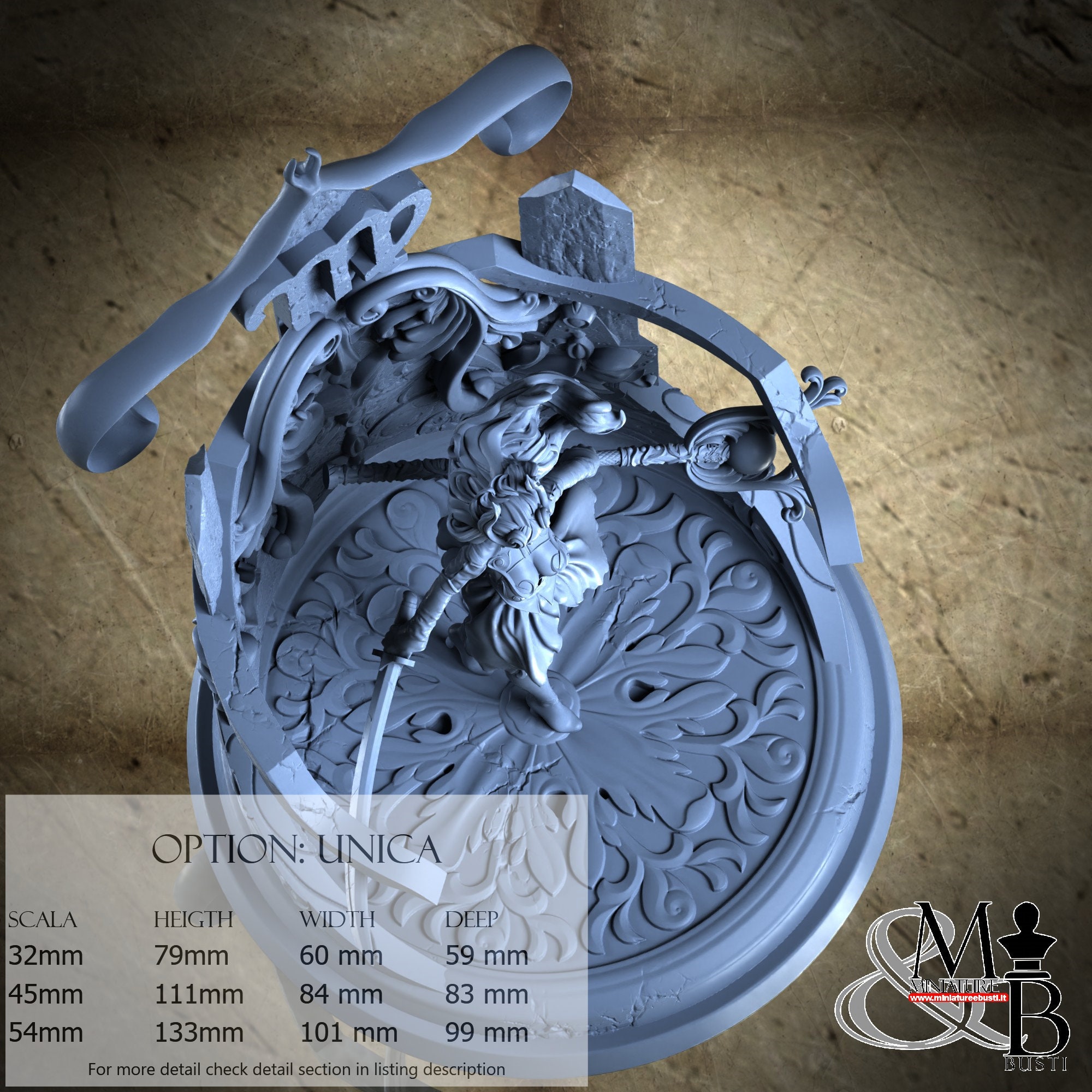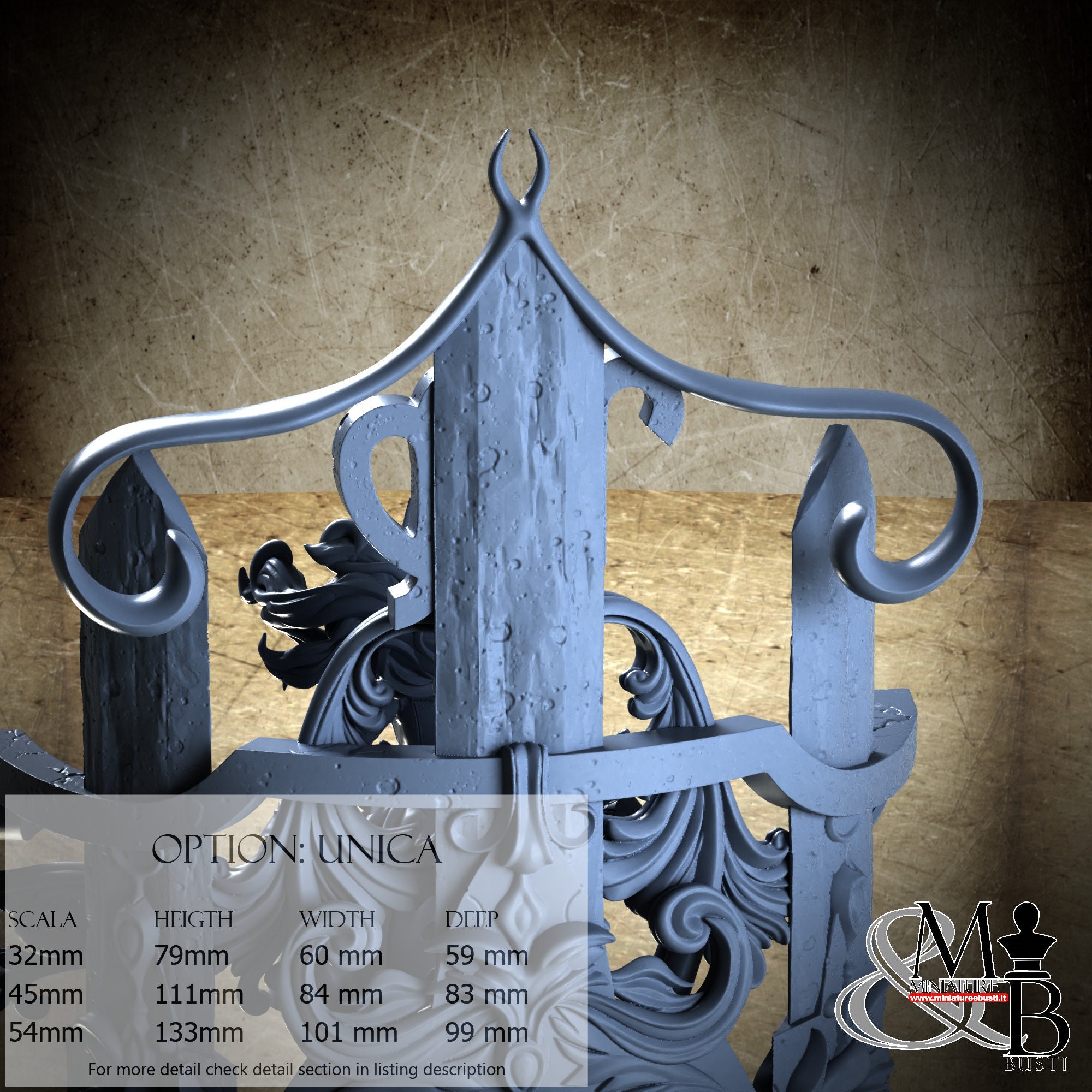 - Base (1 piece) in Resin: Height: 133 mm, Width: 99 mm, Depth: 99 mm