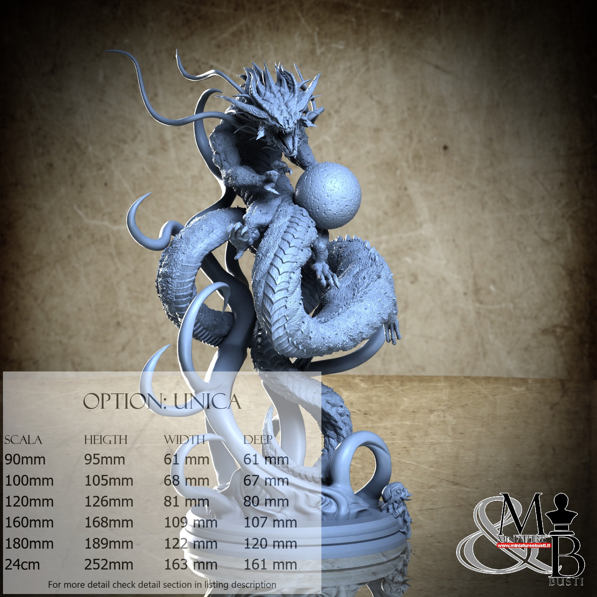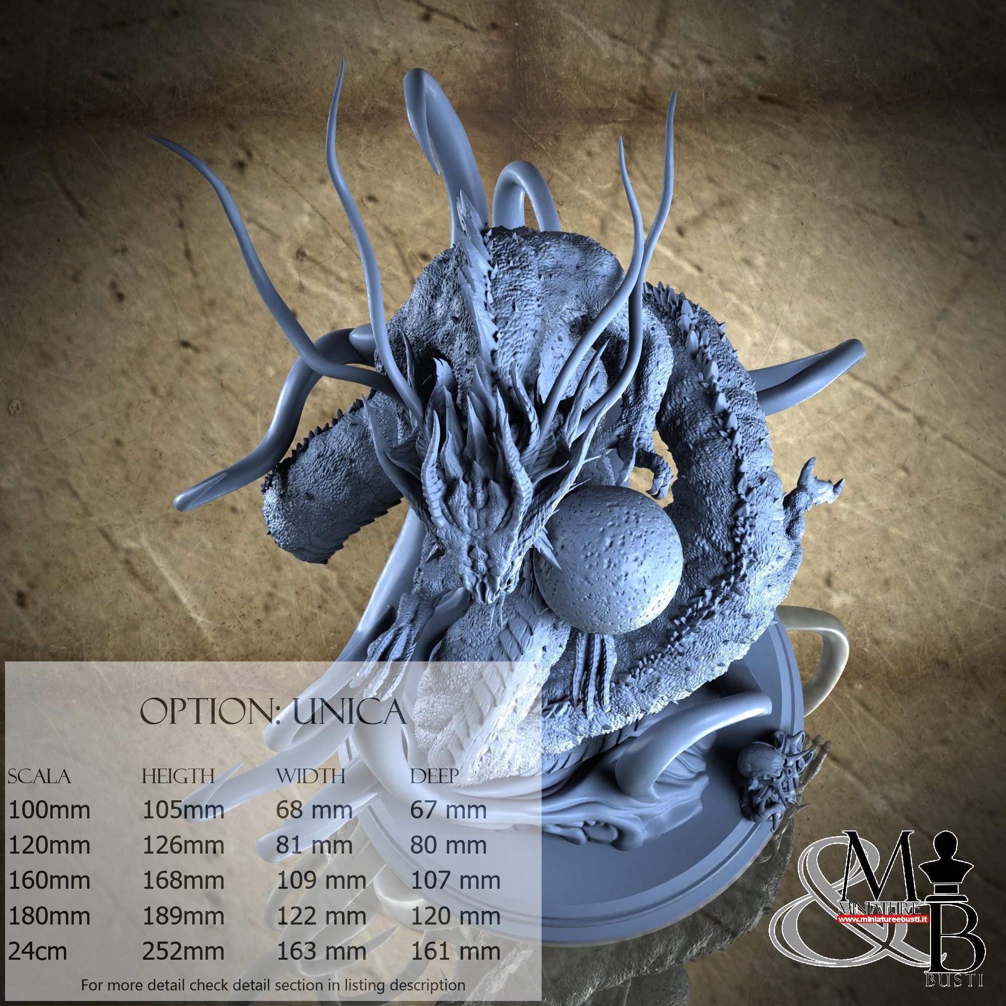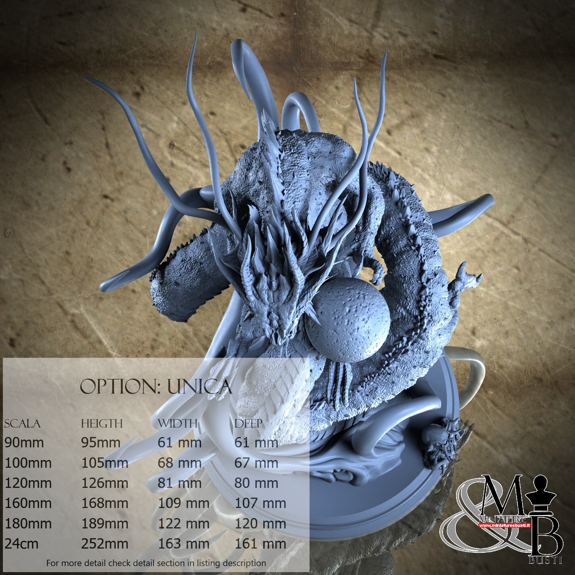 - Base (1 piece) in Resin: Height: 19 mm, Width: 77 mm, Depth: 79 mm