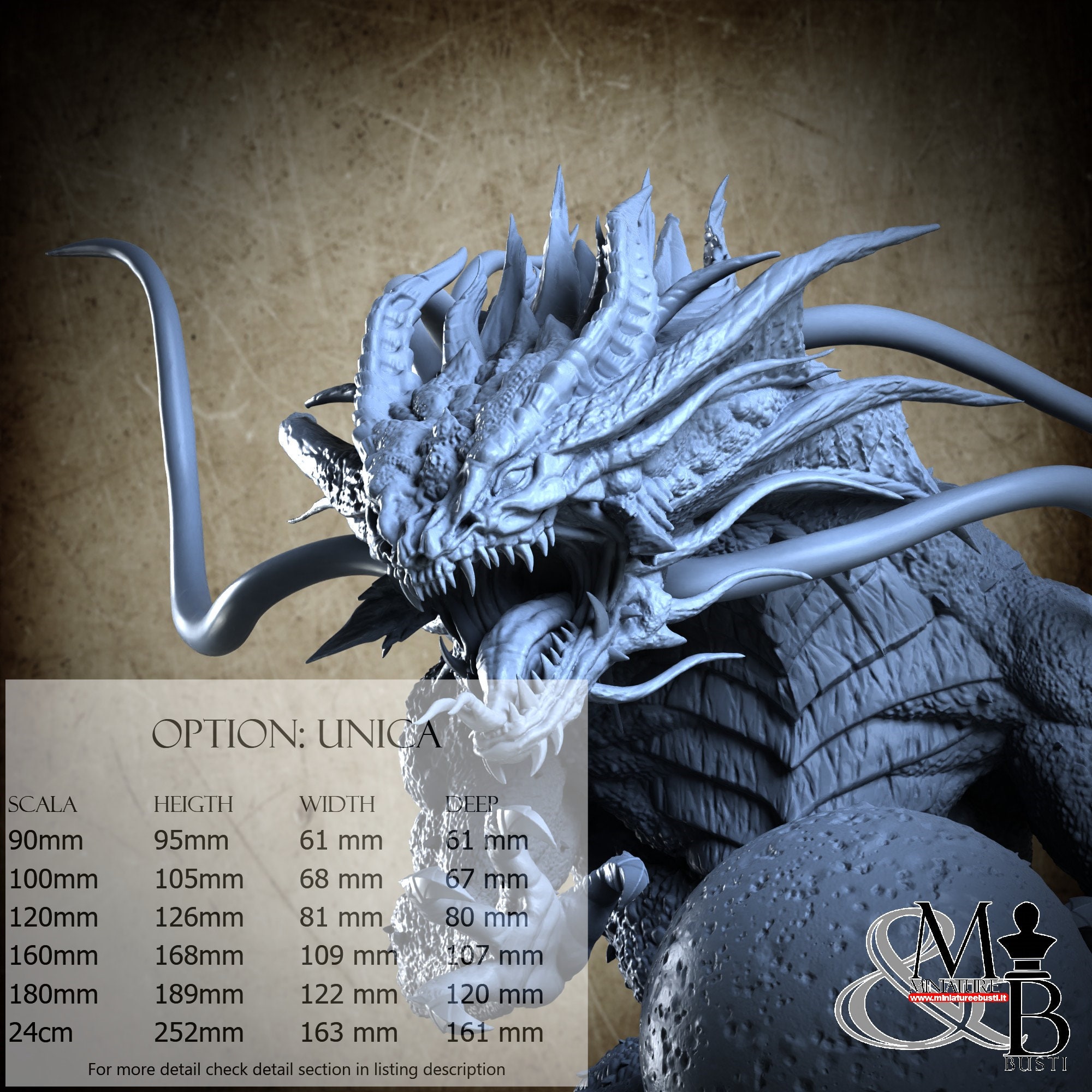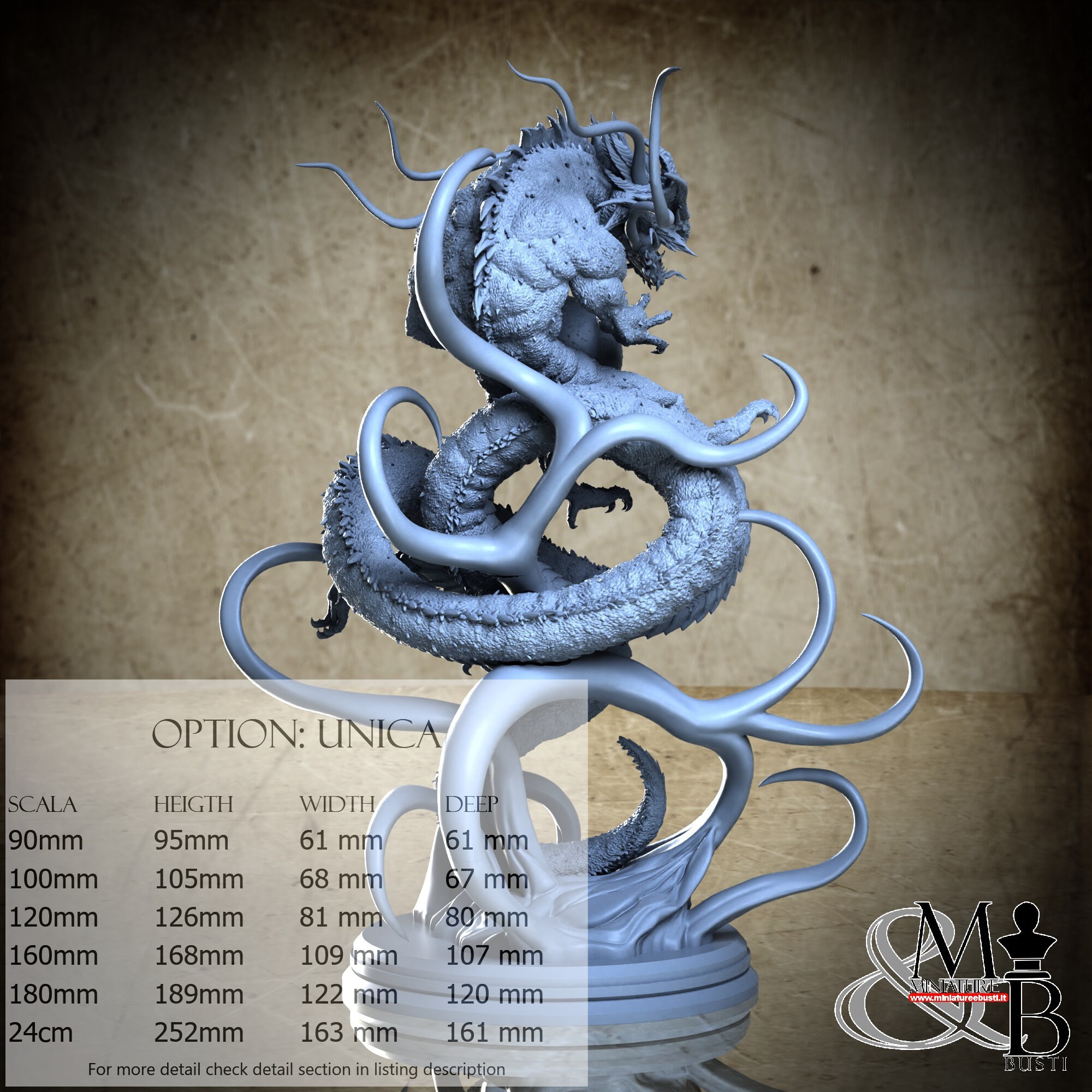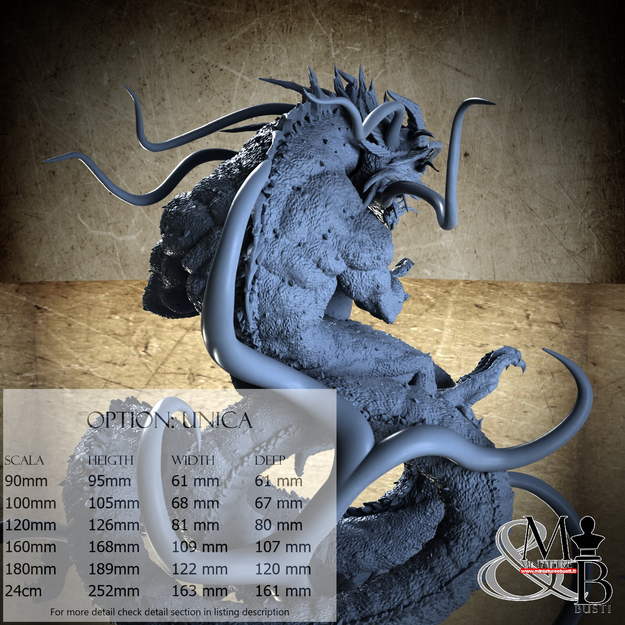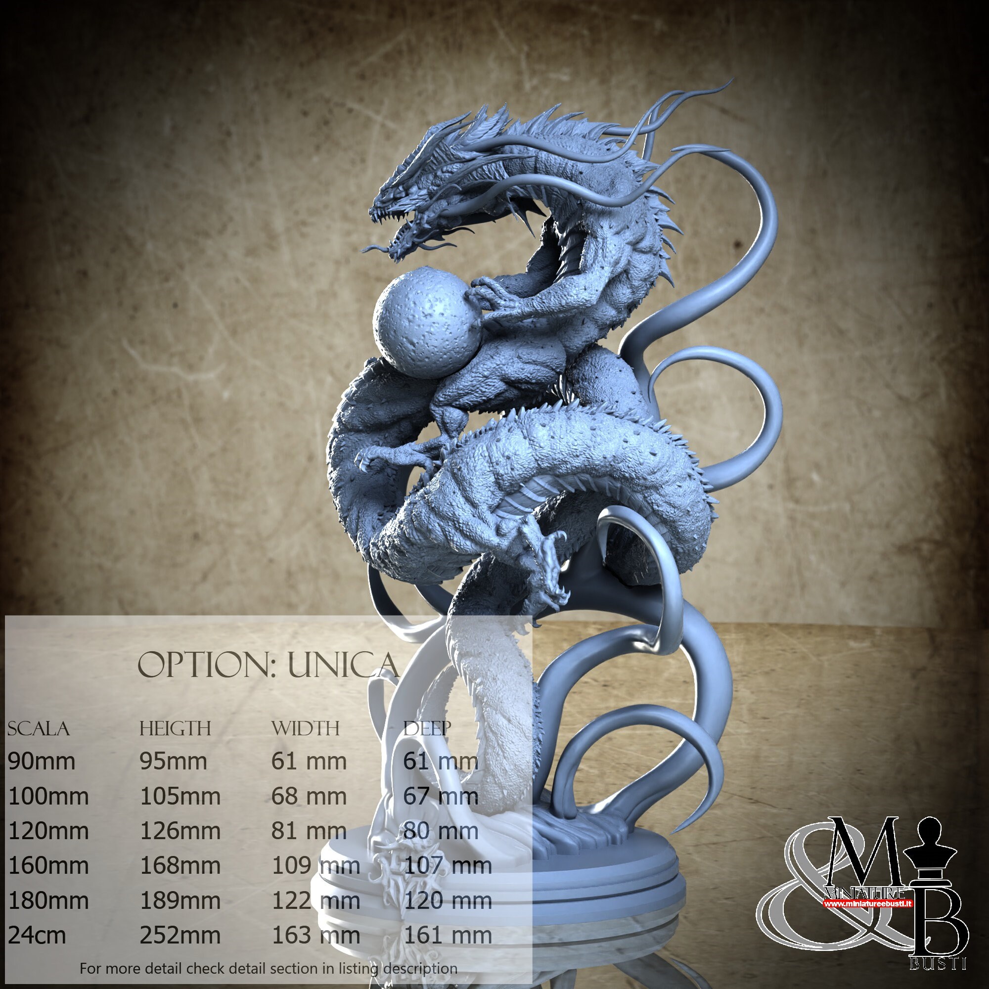 - Base (1 piece) in Resin: Height: 19 mm, Width: 77 mm, Depth: 79 mm
