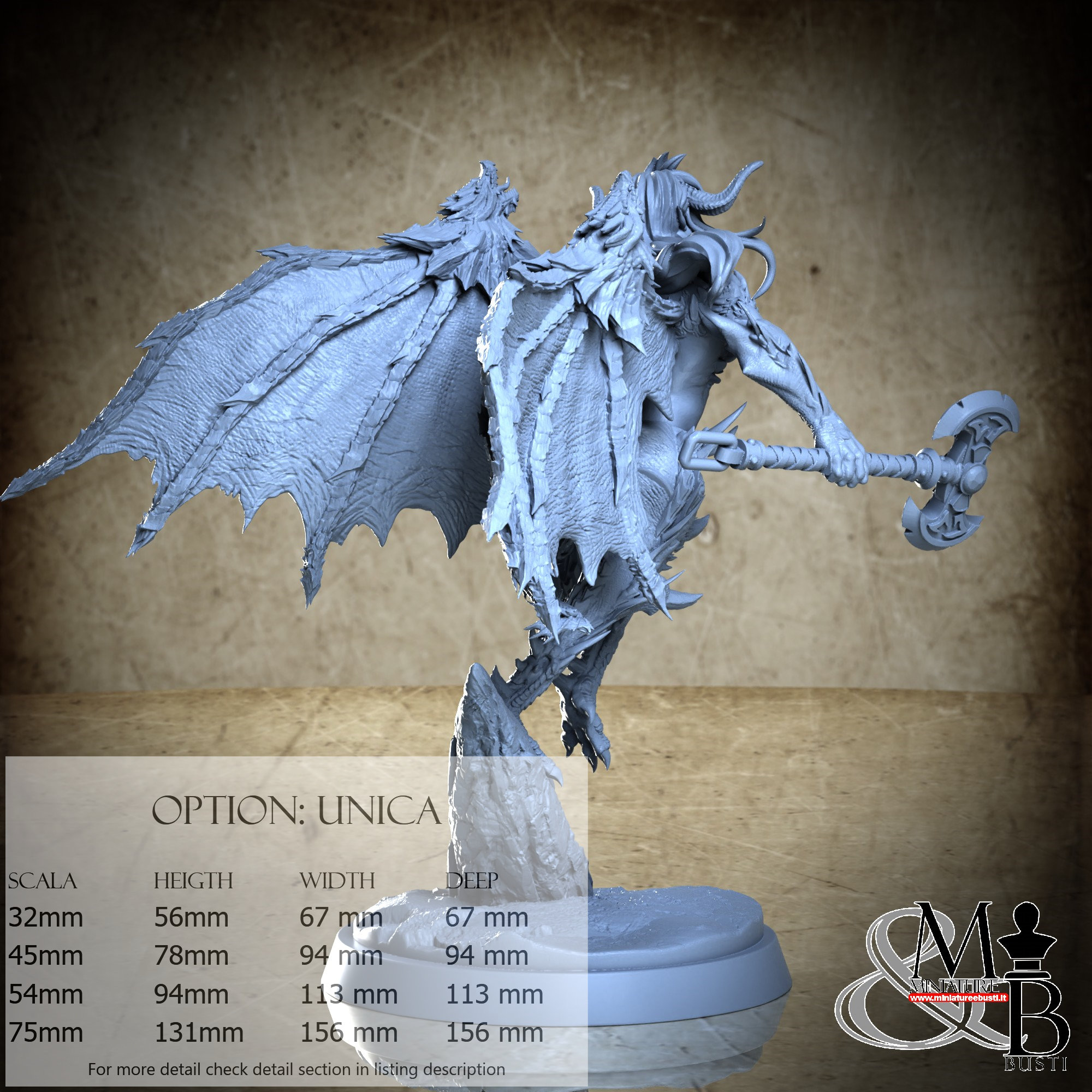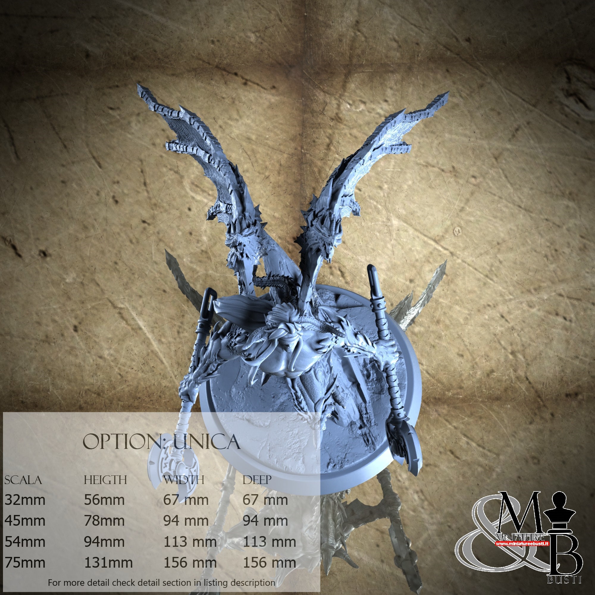 - Base (1 piece) in Resin: Height: 53 mm, Width: 72 mm, Depth: 77 mm