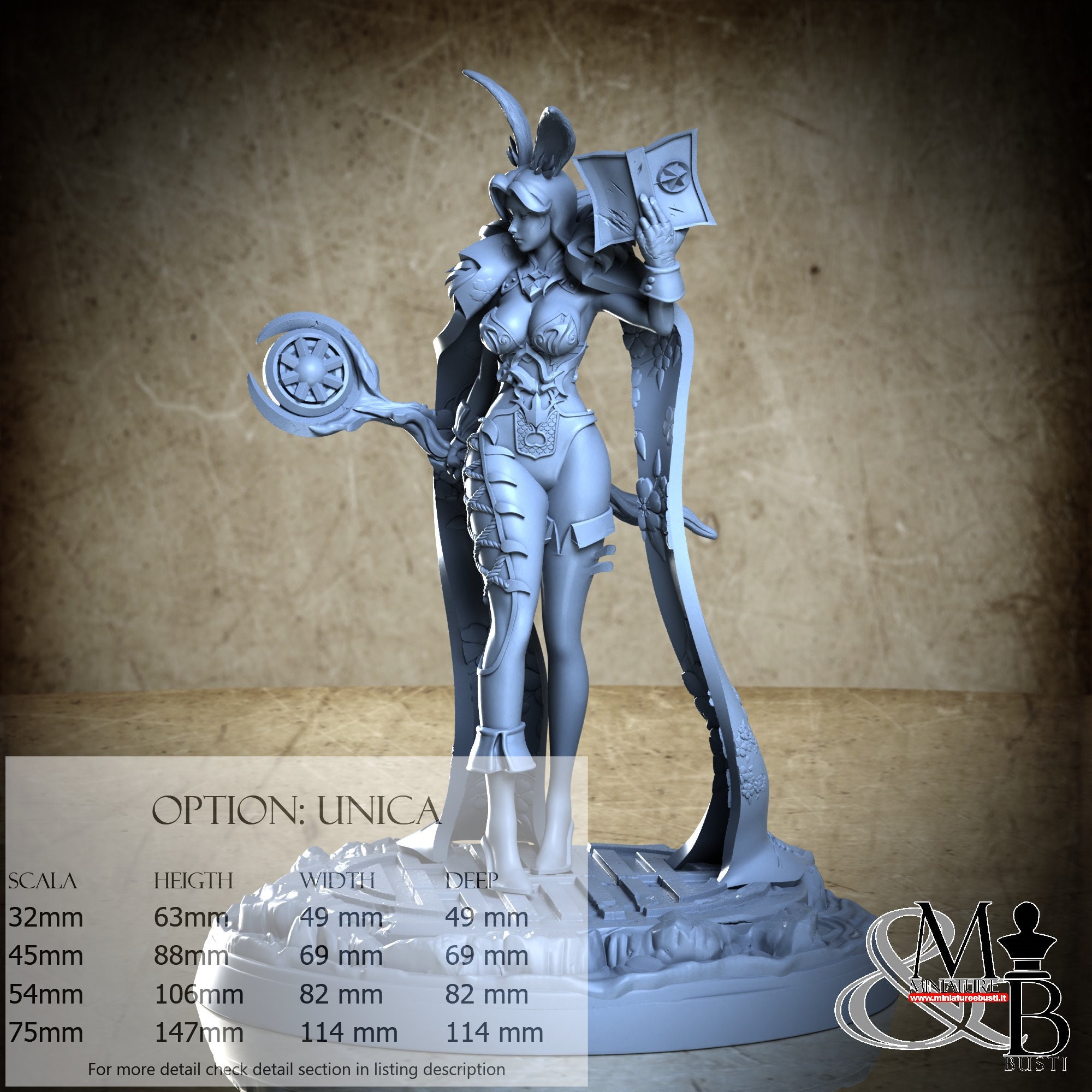 - Figure (1 piece) in Resin: Height: 96 mm, Width: 50 mm, Depth: 62 mm