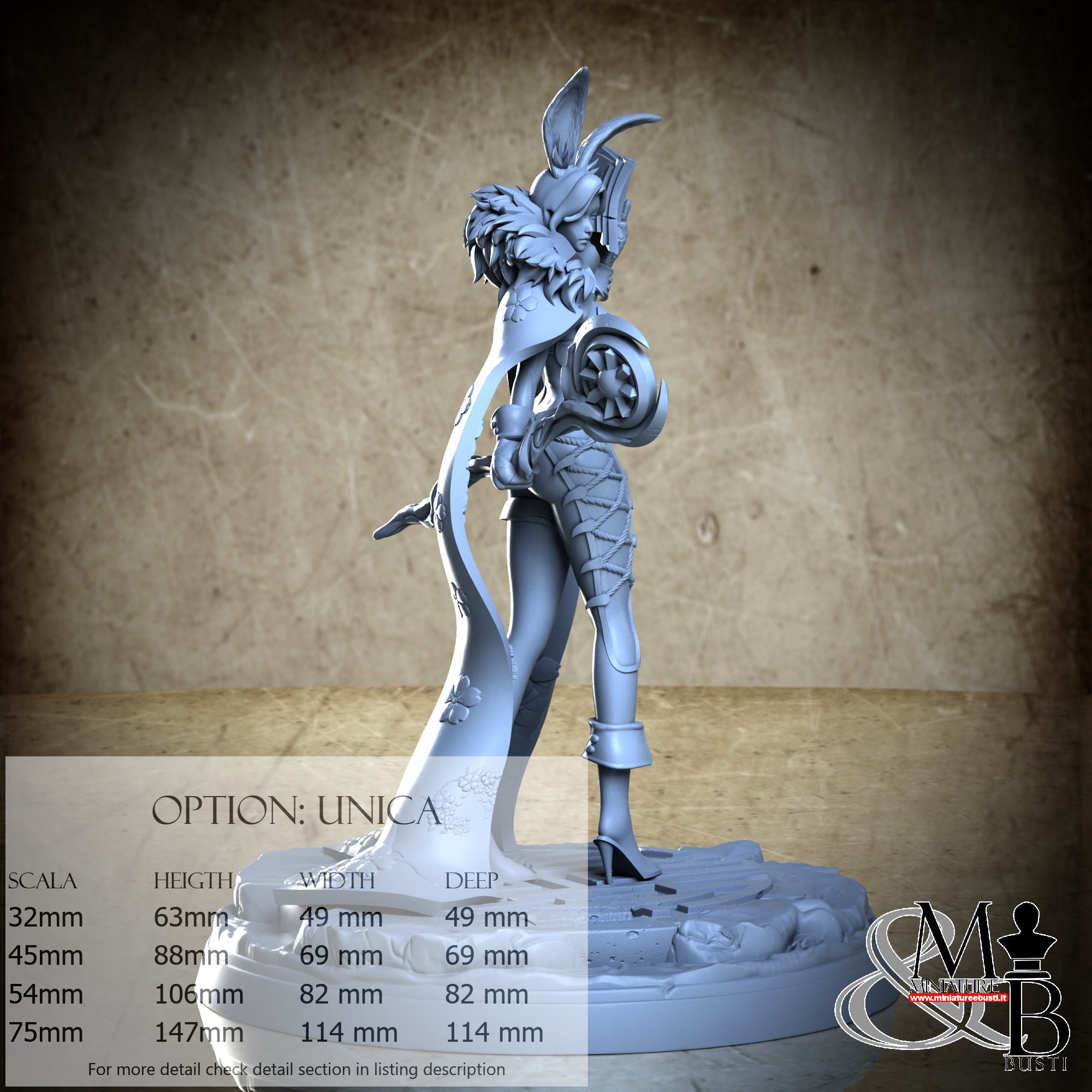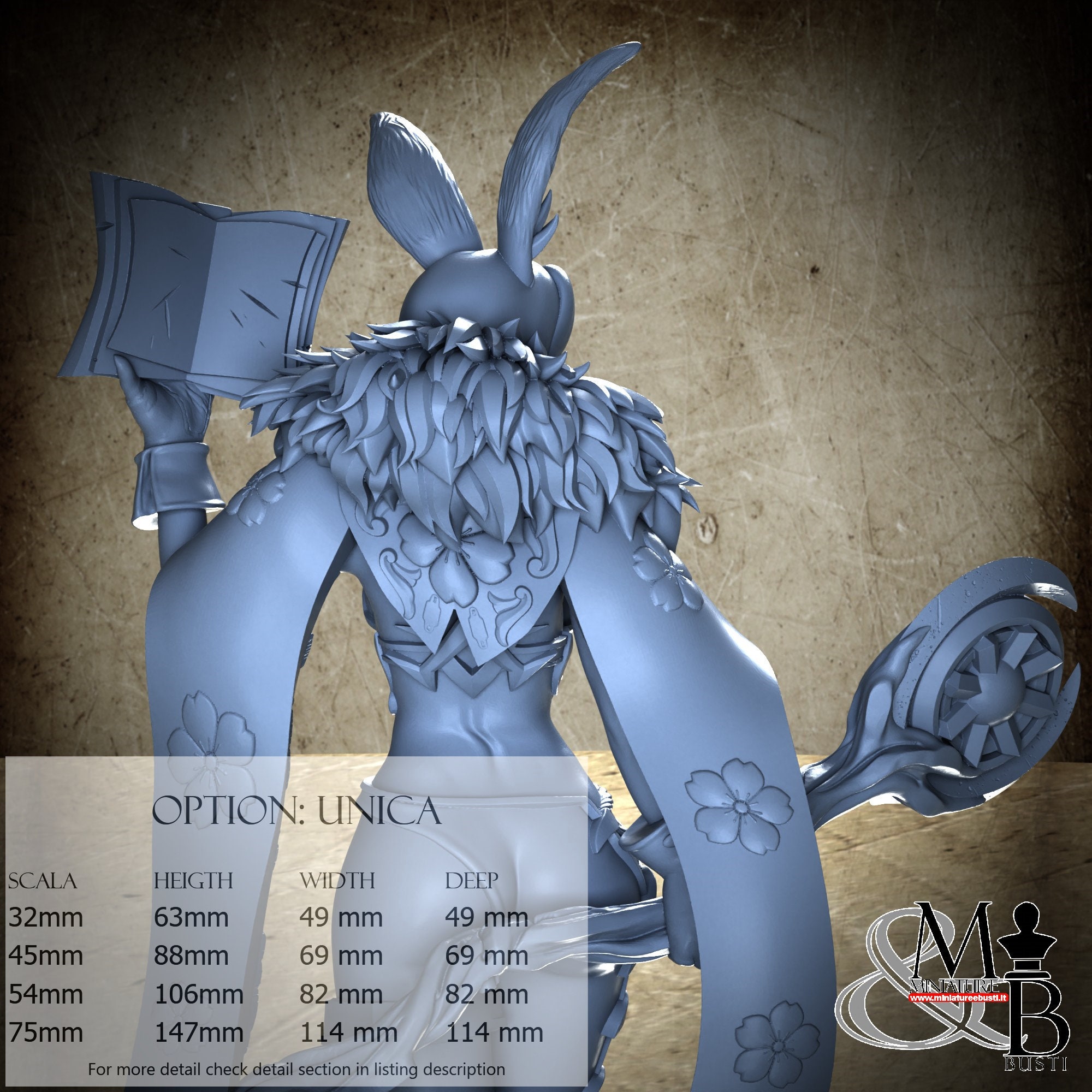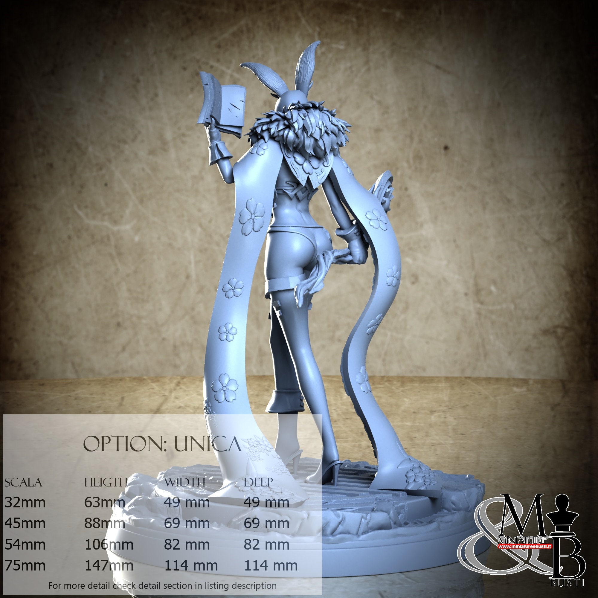 - Figure (1 piece) in Resin: Height: 57 mm, Width: 30 mm, Depth: 37 mm