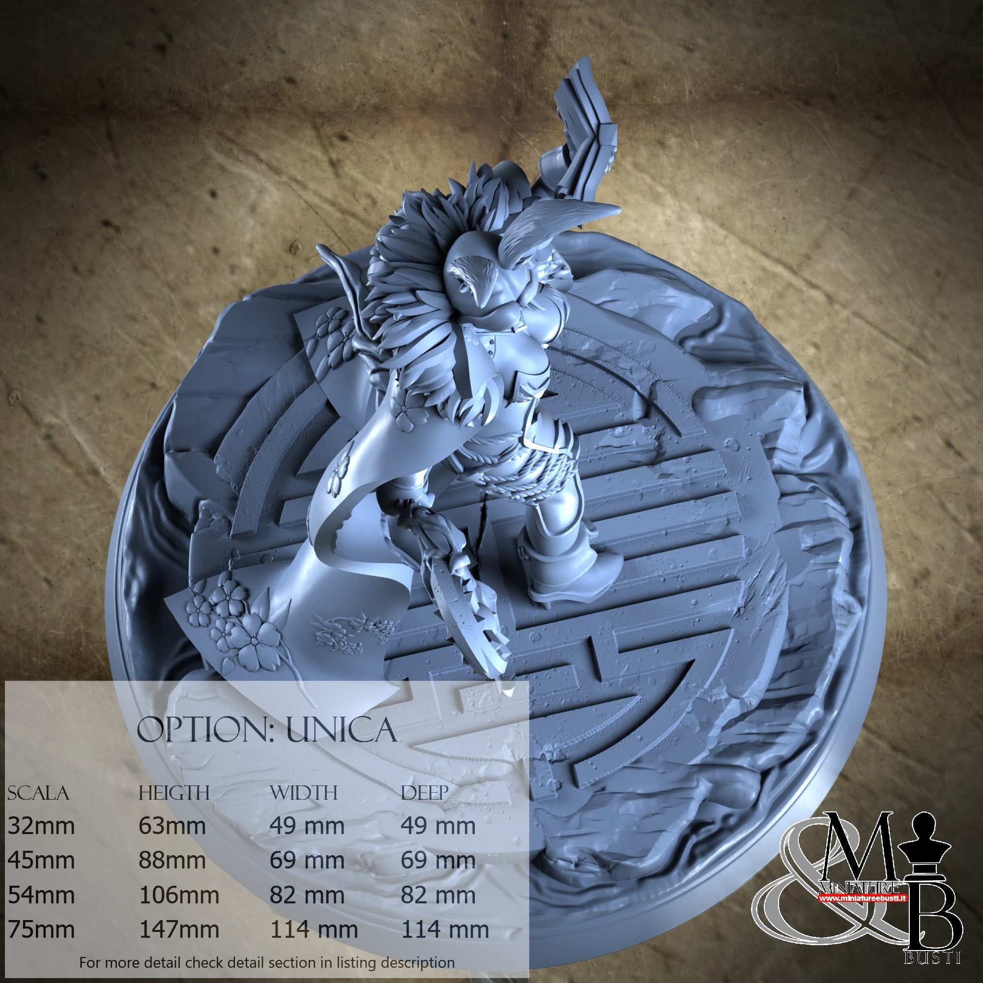 - Base (1 piece) in Resin: Height: 11 mm, Width: 82 mm, Depth: 82 mm