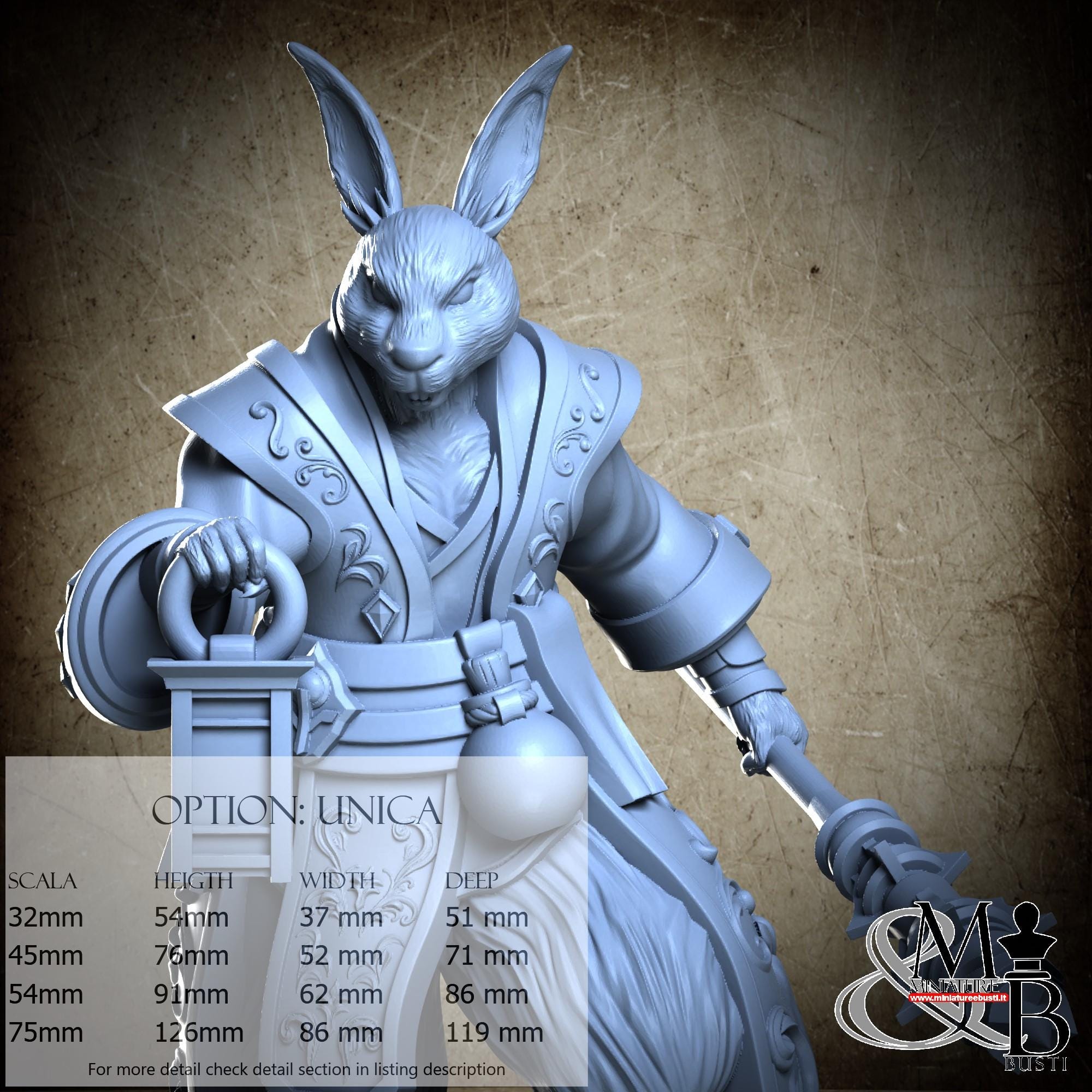 - Figure (1 piece) in Resin: Height: 50 mm, Width: 37 mm, Depth: 51 mm