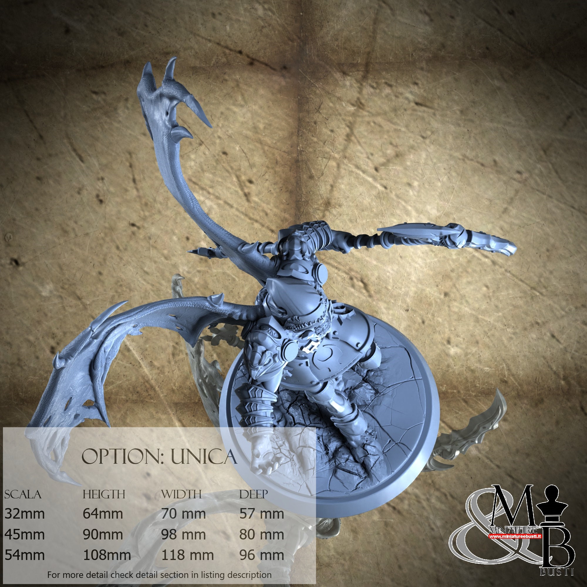 - Base (1 piece) in Resin: Height: 32 mm, Width: 52 mm, Depth: 52 mm