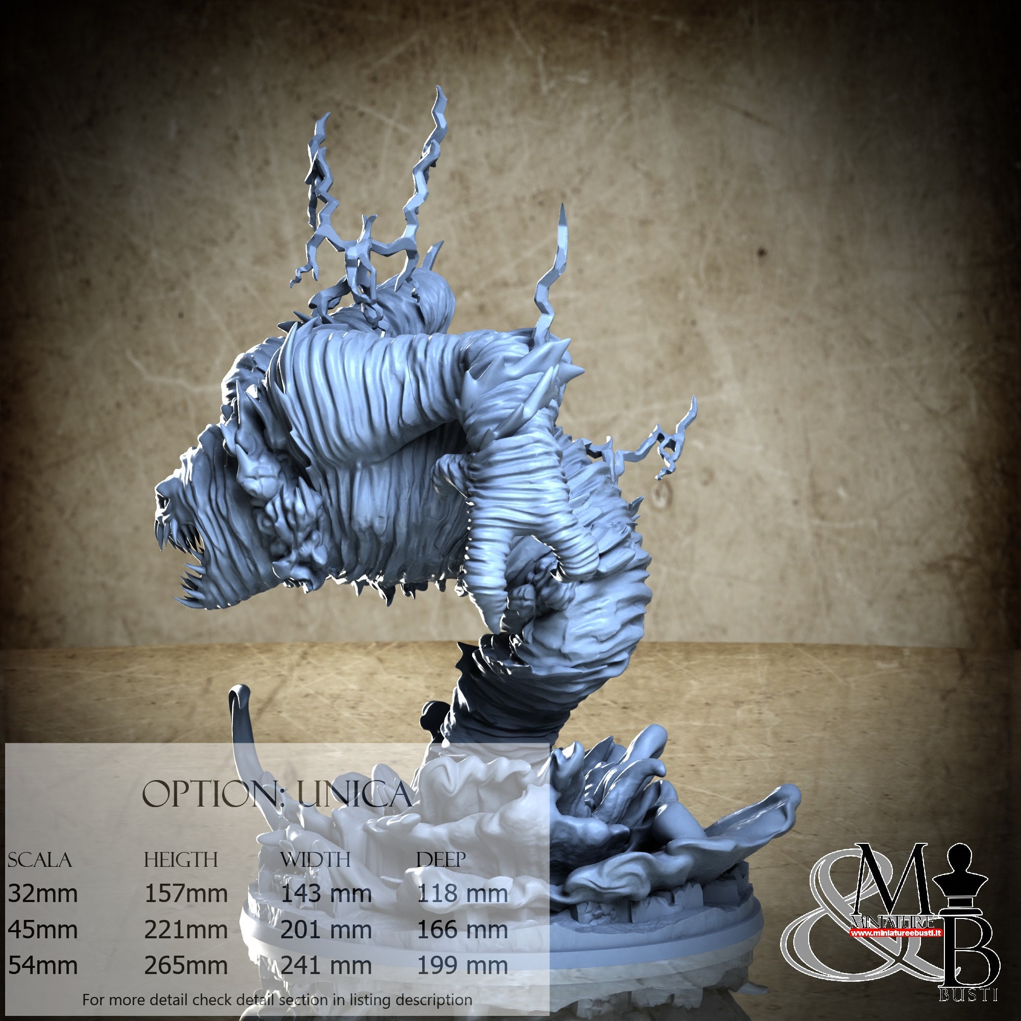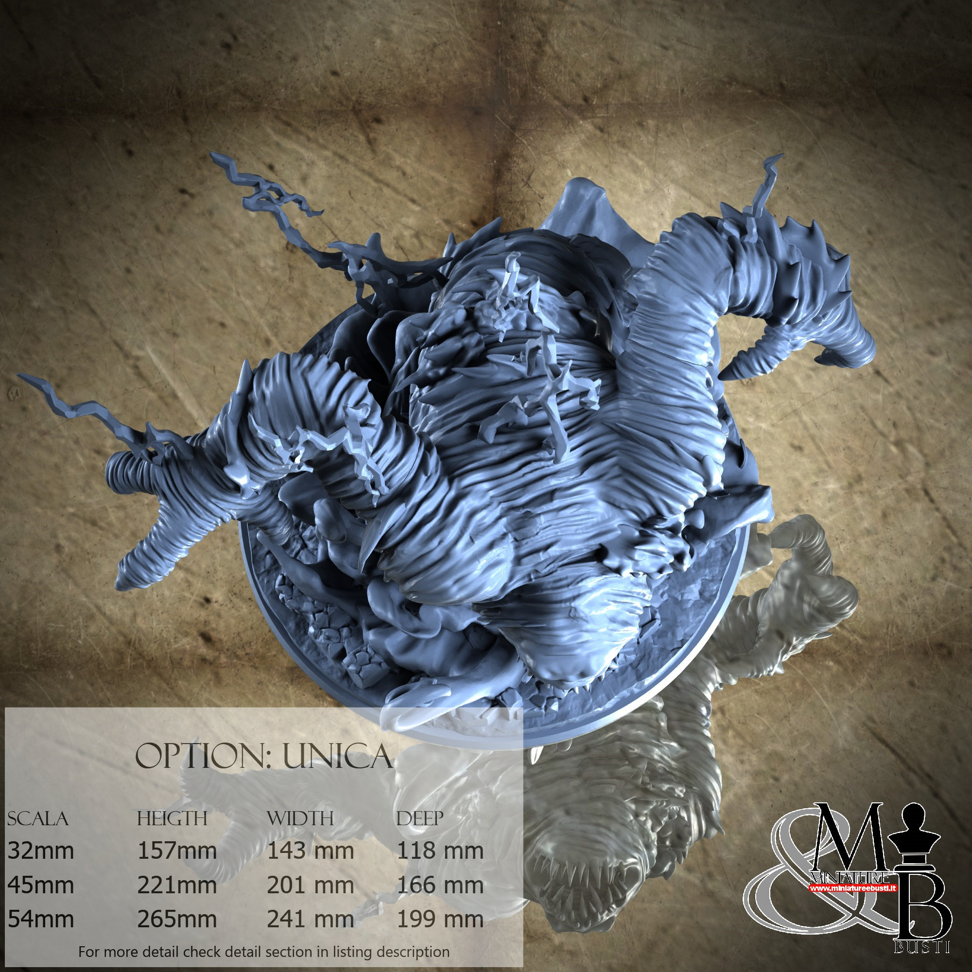 - Base (1 piece) in Resin: Height: 59 mm, Width: 146 mm, Depth: 143 mm