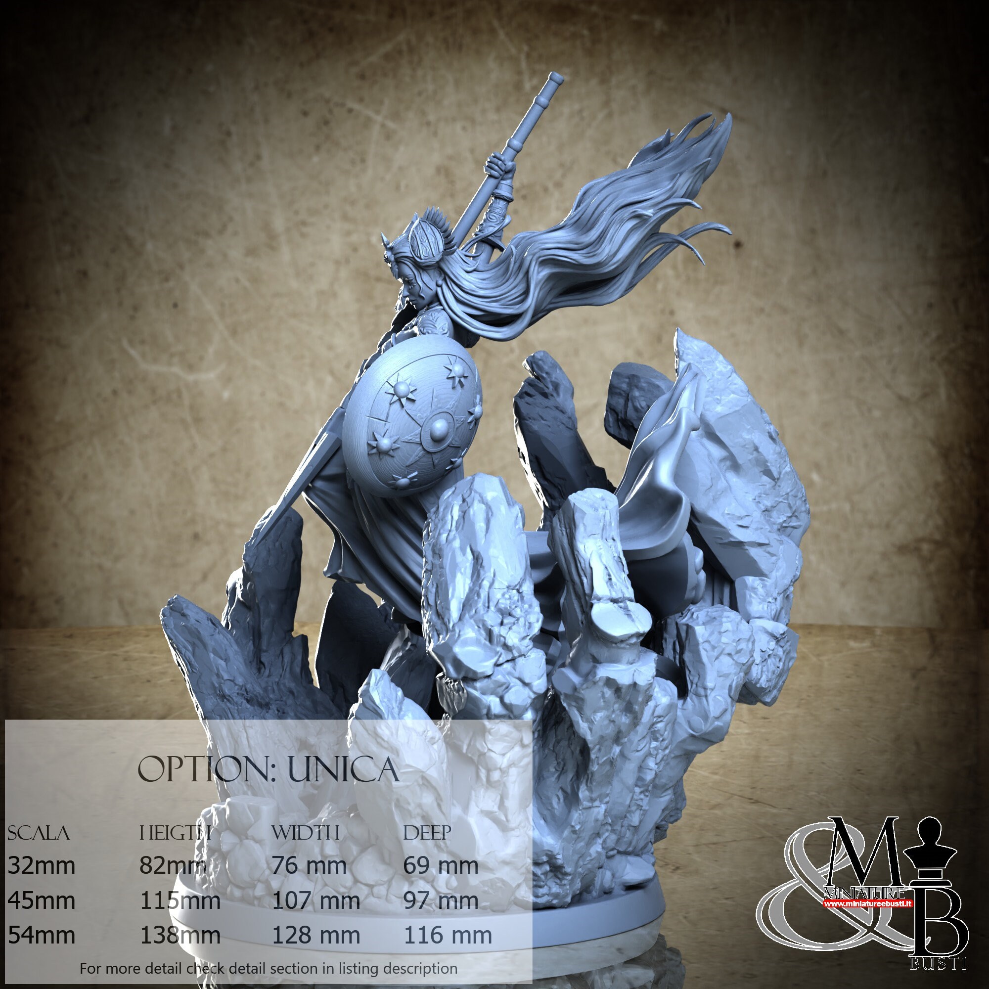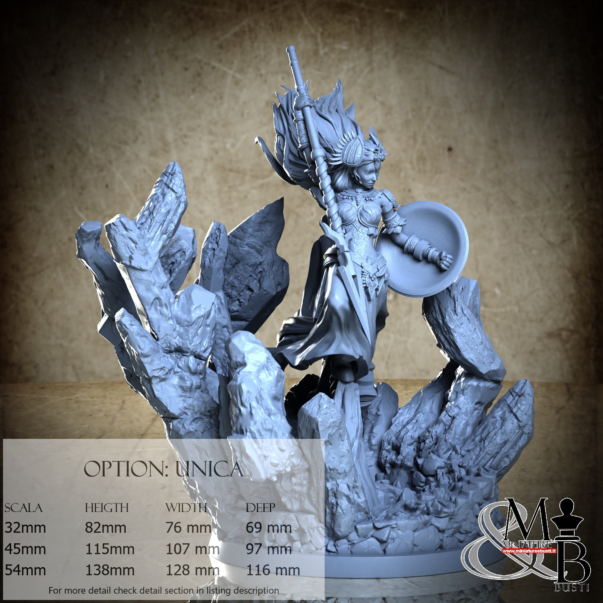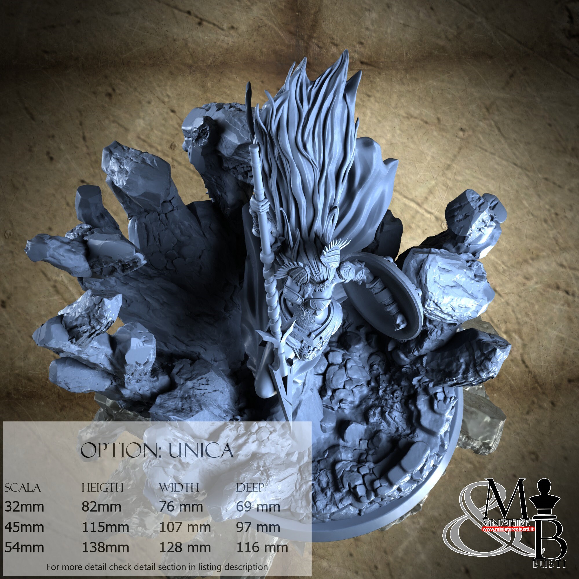- Base (1 piece) in Resin: Height: 63 mm, Width: 76 mm, Depth: 69 mm