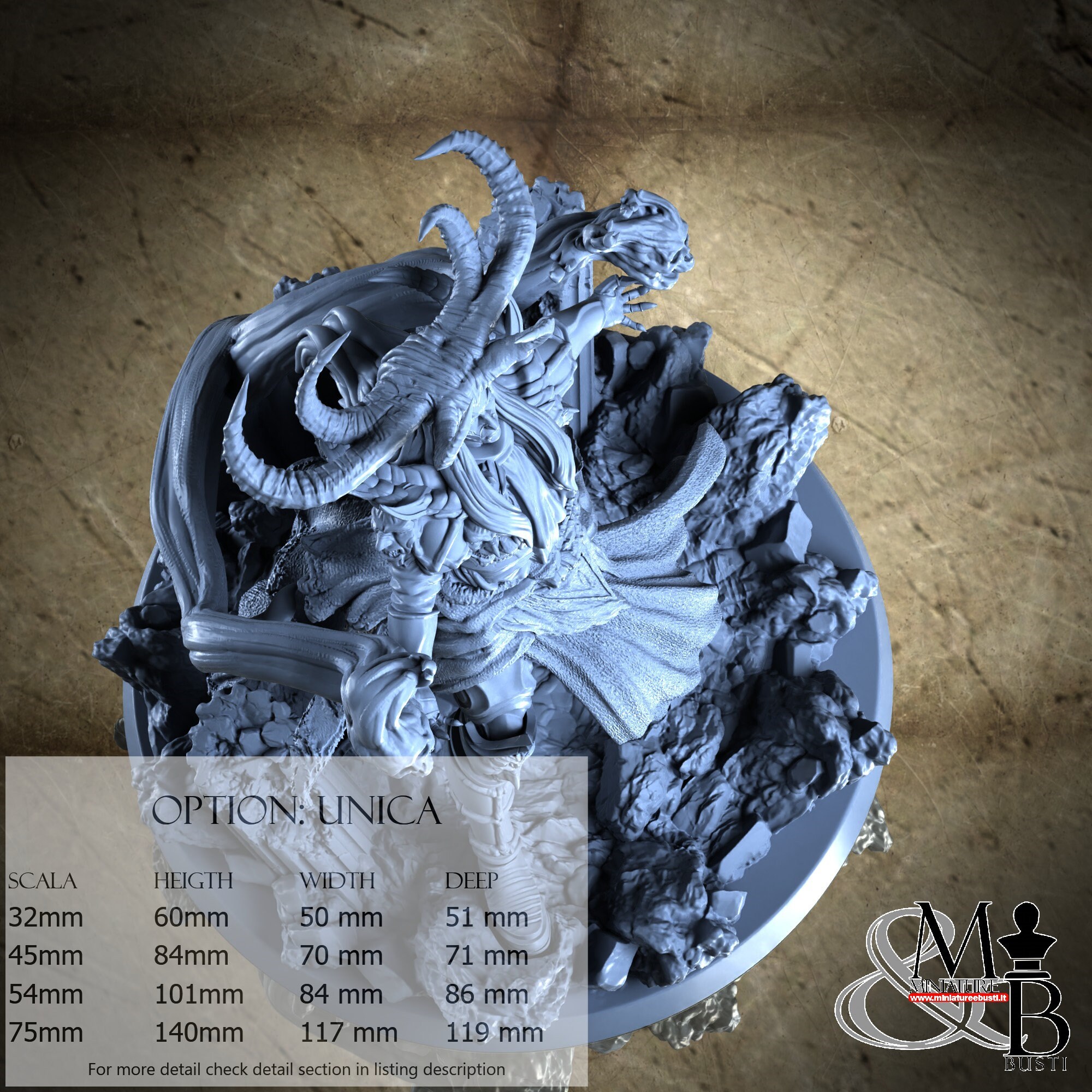 - Base (1 piece) in Resin: Height: 31 mm, Width: 70 mm, Depth: 71 mm