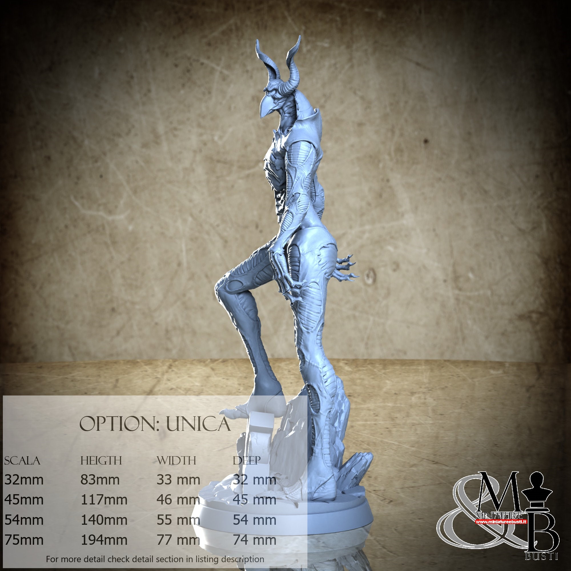 - Figure (1 piece) in Resin: Height: 78 mm, Width: 27 mm, Depth: 24 mm