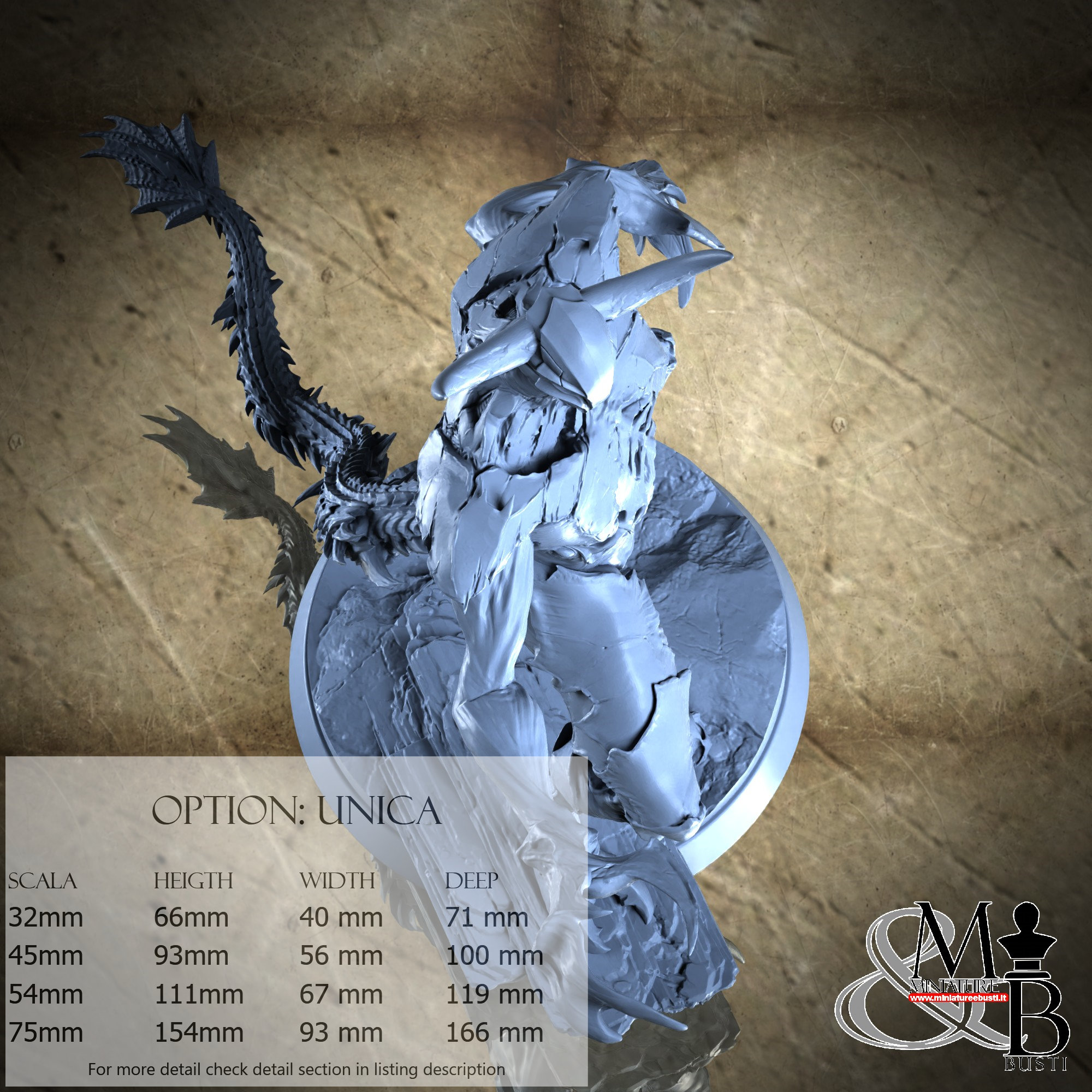 - Base (1 piece) in Resin: Height: 18 mm, Width: 77 mm, Depth: 93 mm