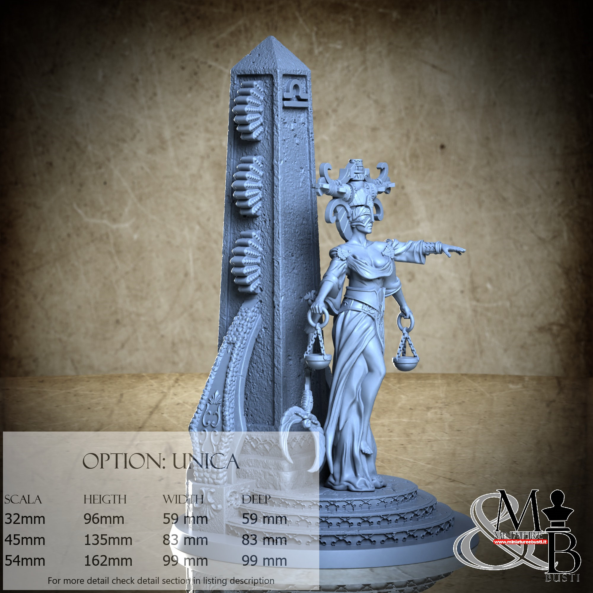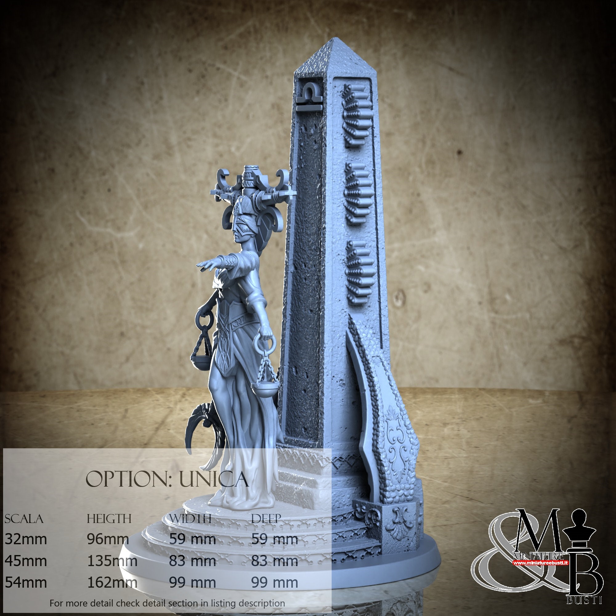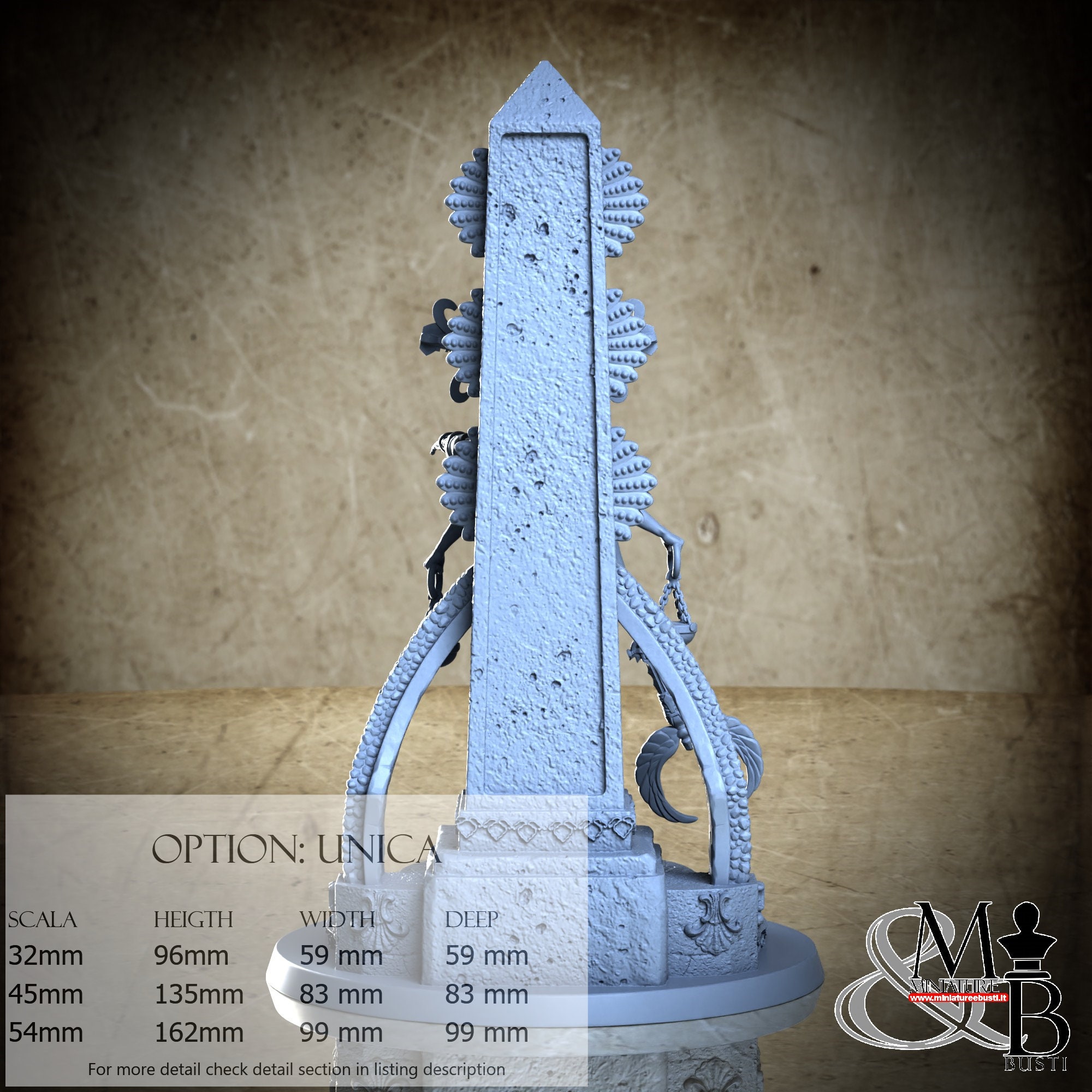 - Base (1 piece) in Resin: Height: 96 mm, Width: 59 mm, Depth: 59 mm