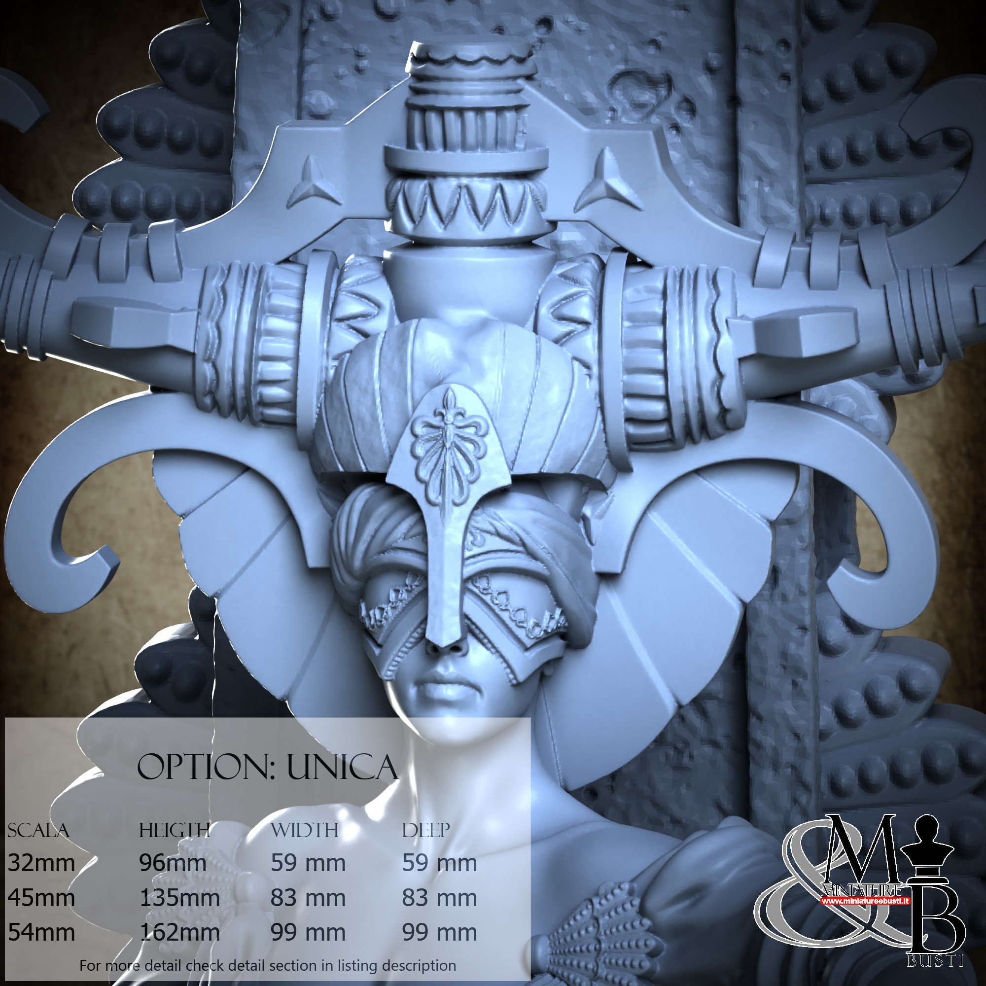 - Base (1 piece) in Resin: Height: 135 mm, Width: 83 mm, Depth: 83 mm