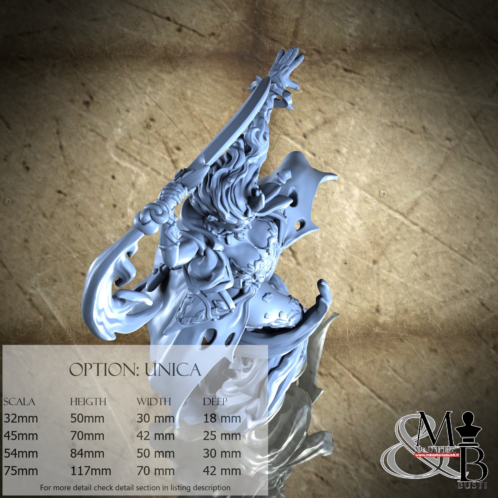 - Figure (1 piece) in Resin: Height: 77 mm, Width: 50 mm, Depth: 27 mm