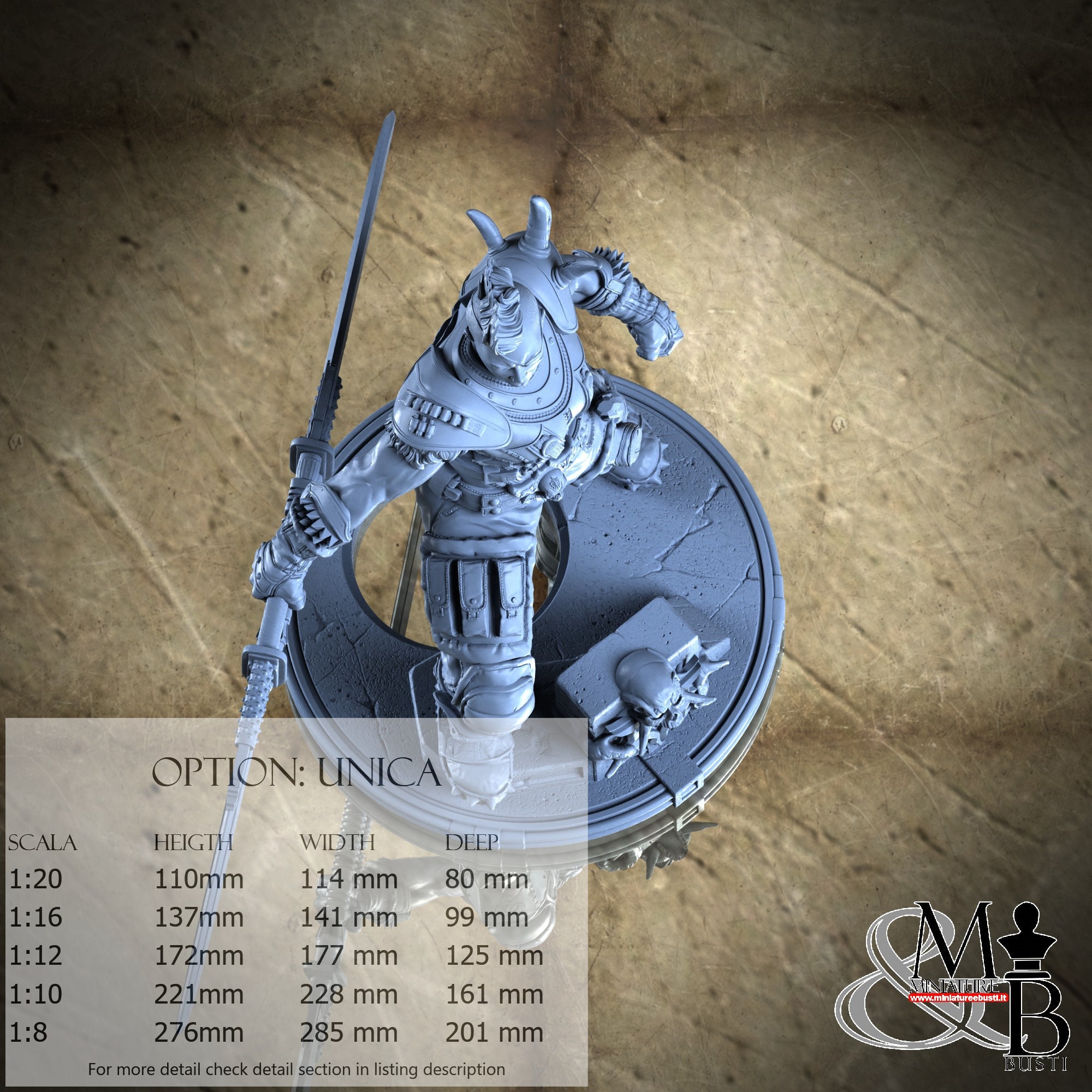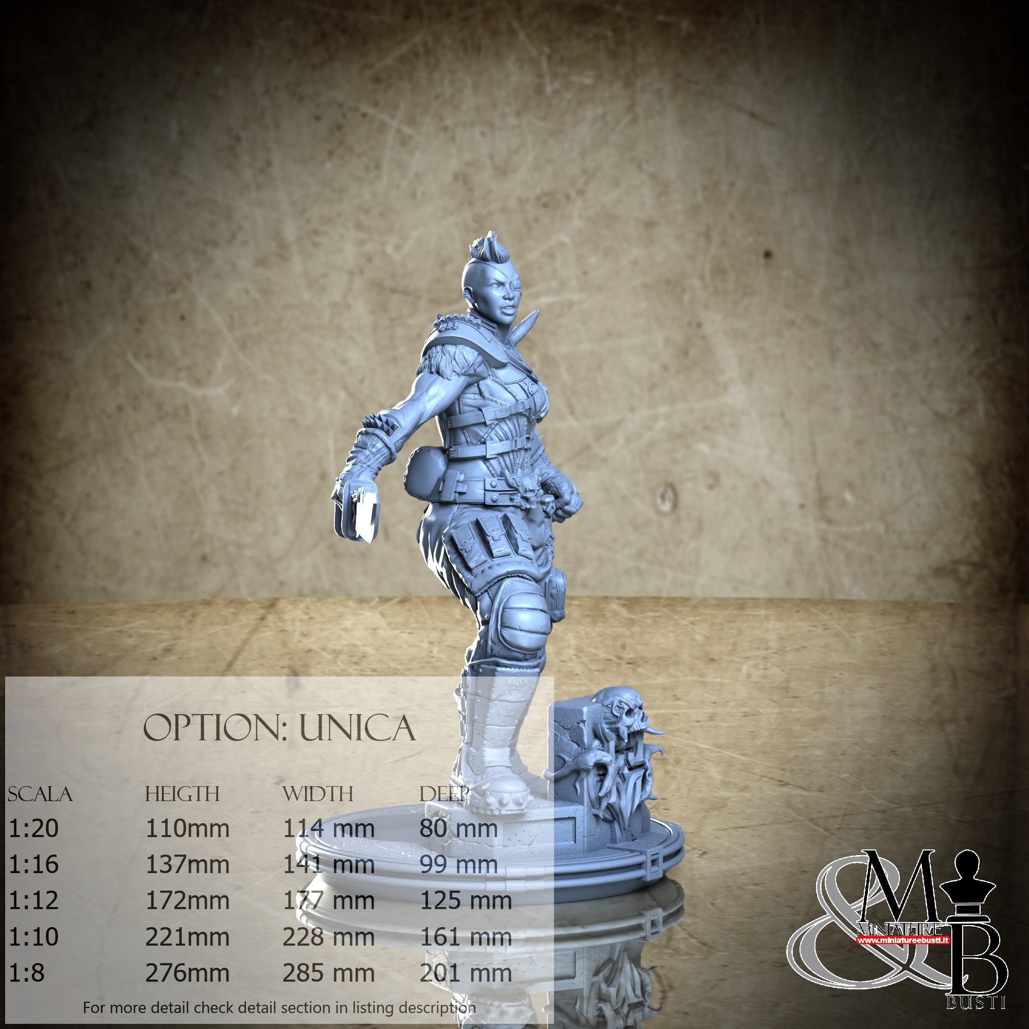 - Base (1 piece) in Resin: Height: 42 mm, Width: 82 mm, Depth: 83 mm