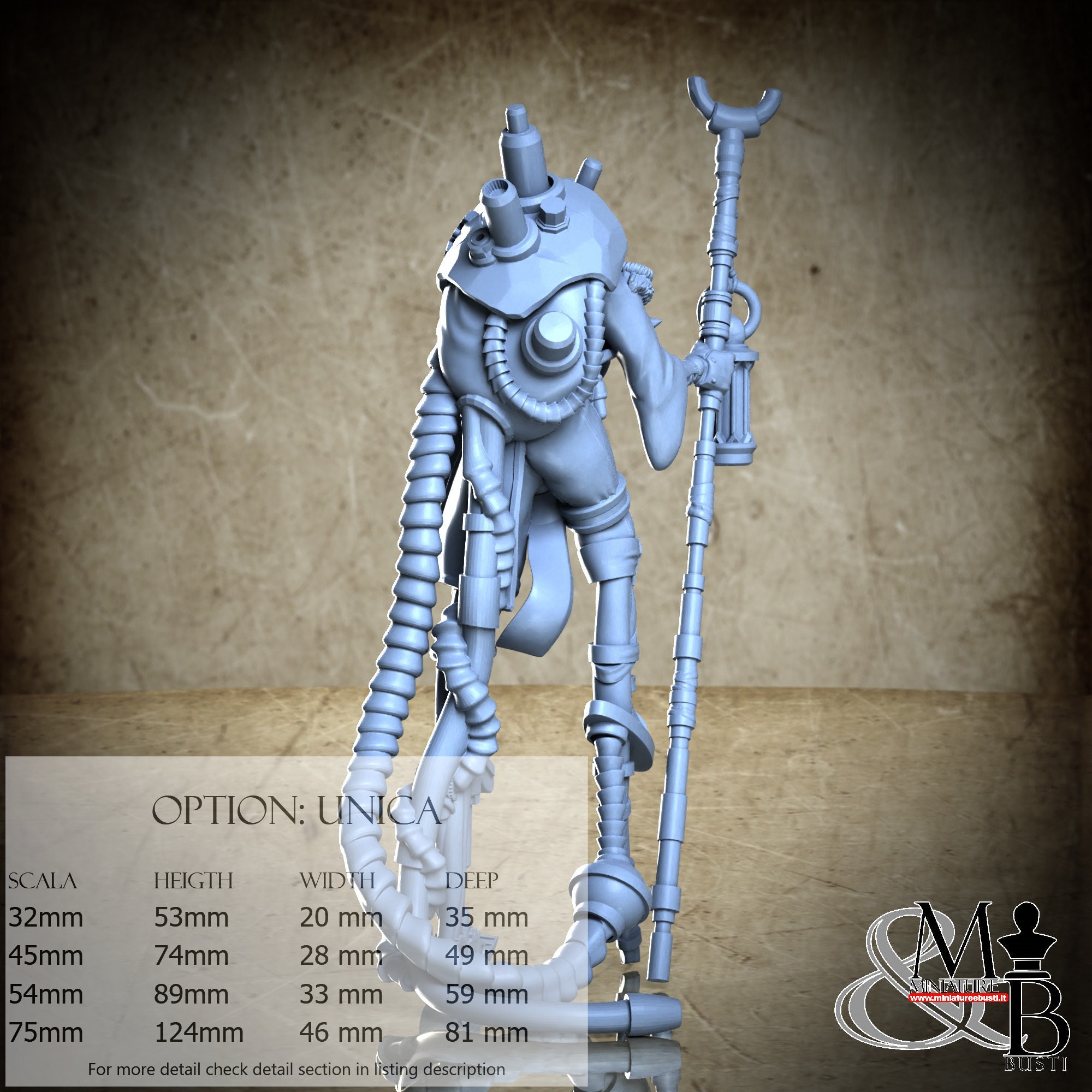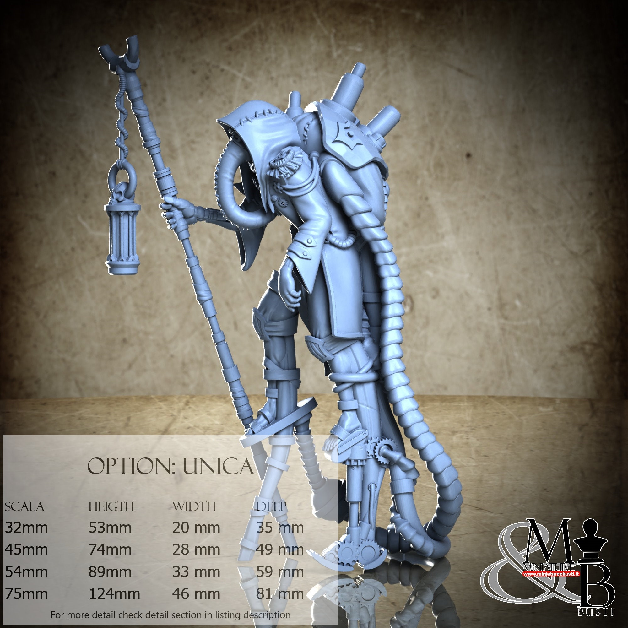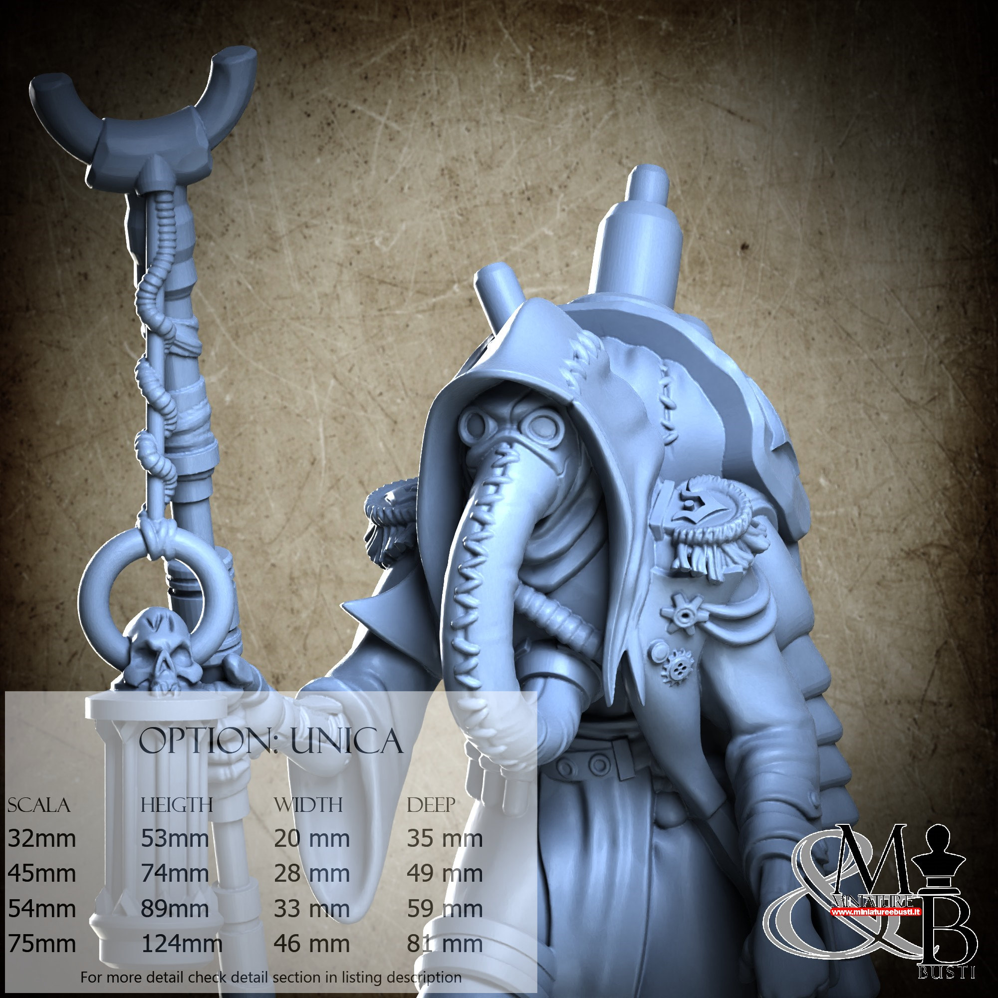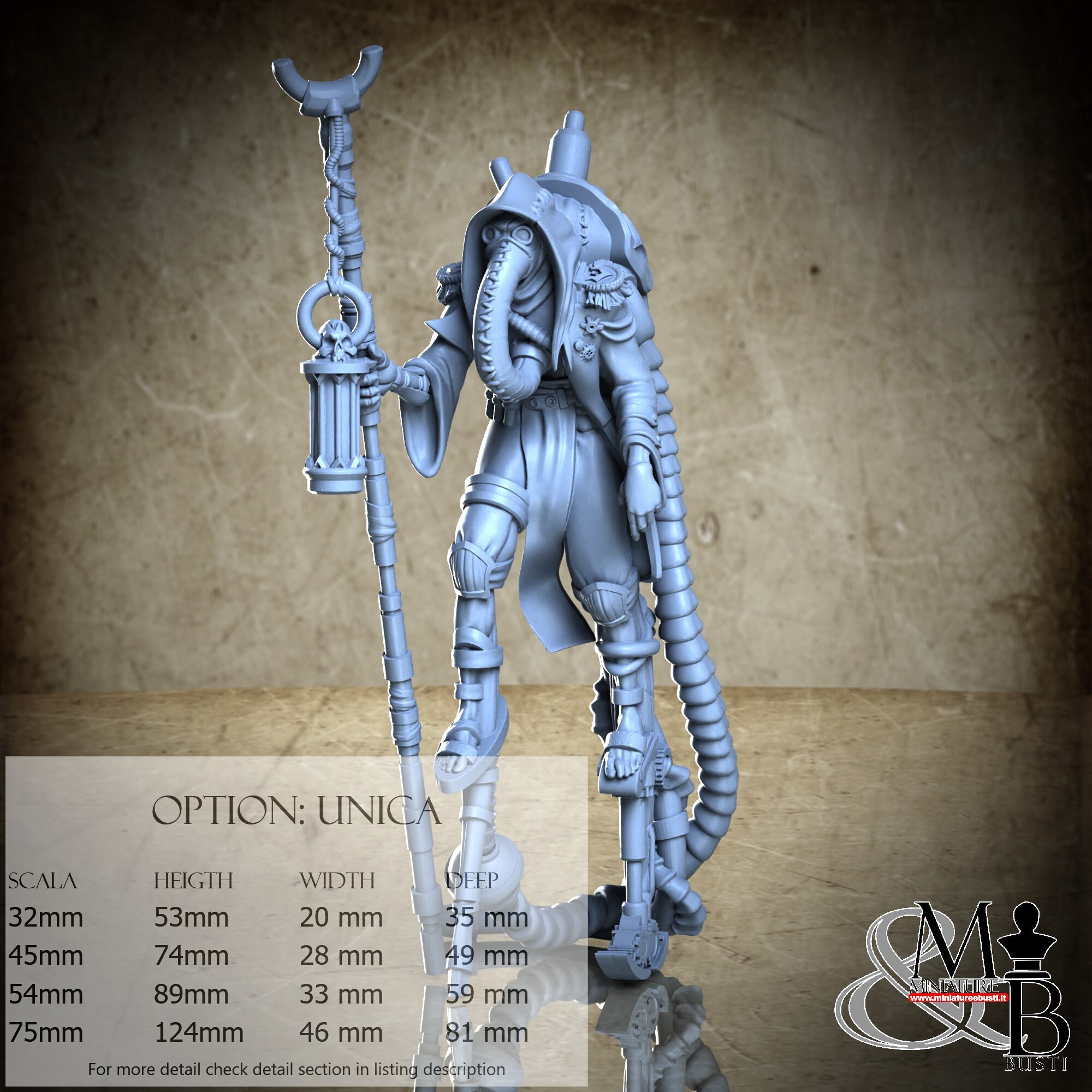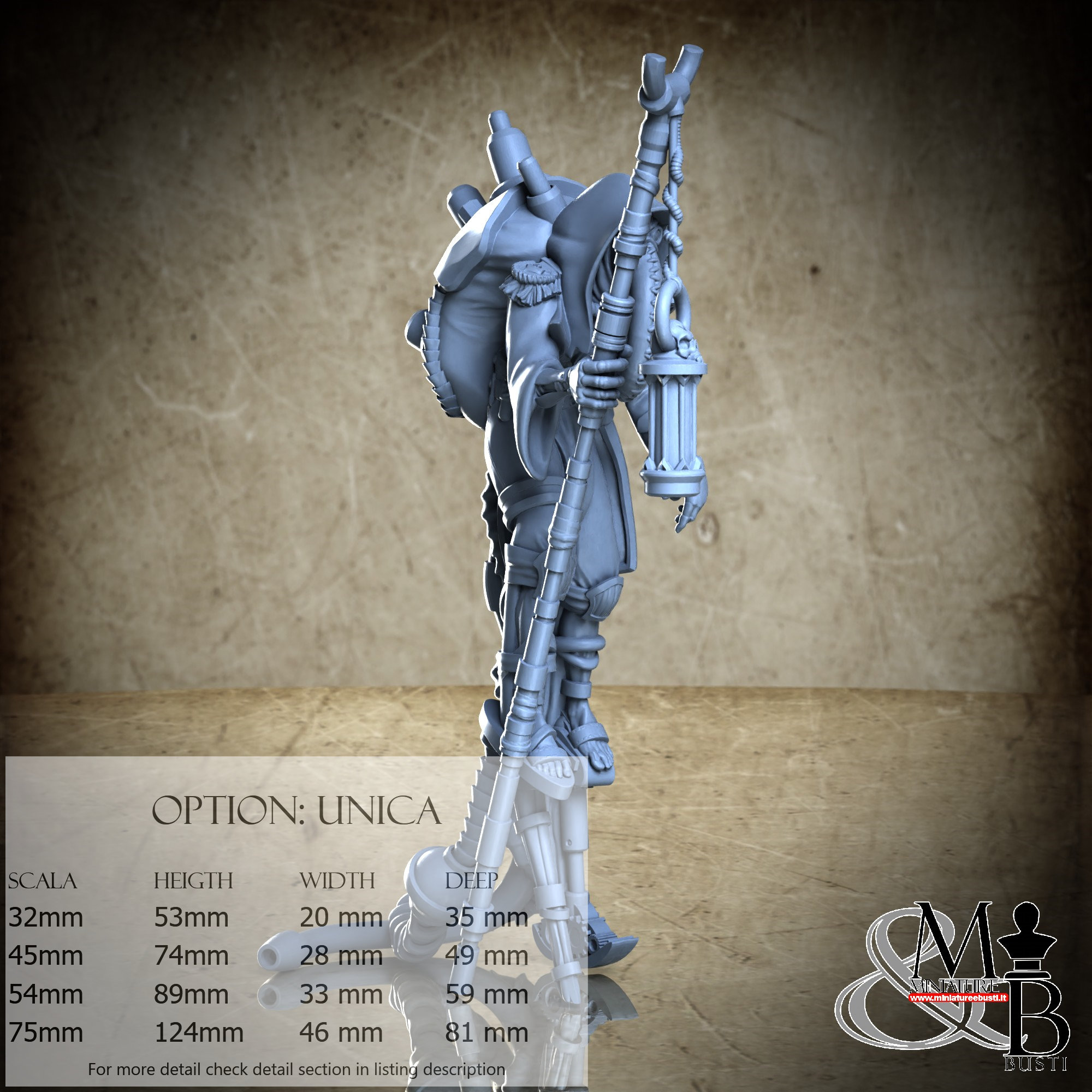 - Figure (1 piece) in Resin: Height: 74 mm, Width: 28 mm, Depth: 49 mm