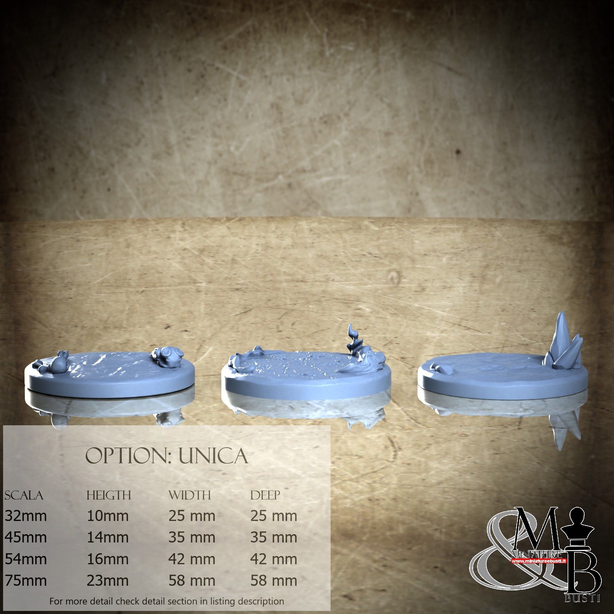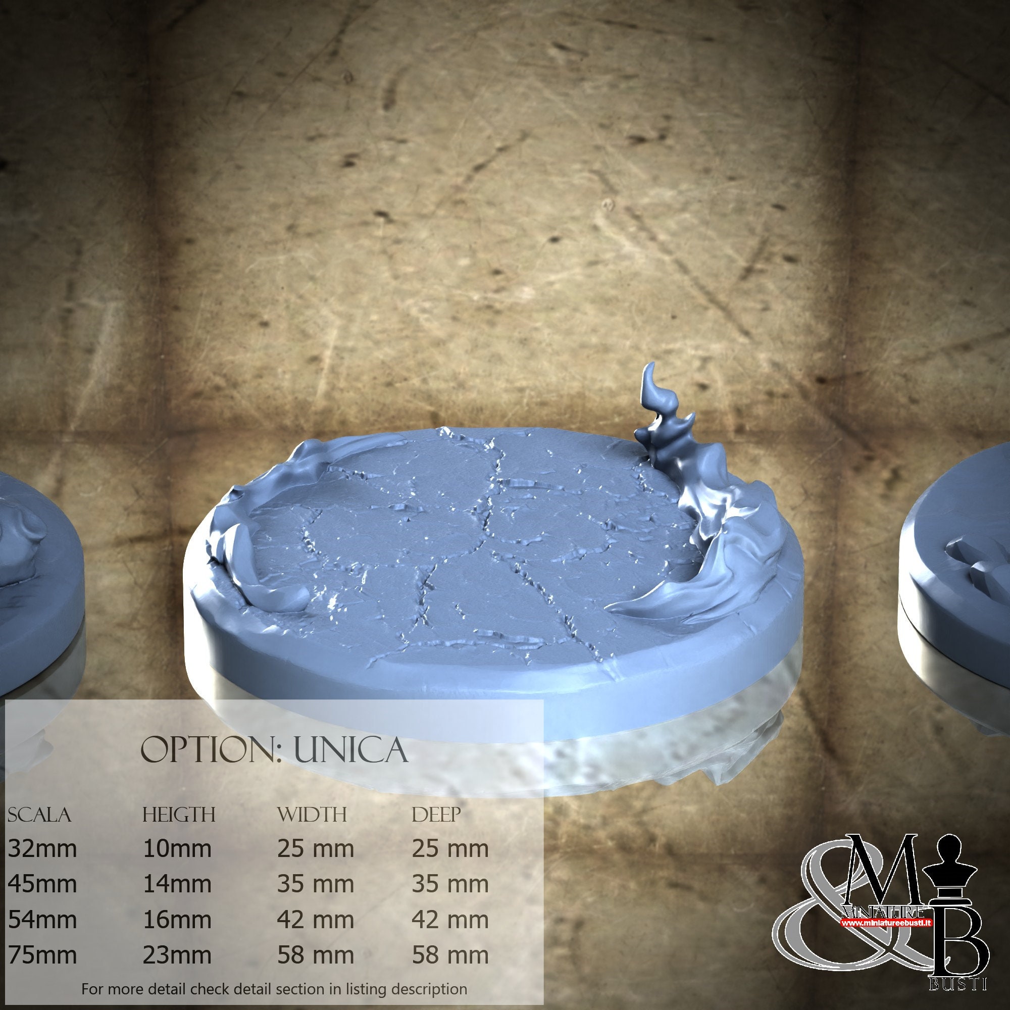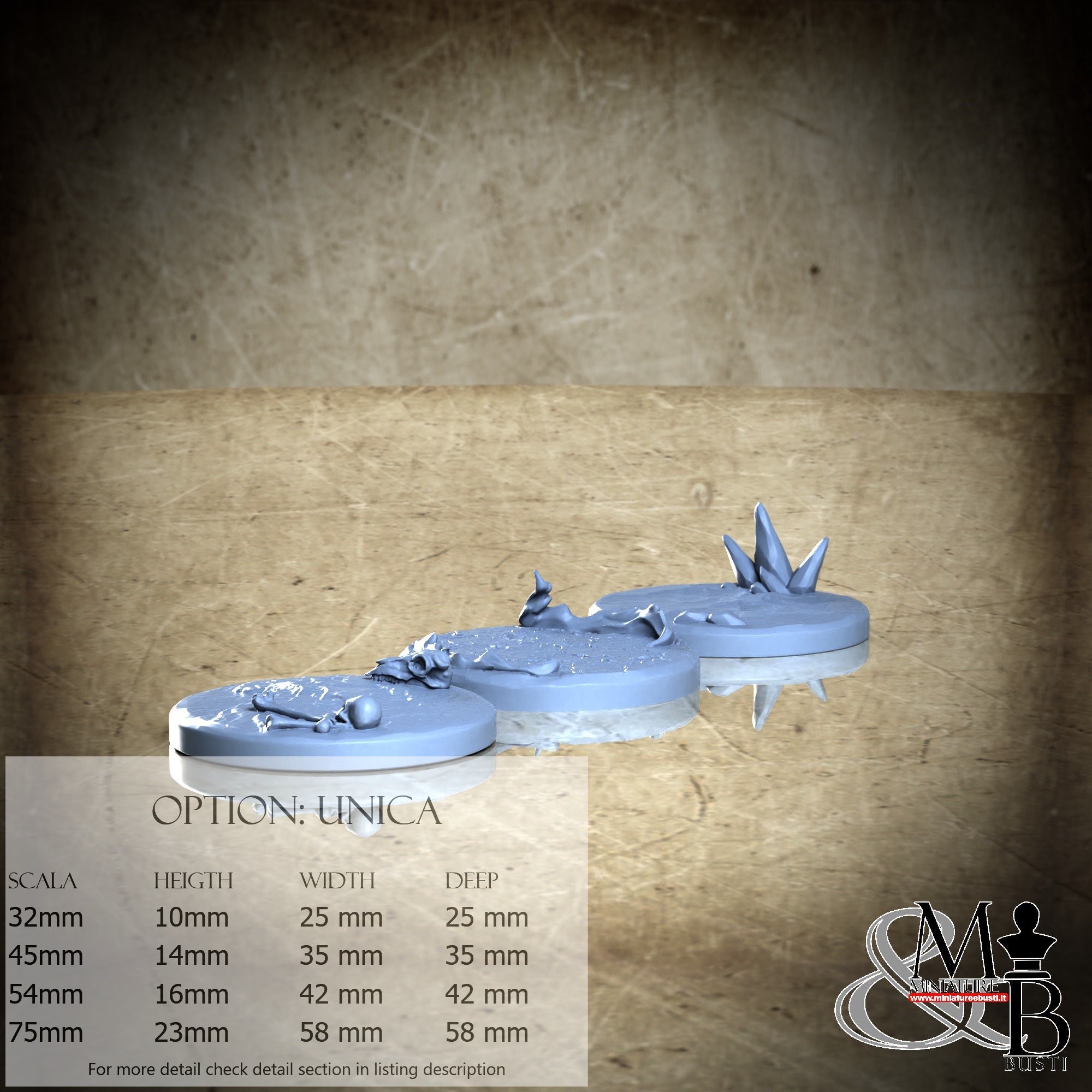 - Base (3 pieces) in Resin: Height: 14 mm, Width: 35 mm, Depth: 35 mm