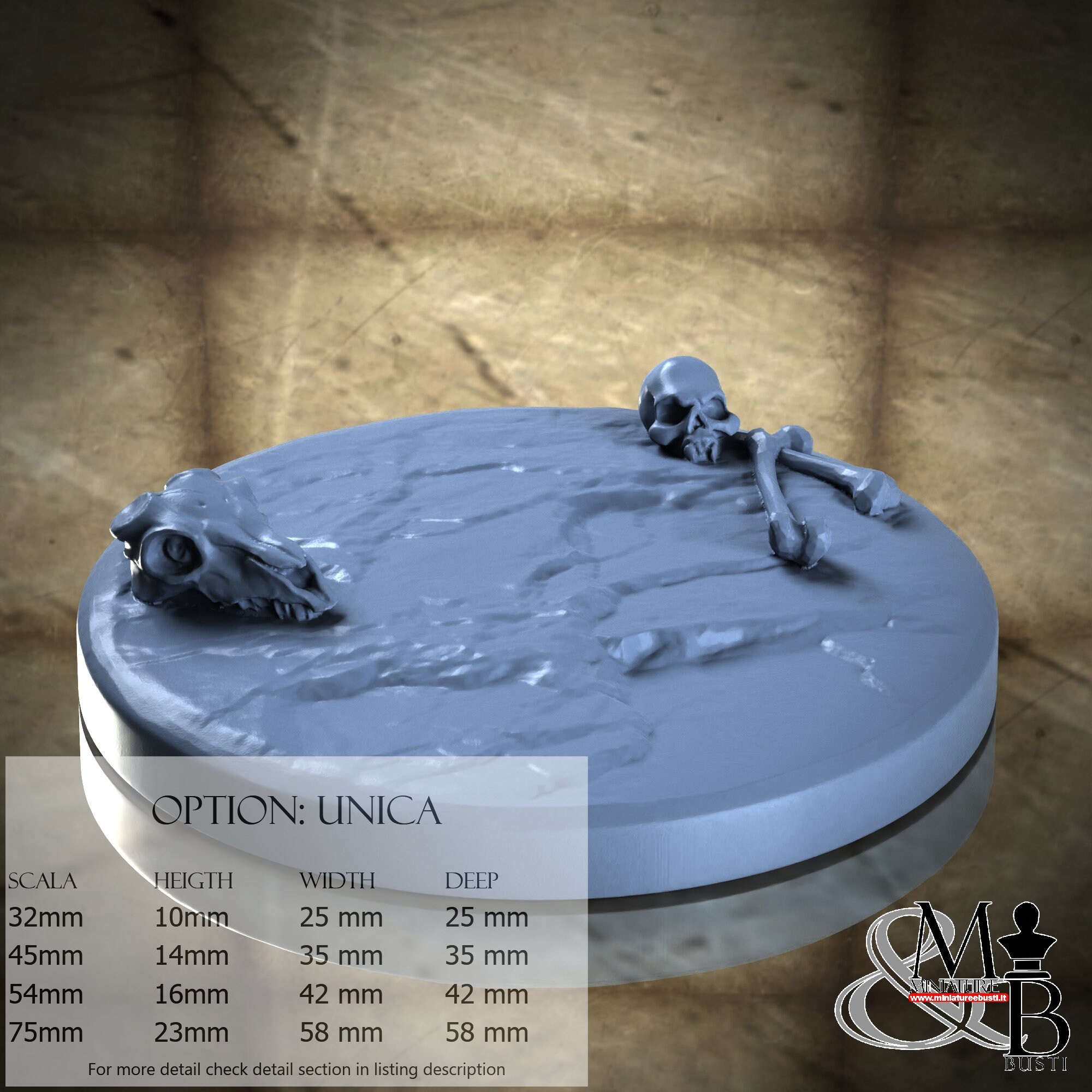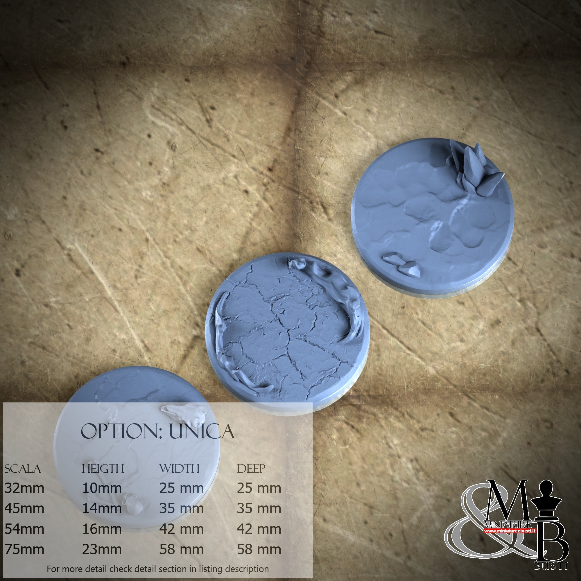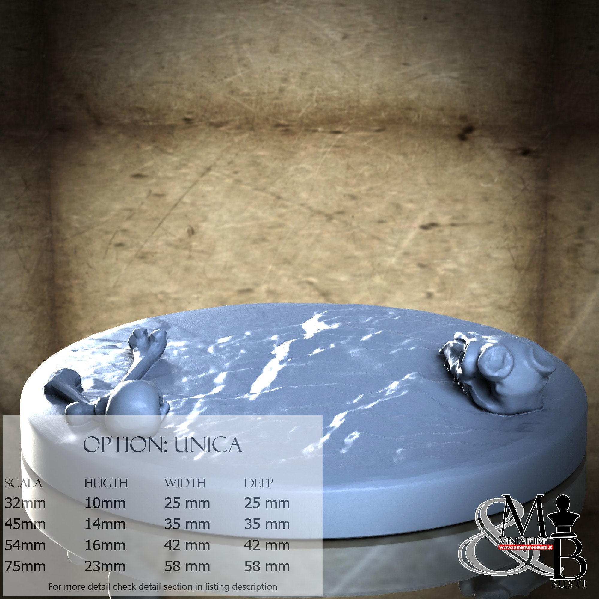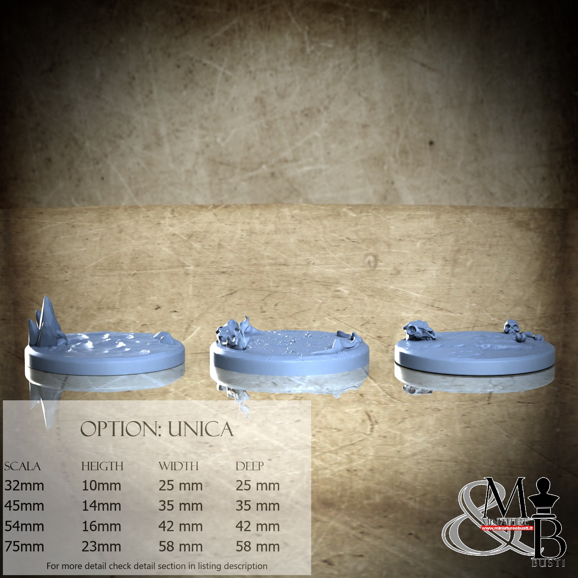- Base (3 pieces) in Resin: Height: 14 mm, Width: 35 mm, Depth: 35 mm