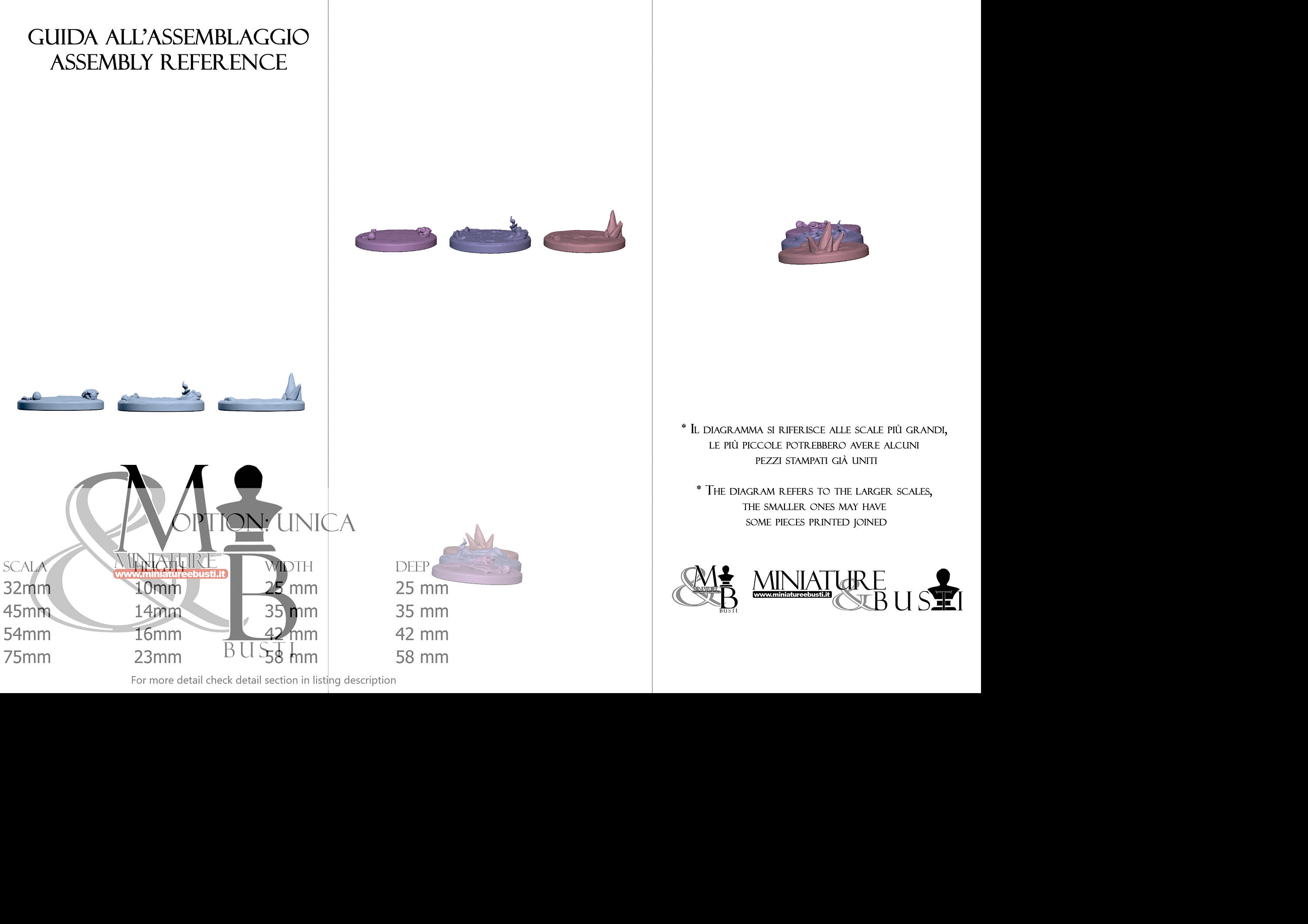 - Base (3 pieces) in Resin: Height: 10 mm, Width: 25 mm, Depth: 25 mm