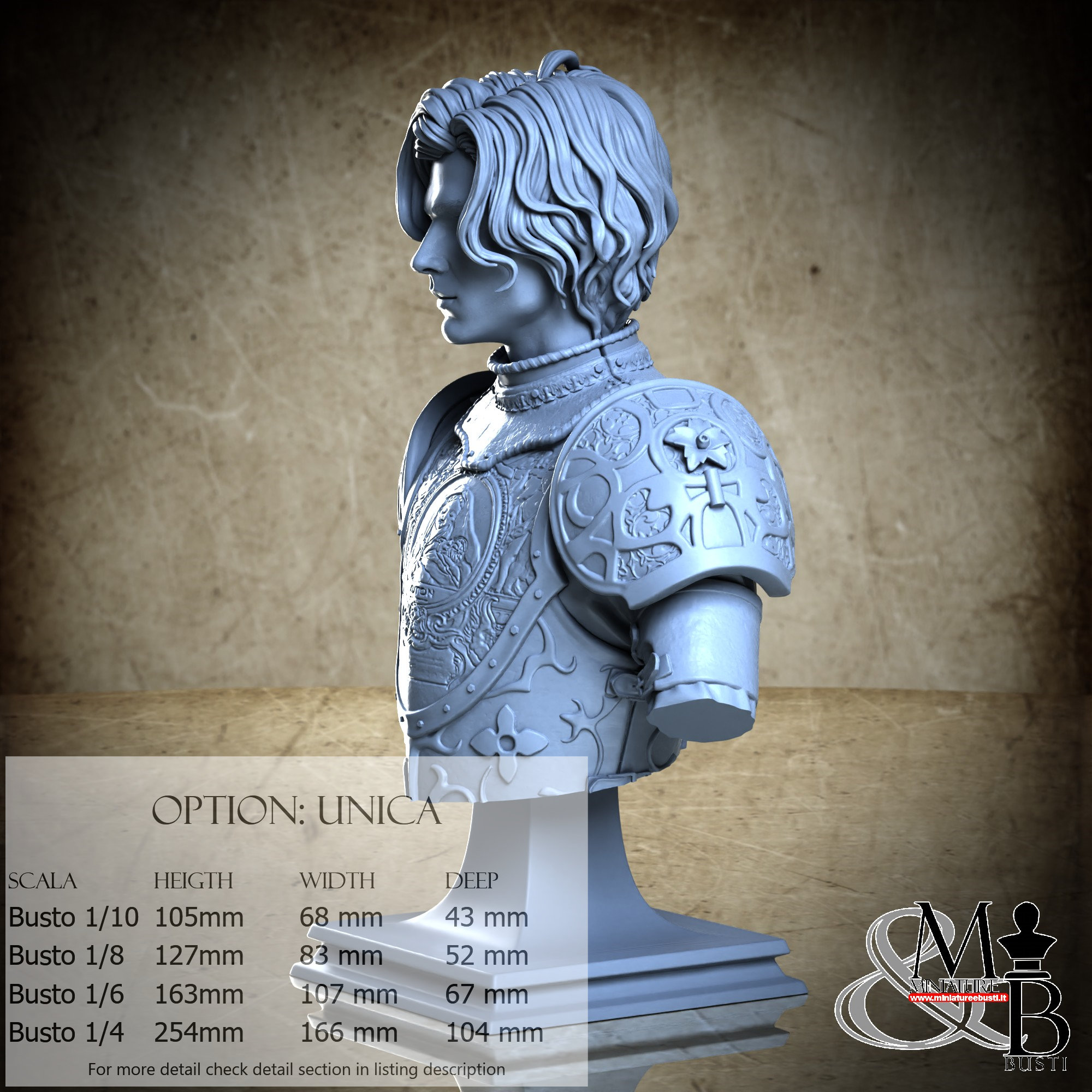 1/8 Bust Scale, cost €45.00 (Height: 127 mm, Width: 83 mm, Depth: 52 mm), composed of the following components: